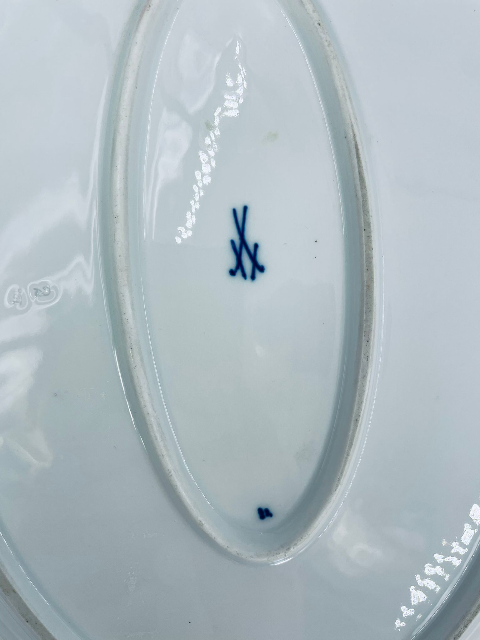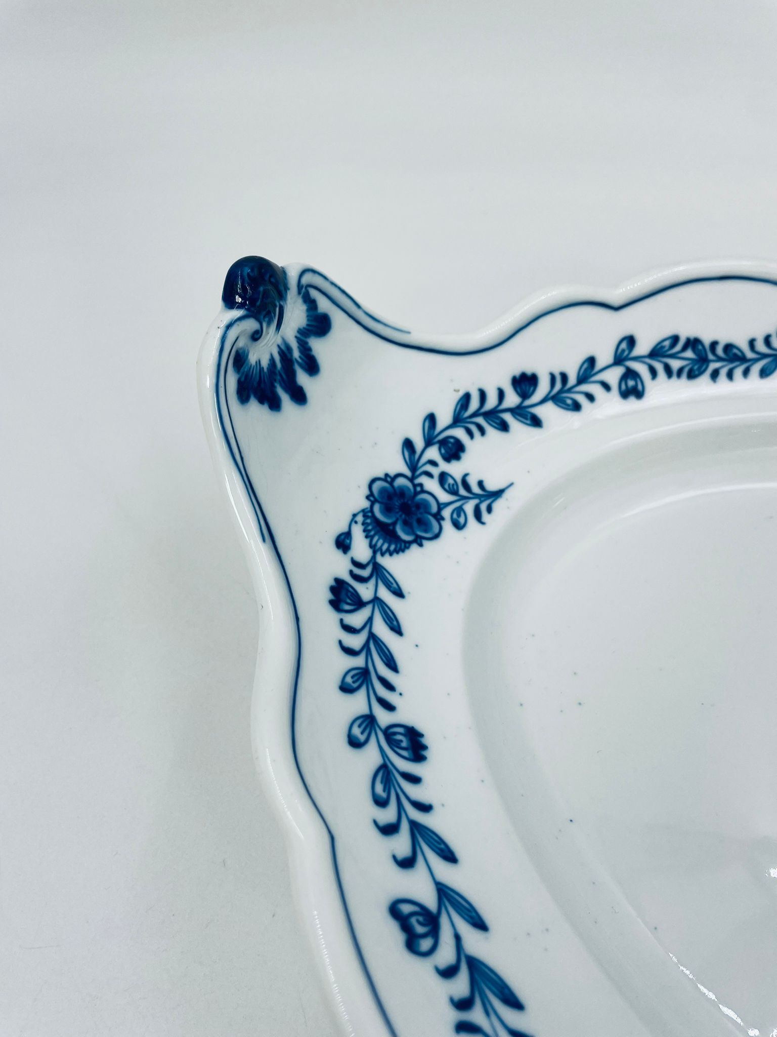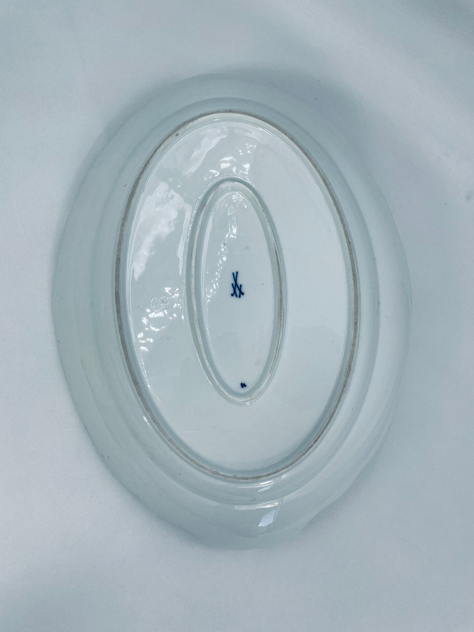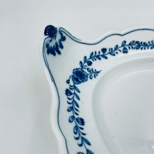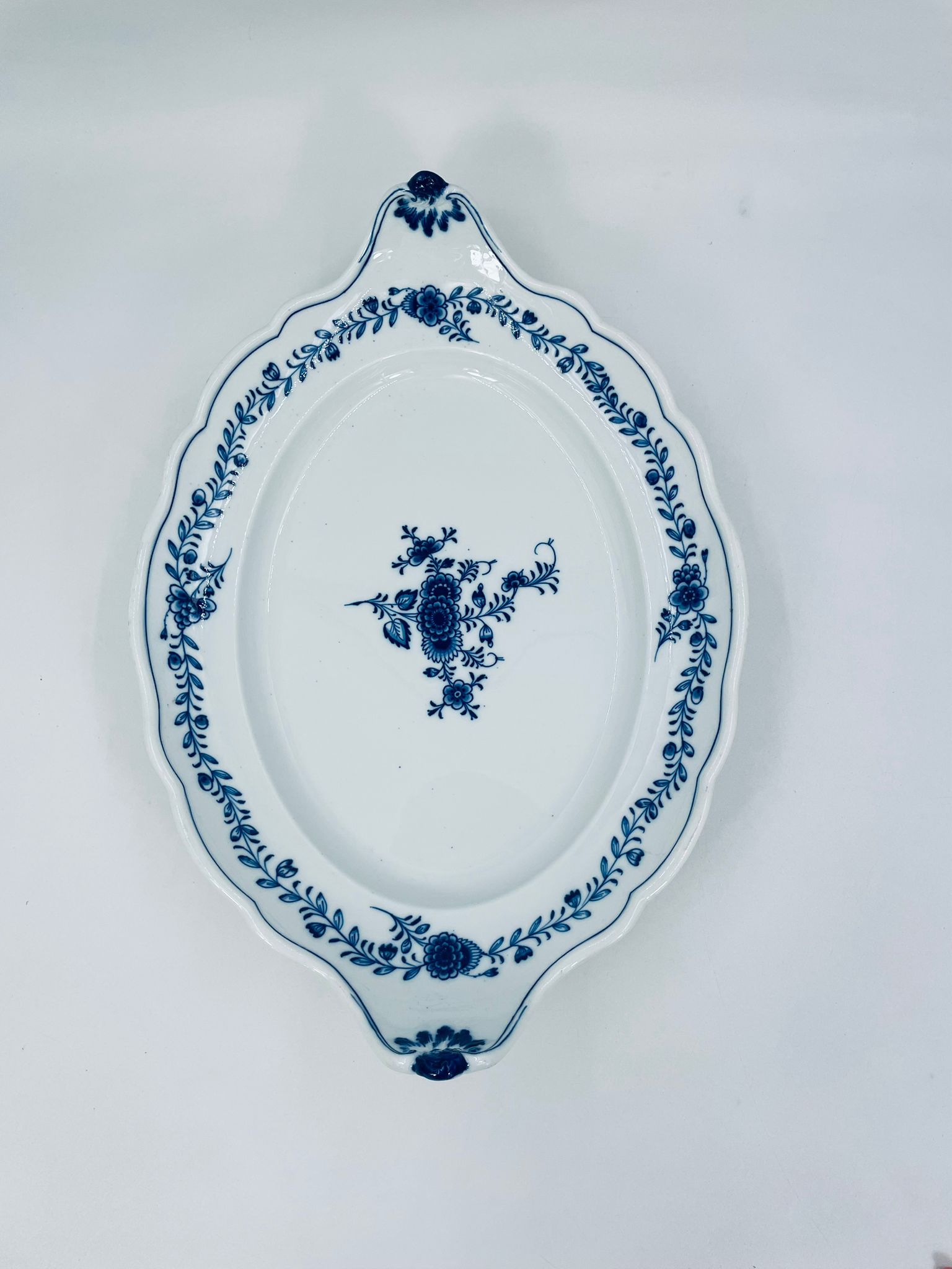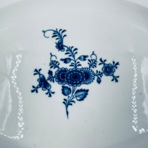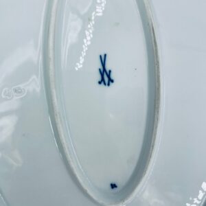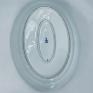 Półmisek charakteryzuje się motywem kwiatowym we wzorze cebulowym z przepiękna girlandą na górnej części w kolorze niebieskim na białym tle. Patera ma owalny kształt z falistymi brzegami i dekoracyjnymi uchwytami. Wysokiej jakości porcelana miśnieńska produkowana jest od 1710r.