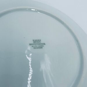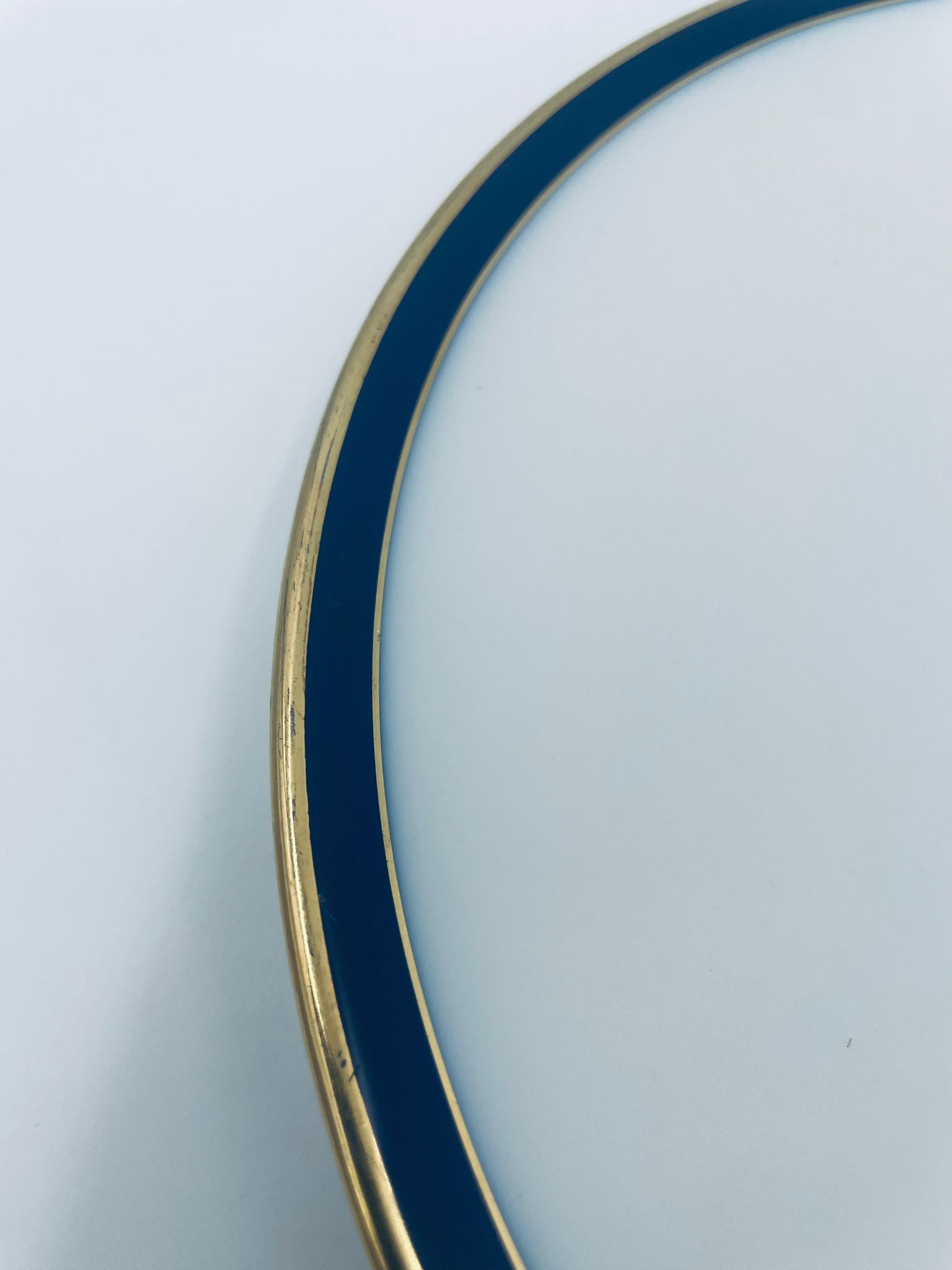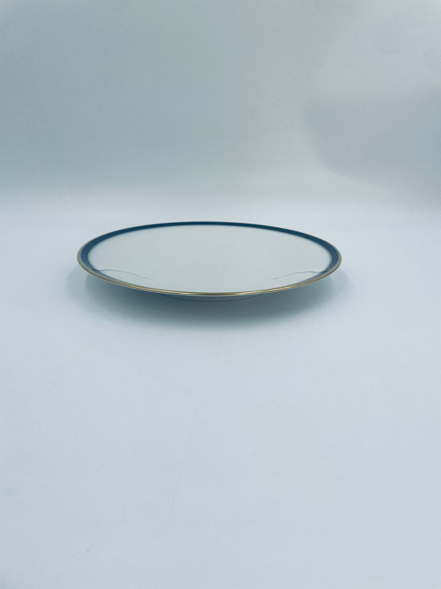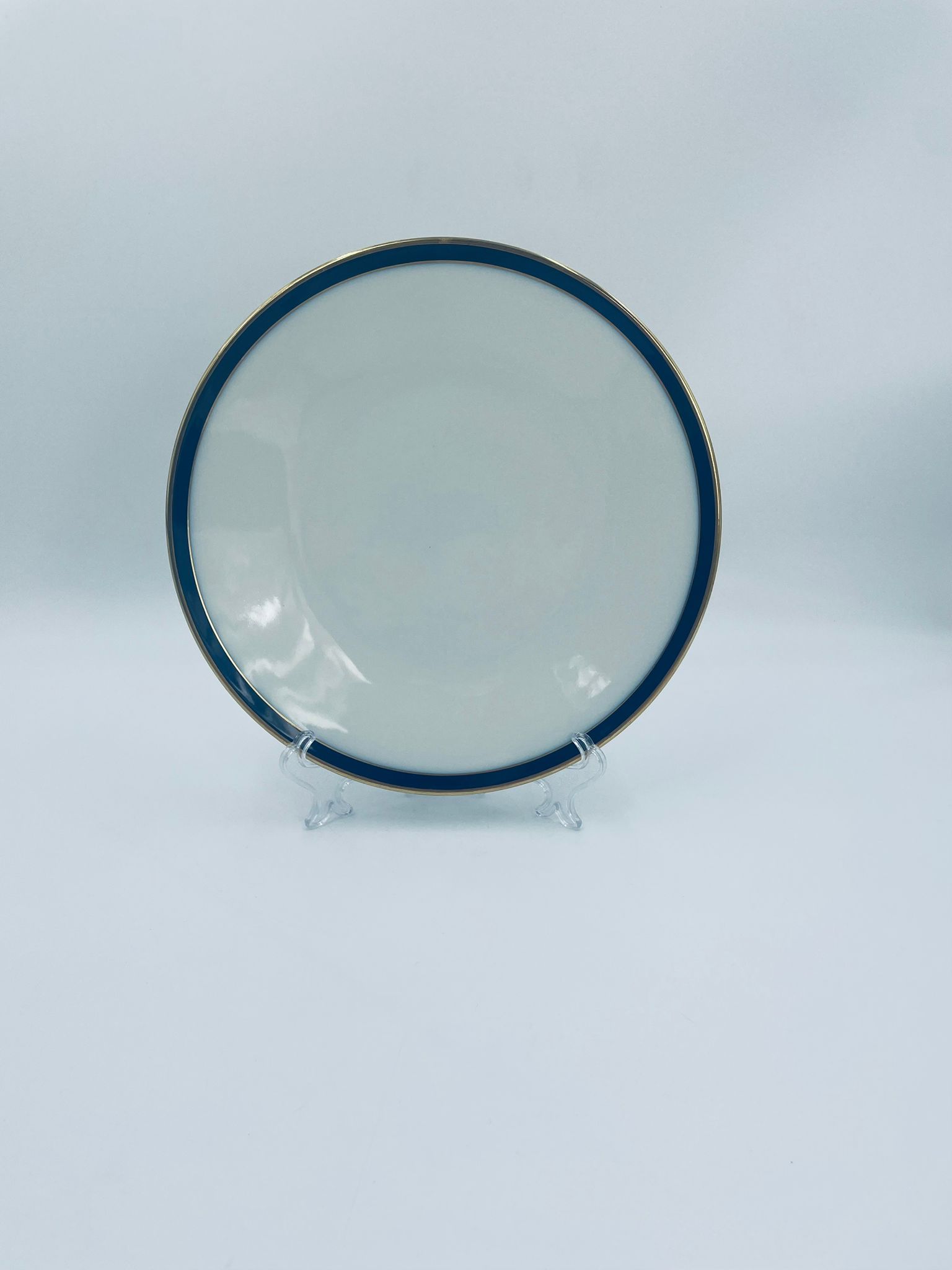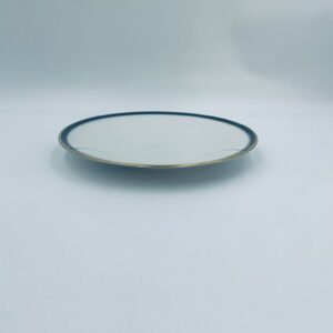 Talerz płaski obiadowy wytwórni Hutschenreuther, wykonany z wysokiej jakości białej porcelany. Talerz okrągły, klasyczny, ozdobiony granatowo-złotą obwódką na rancie. Posiada przetarcie na złoceniu.