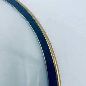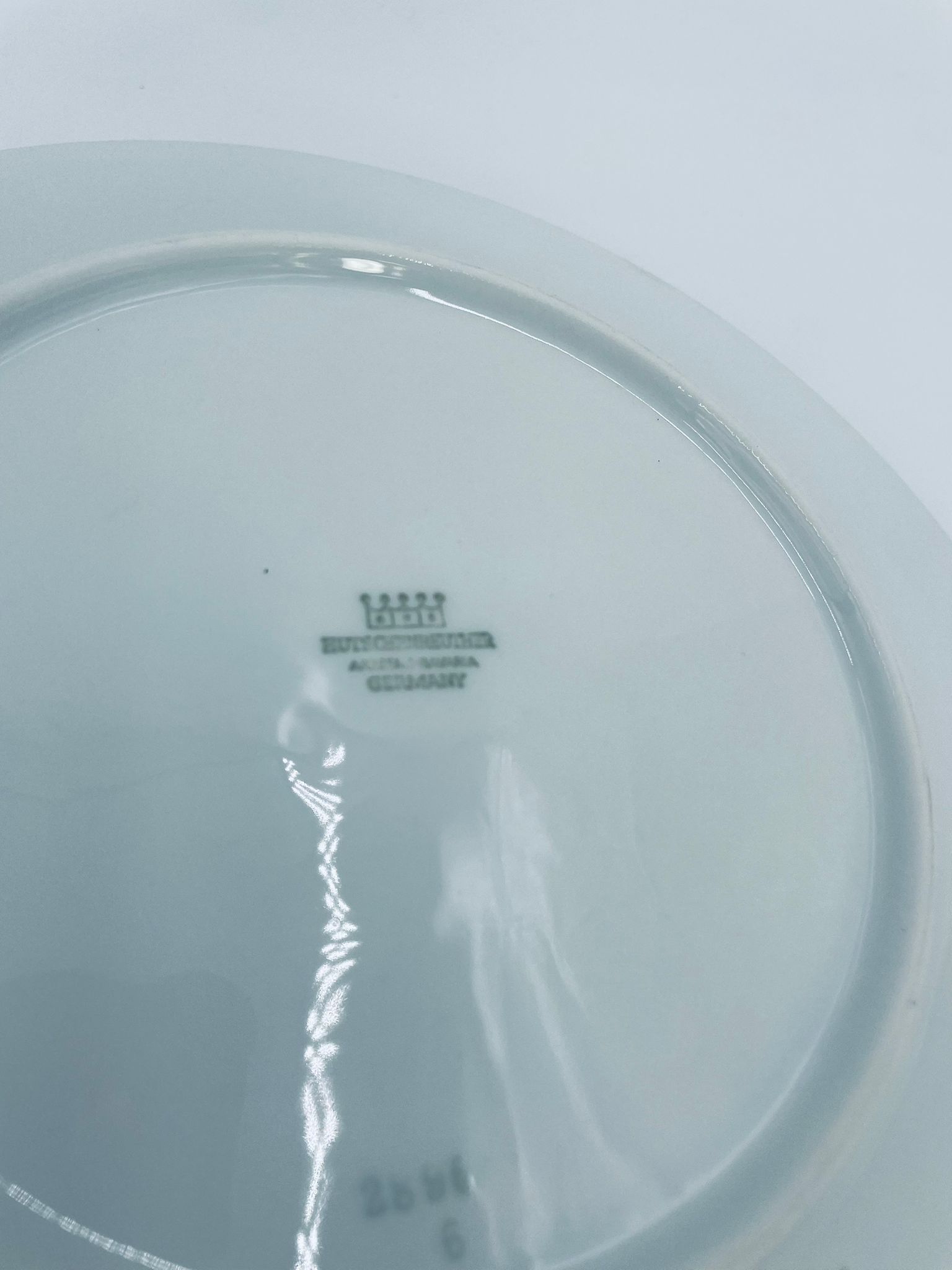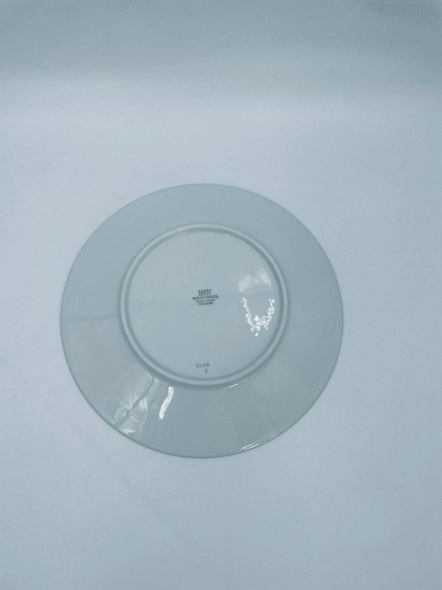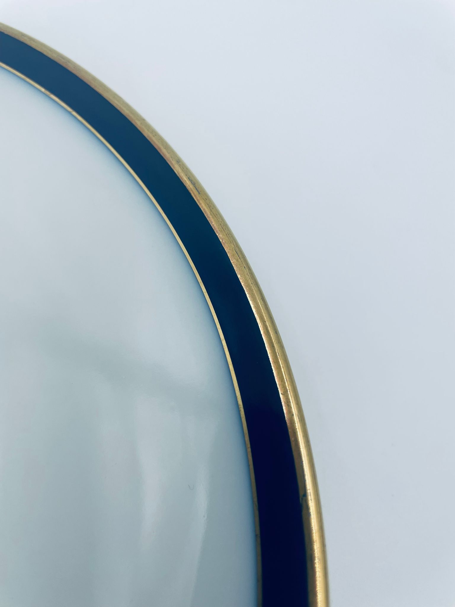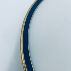 Talerz płaski obiadowy wytwórni Hutschenreuther, wykonany z wysokiej jakości białej porcelany. Talerz okrągły, klasyczny, ozdobiony granatowo-złotą obwódką na rancie. Posiada przetarcie na złoceniu.