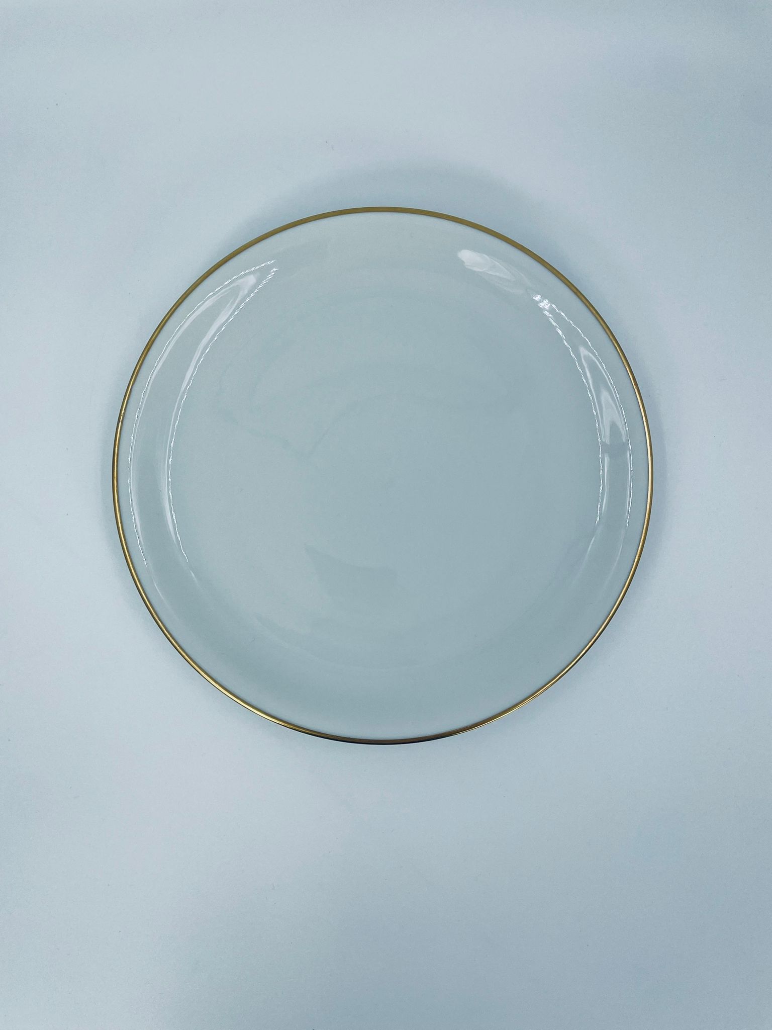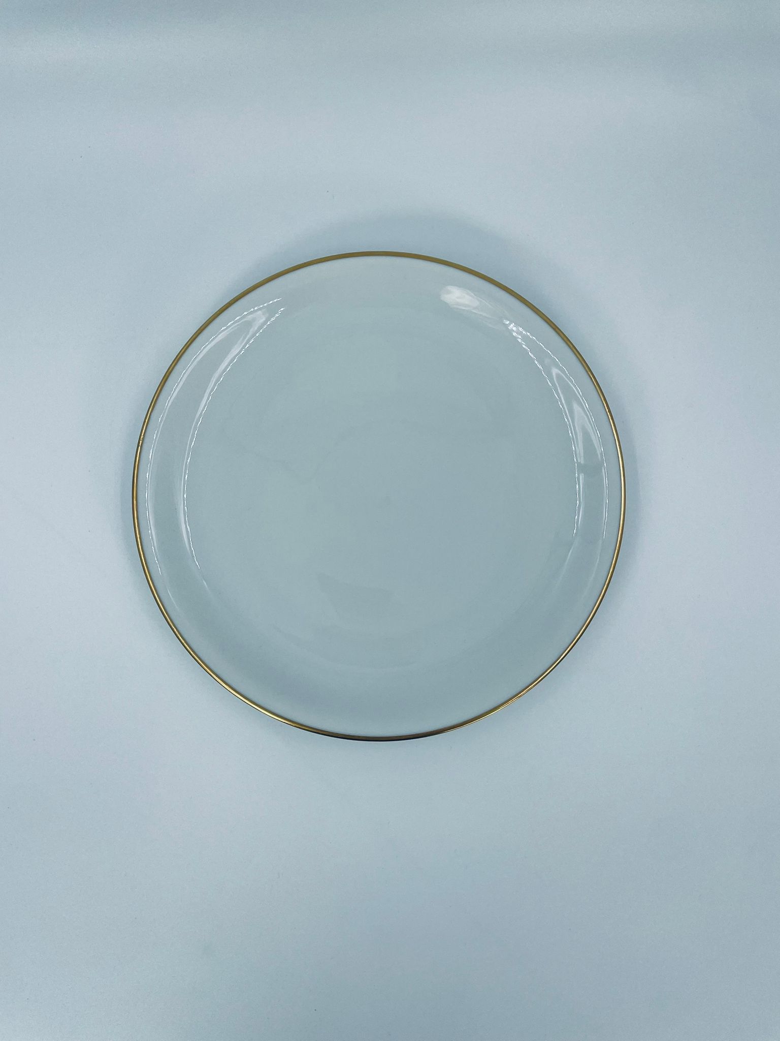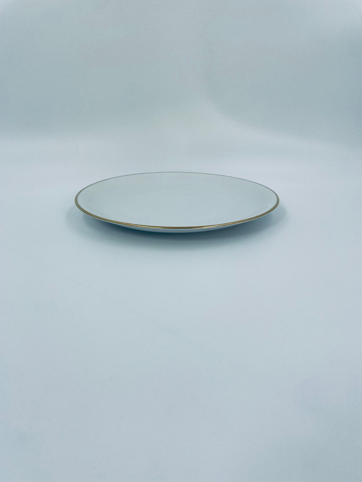 Talerz płaski obiadowy wytwórni KPM Krister, wykonany z wysokiej jakości białej porcelany. Talerz elegancki, klasyczny, wykończony złoceniem na rancie. Posiada małe przetarcie na złoceniu.