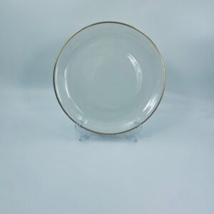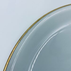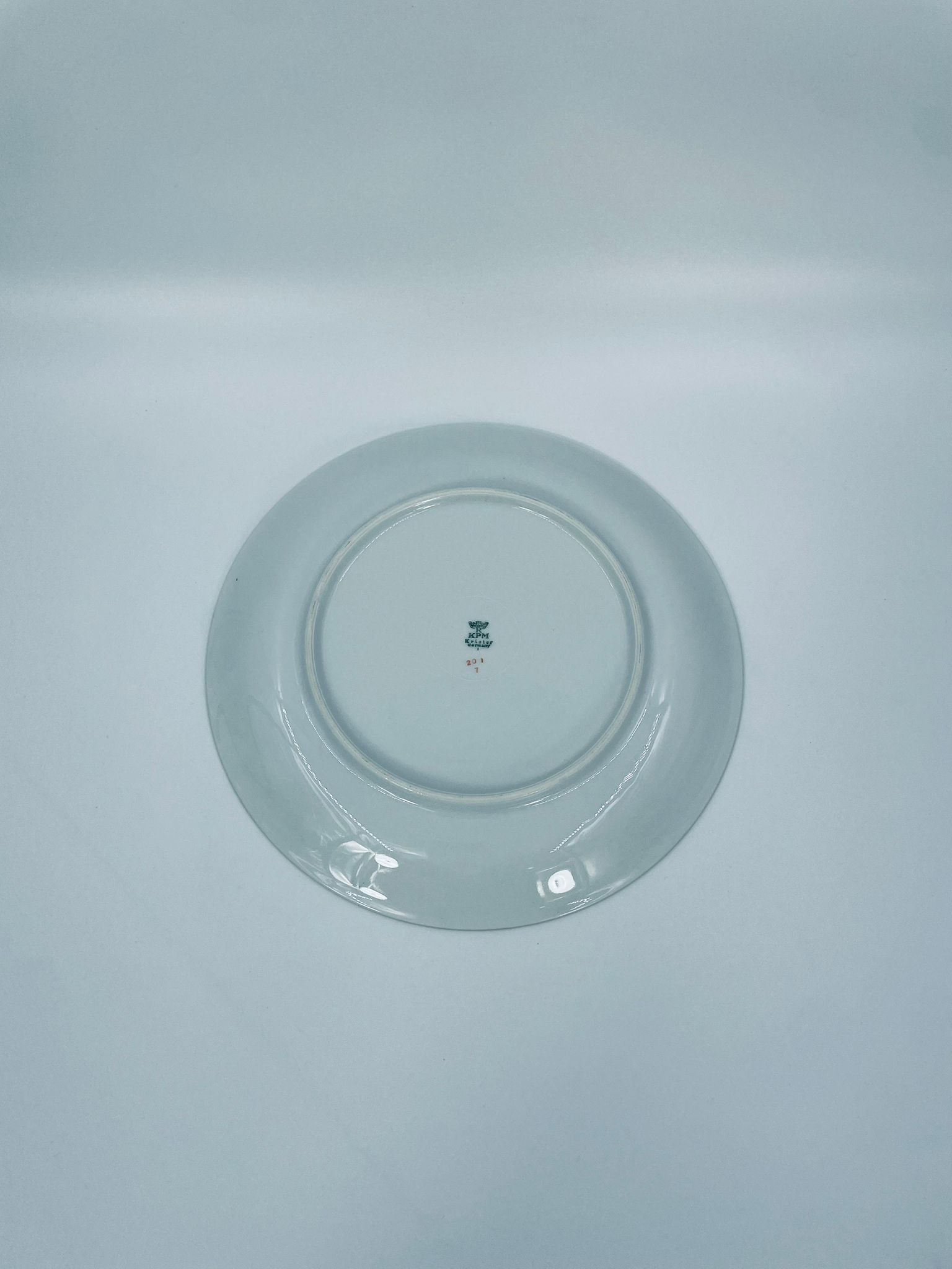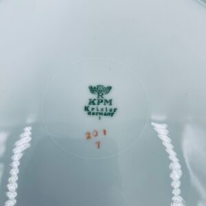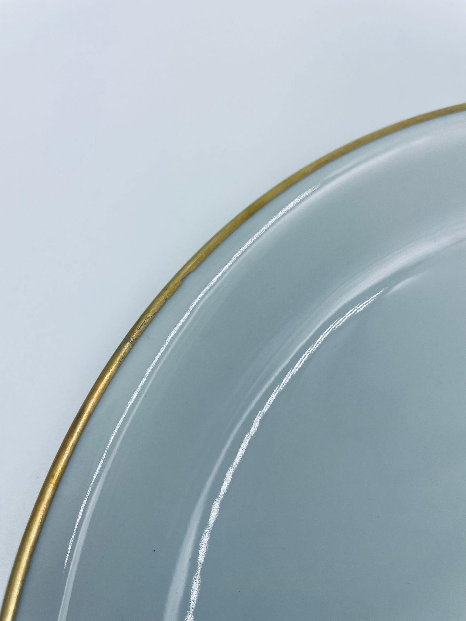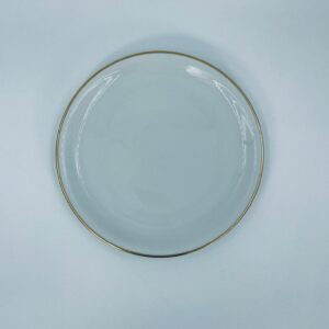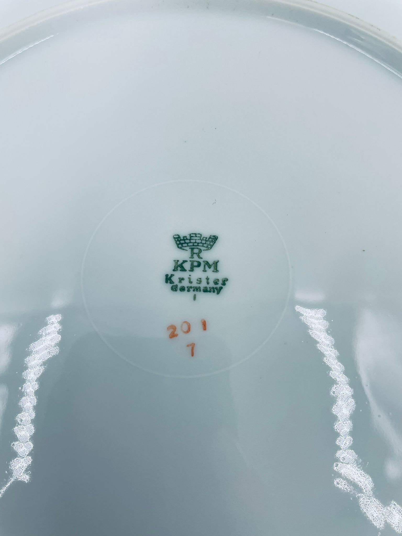 Talerz płaski obiadowy wytwórni KPM Krister, wykonany z wysokiej jakości białej porcelany. Talerz elegancki, klasyczny, wykończony złoceniem na rancie. Posiada małe przetarcie na złoceniu.