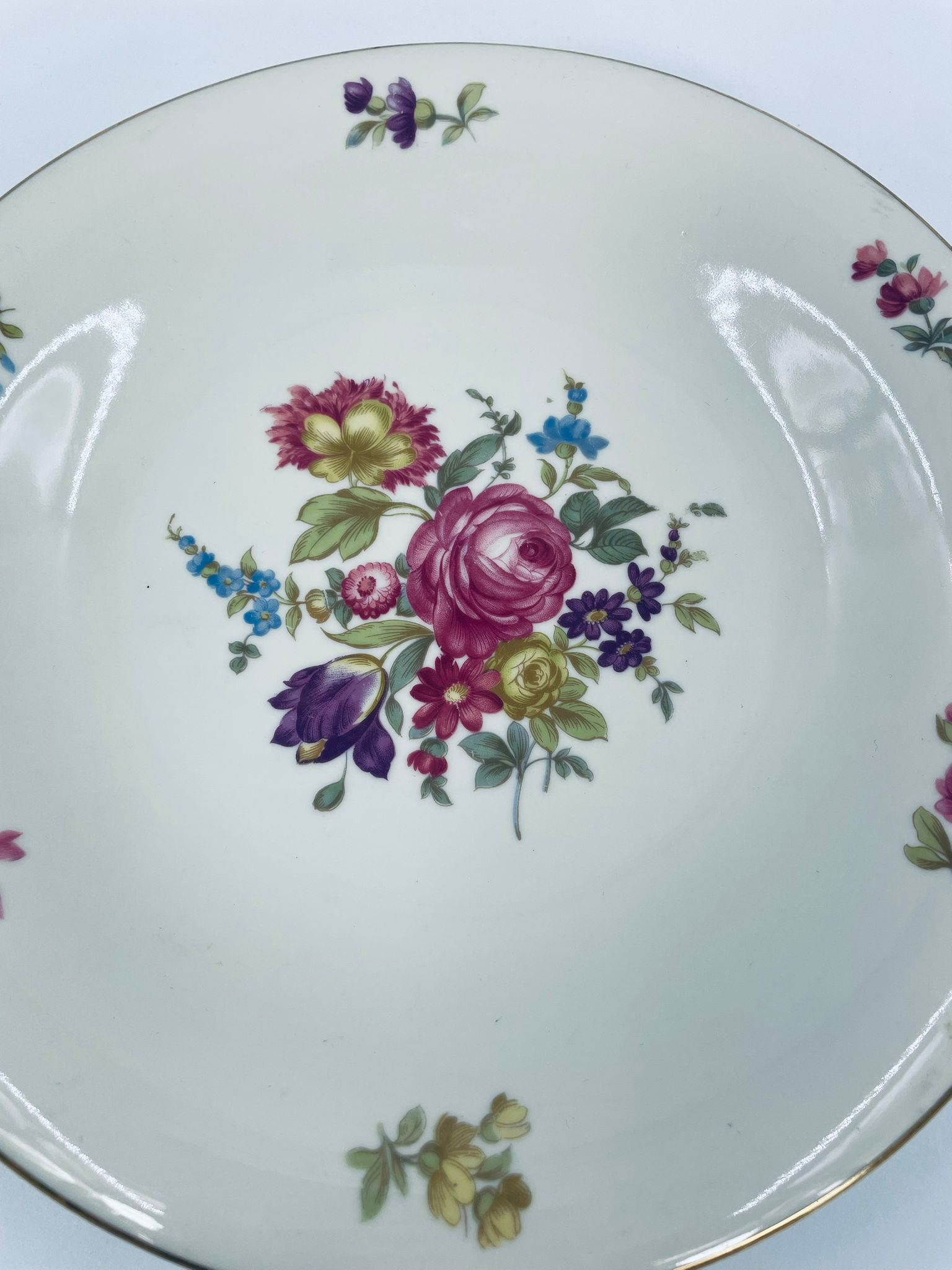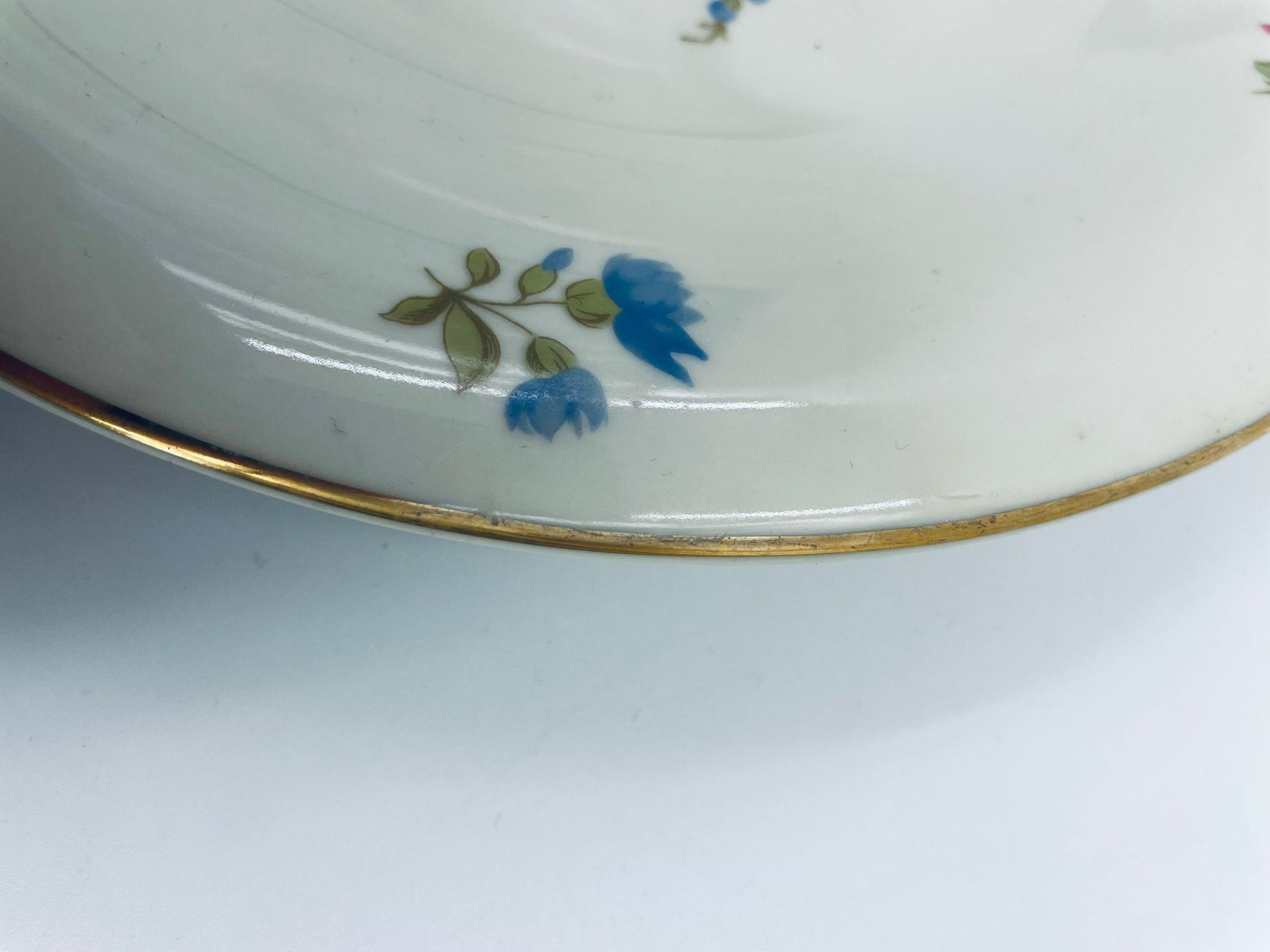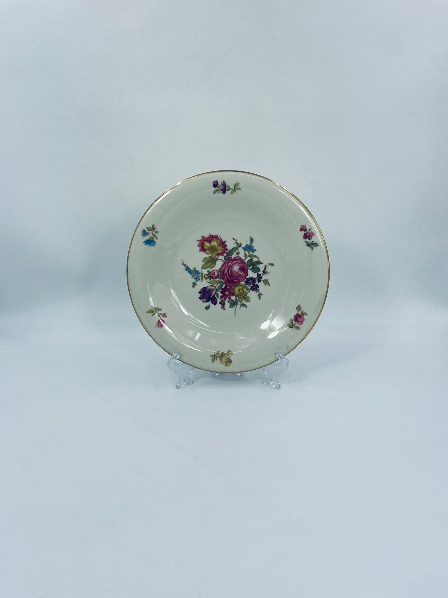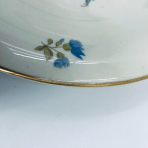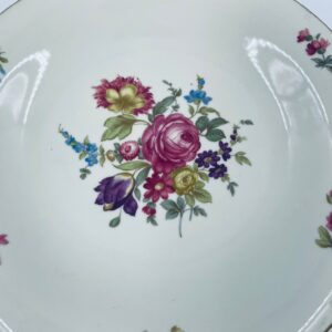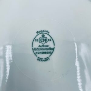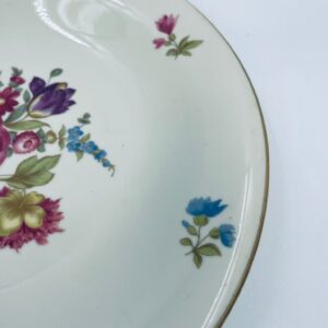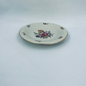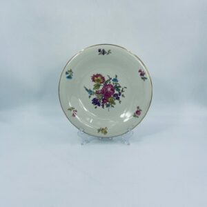 Talerz głębszy wytwórni Hutschenreuther Hohenberg, wykonany z wysokiej jakości porcelany w kolorze ecru. Talerz ozdobiony motywem kwiatowym, wykończony złoceniem na rancie. Posiada przetarcia na złoceniu.