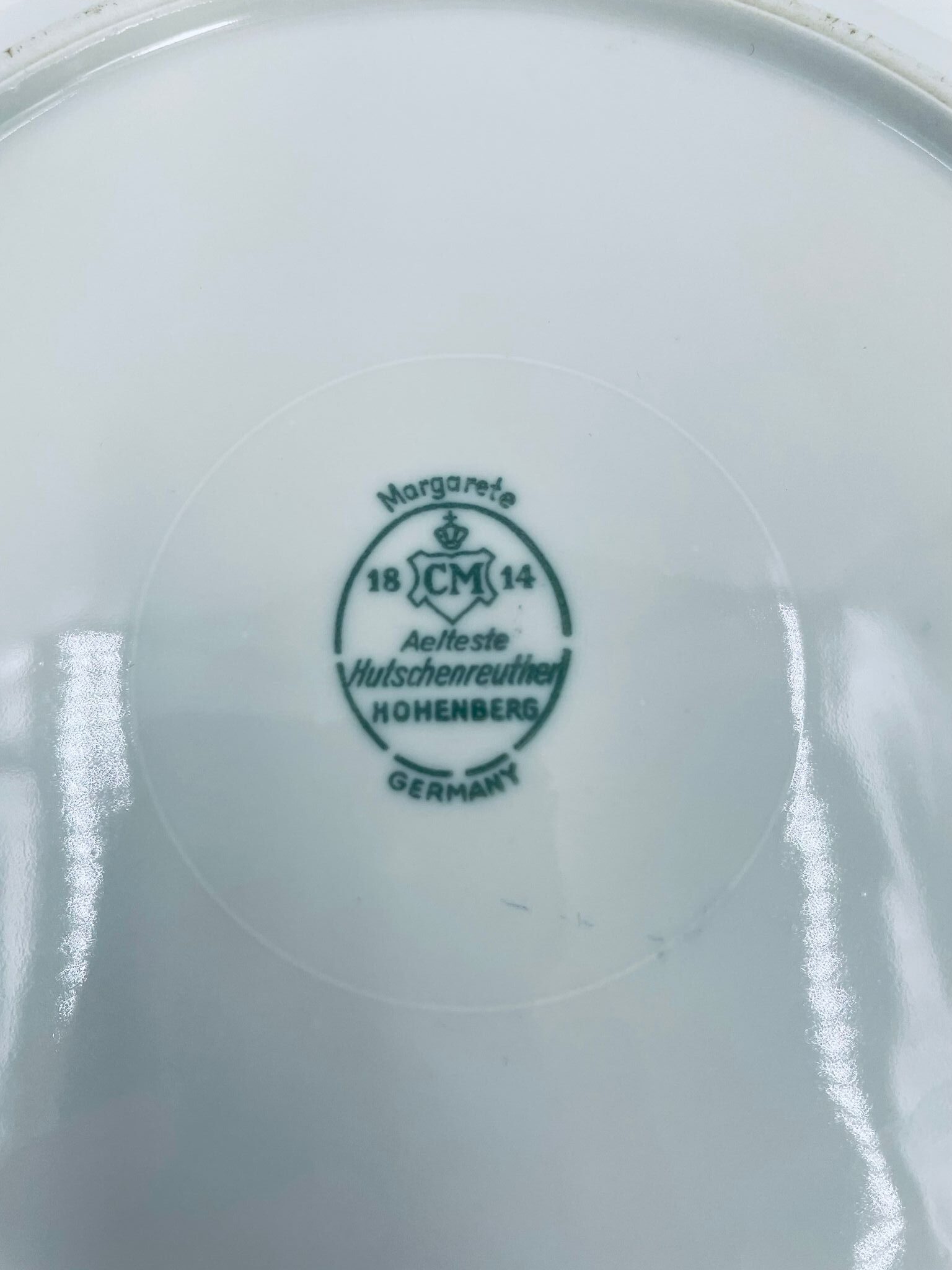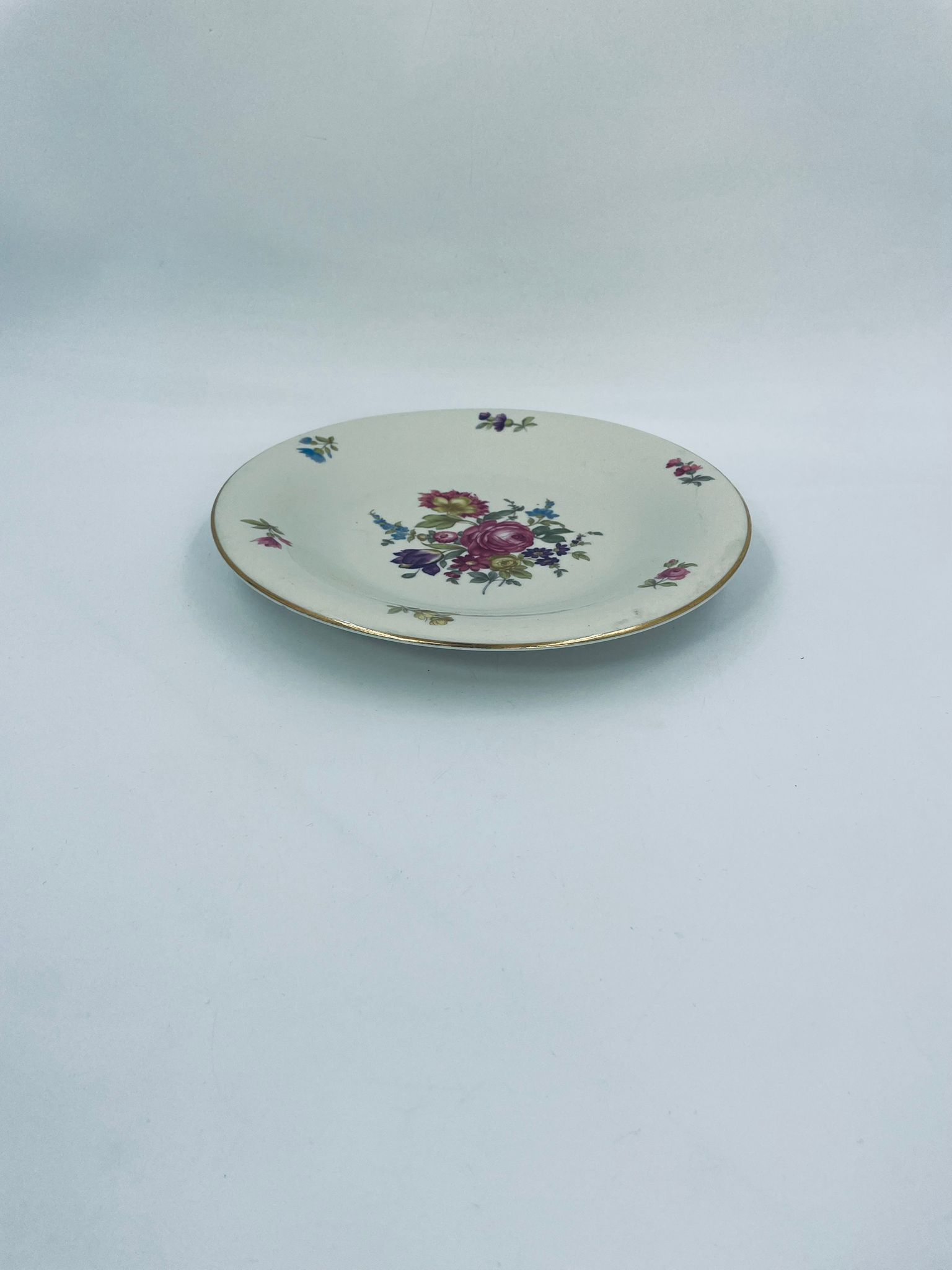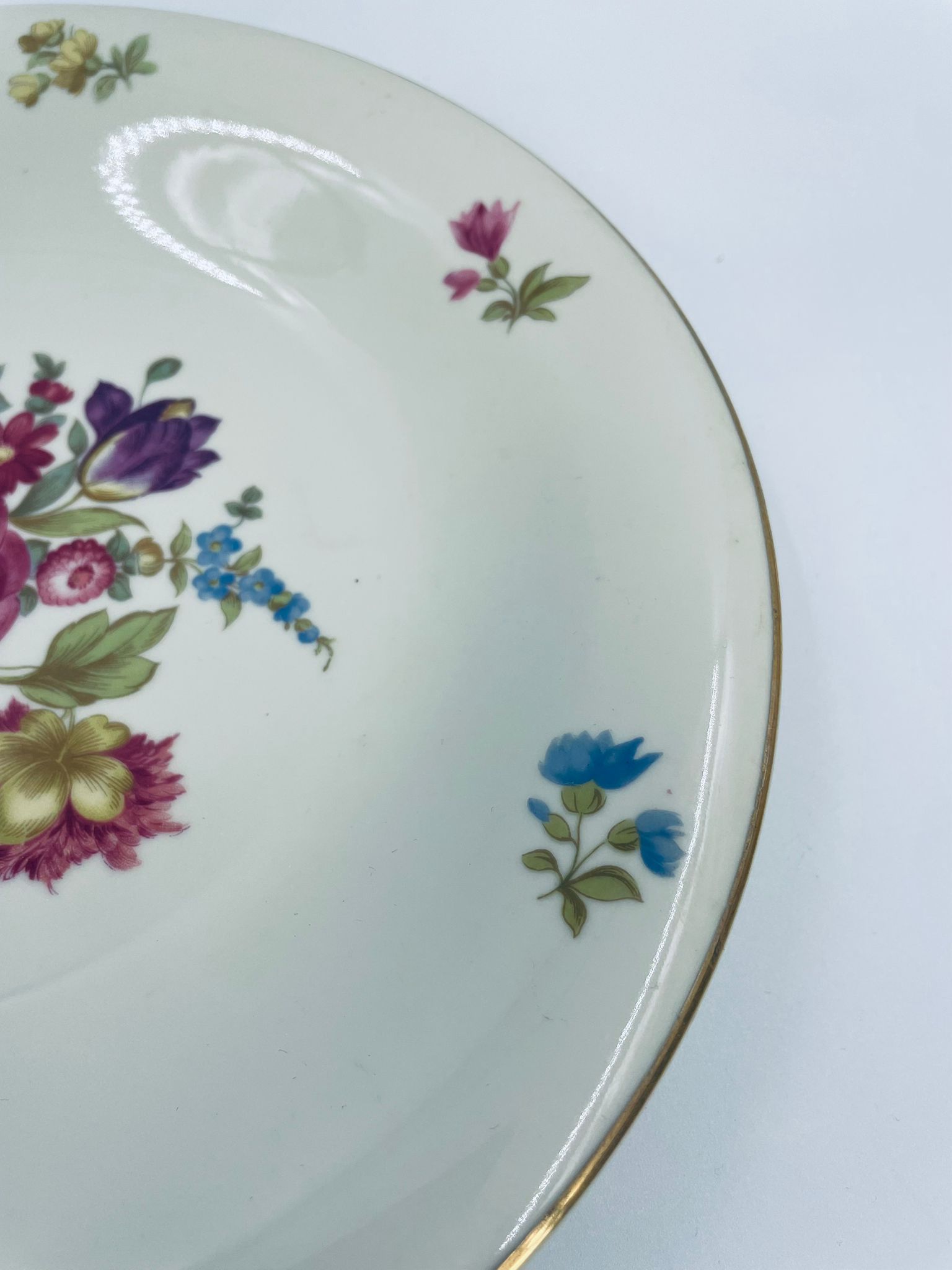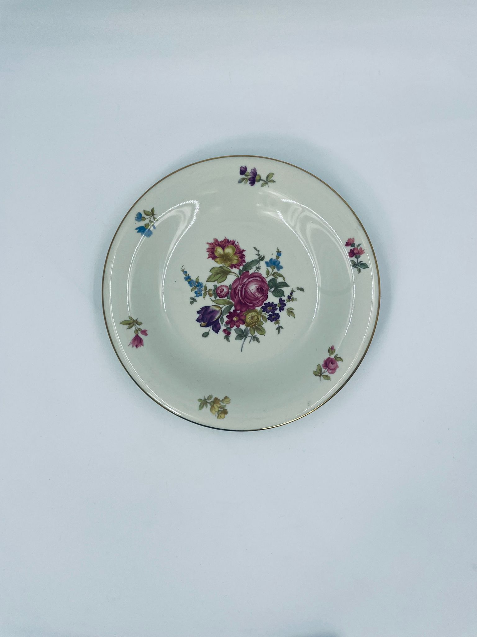 Talerz głębszy wytwórni Hutschenreuther Hohenberg, wykonany z wysokiej jakości porcelany w kolorze ecru. Talerz ozdobiony motywem kwiatowym, wykończony złoceniem na rancie. Posiada przetarcia na złoceniu.