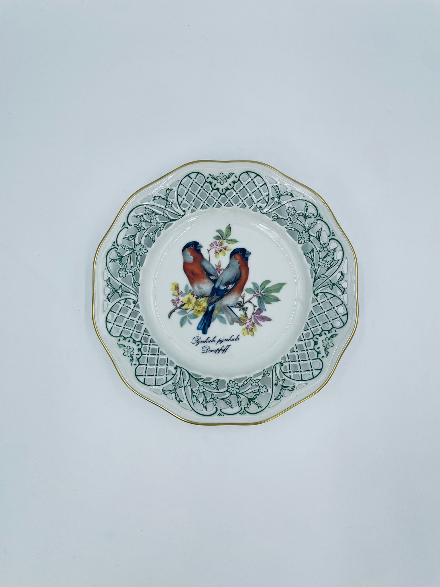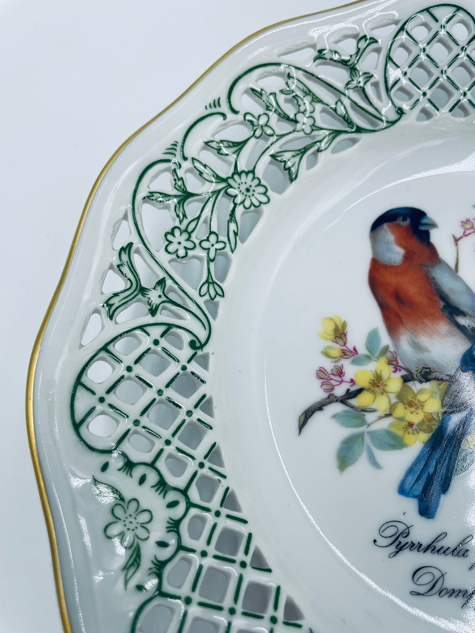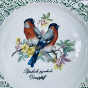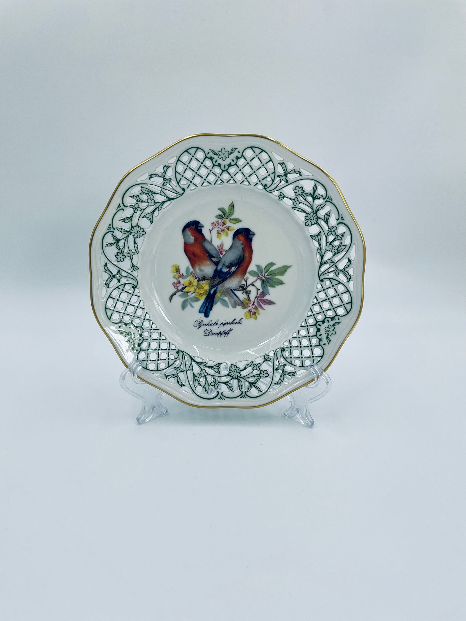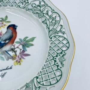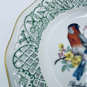 Talerzyk dekoracyjny, kolekcjonerski, ścienny, wytwórni Schumann Arzberg, wykonany z wysokiej jakości białej porcelany. Talerz charakteryzuje się pięknym ażurowym brzegiem z zielonym akcentem kwiatowym, dekoracją ptaków Pyrrhula Pyrrhula, czyli Gilów, wykończony złoceniem na nieregularnej krawędzi.