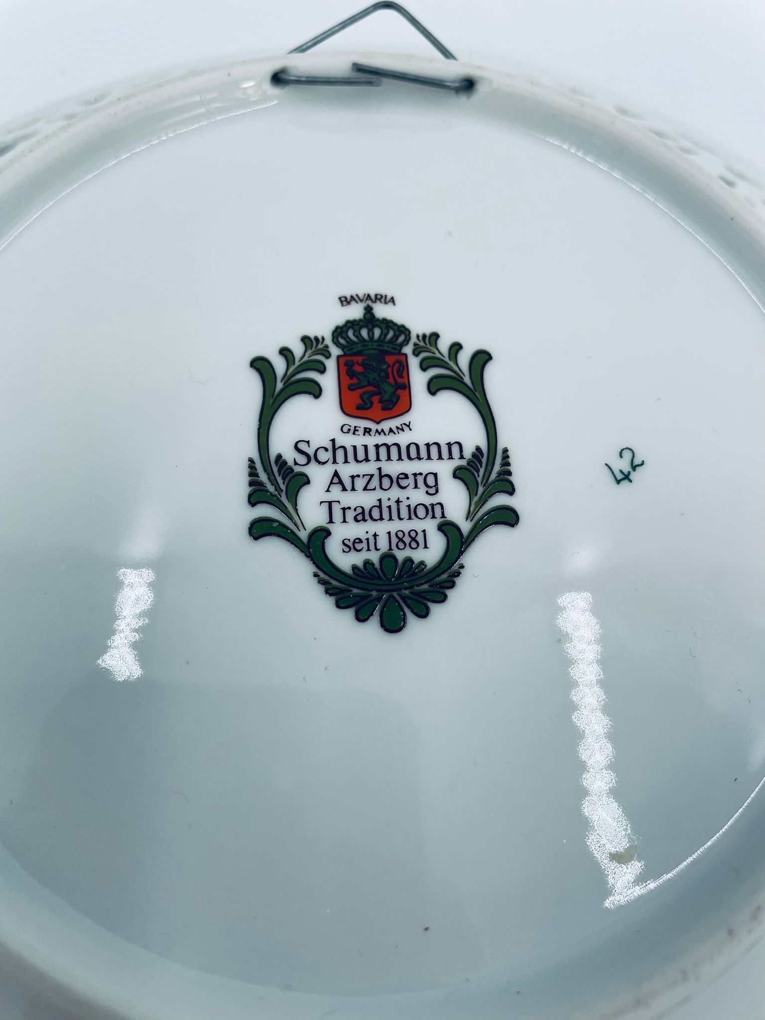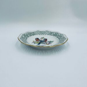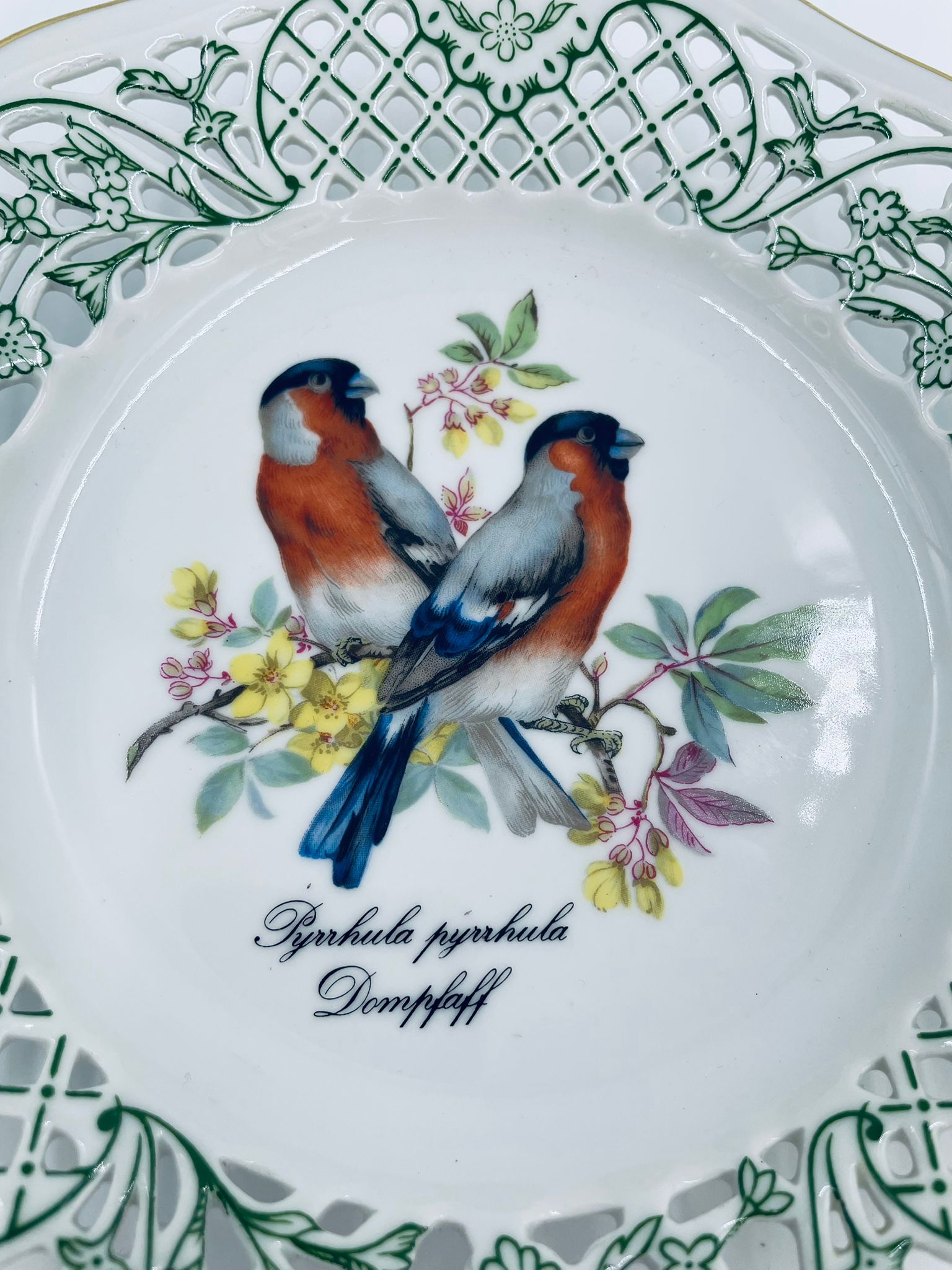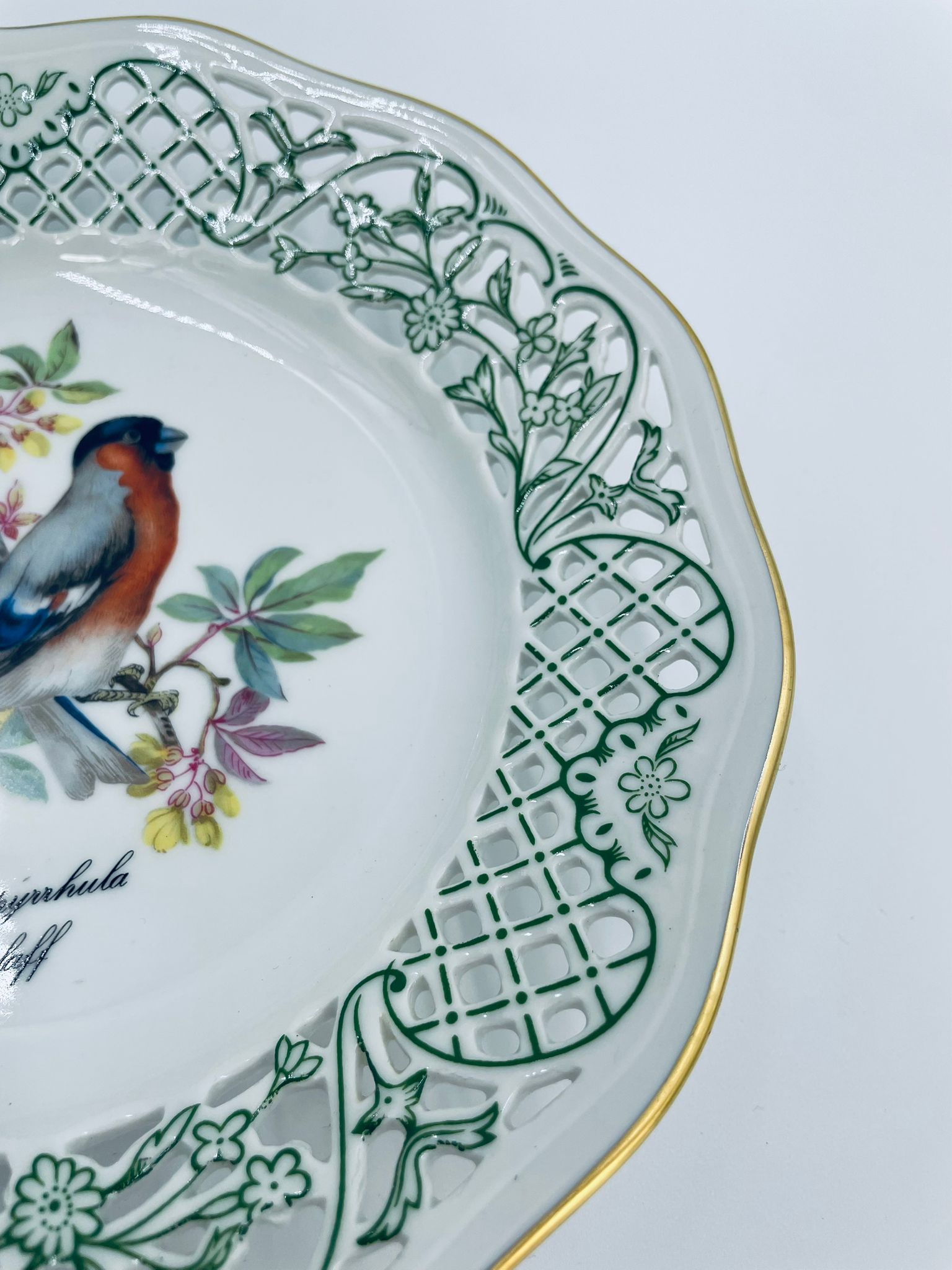 Talerzyk dekoracyjny, kolekcjonerski, ścienny, wytwórni Schumann Arzberg, wykonany z wysokiej jakości białej porcelany. Talerz charakteryzuje się pięknym ażurowym brzegiem z zielonym akcentem kwiatowym, dekoracją ptaków Pyrrhula Pyrrhula, czyli Gilów, wykończony złoceniem na nieregularnej krawędzi.