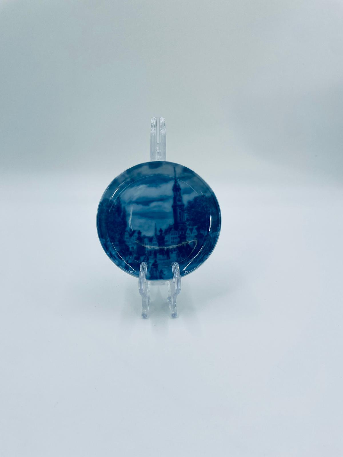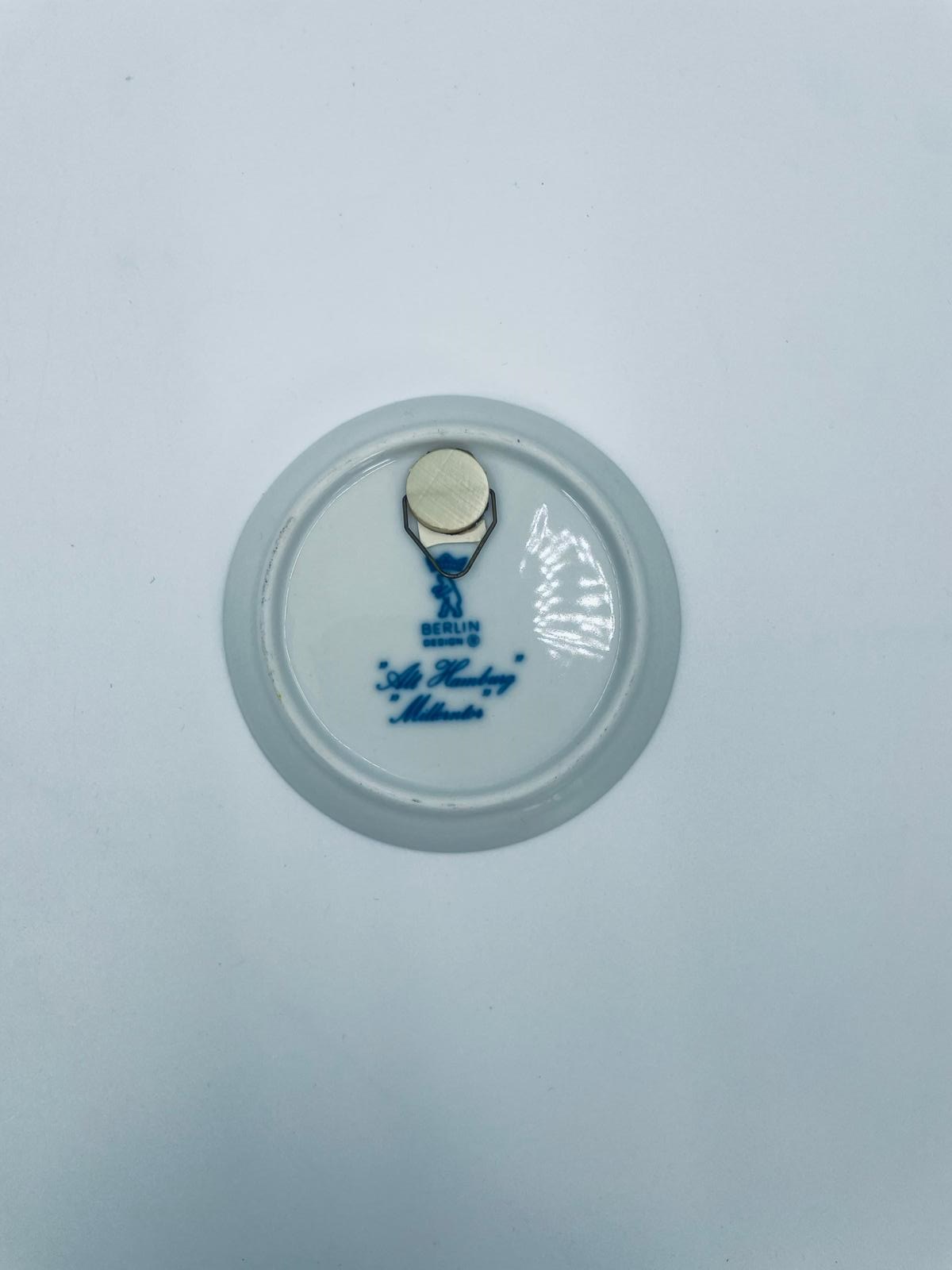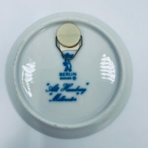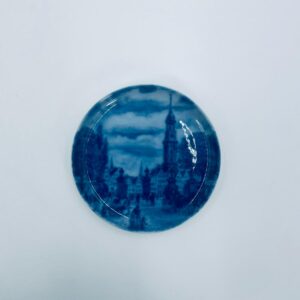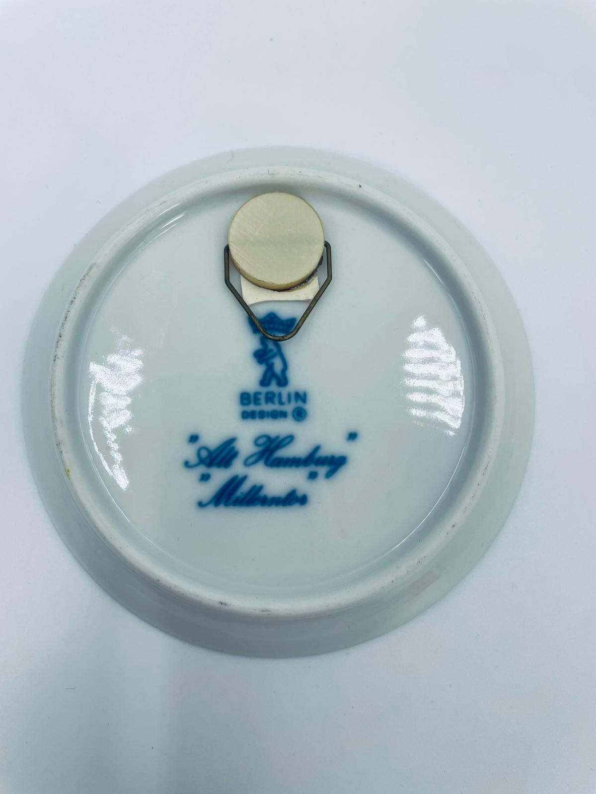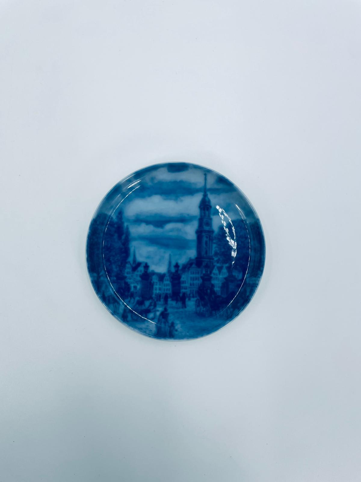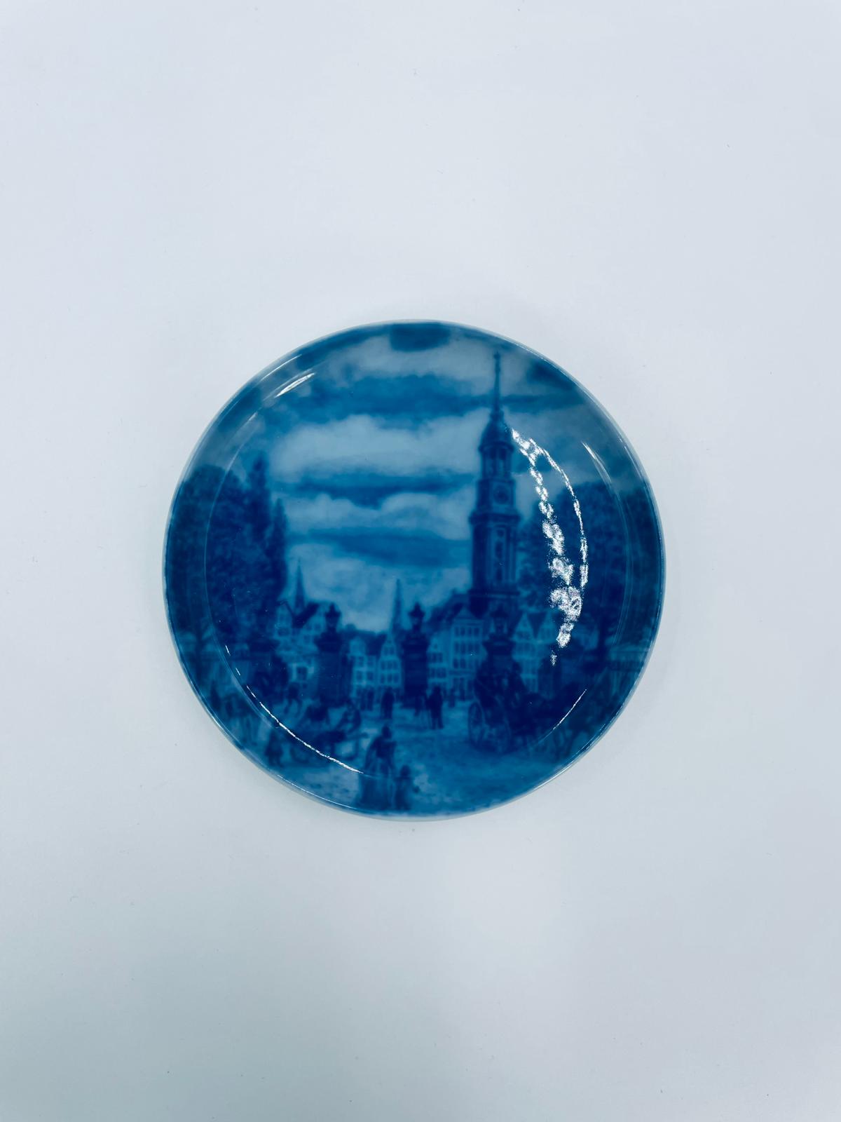 Talerzyk dekoracyjny, kolekcjonerski, ścienny, wytwórni Berlin Design, wykonany z wysokiej jakości porcelany. Talerzyk z serii „Alt Hamburg”, przedstawia scenę miejską z charakterystyczną architekturą i wieżą kościelną, prawdopodobnie inspirowaną widokiem Hamburga z XIXw., w kobaltowym kolorze.