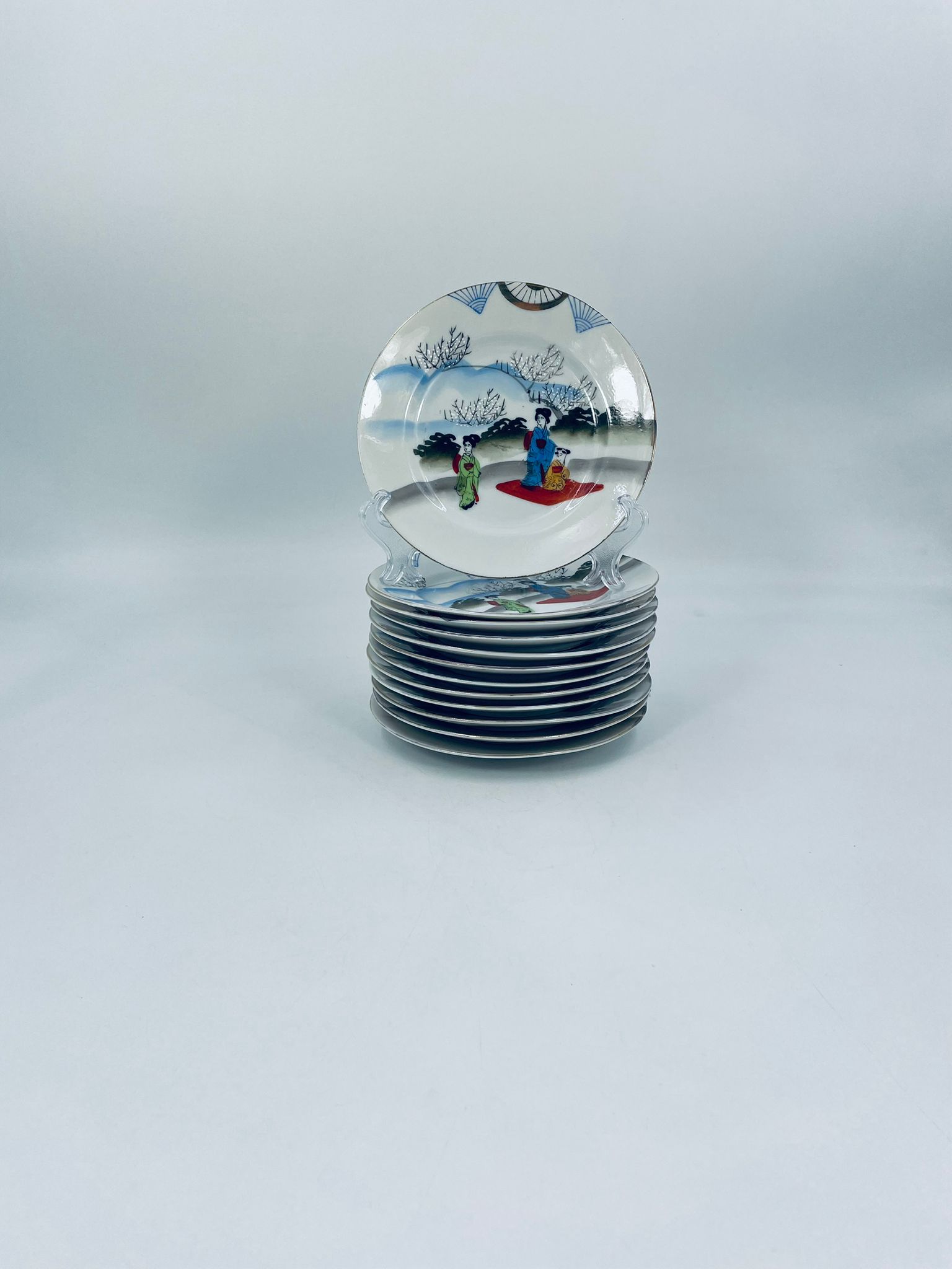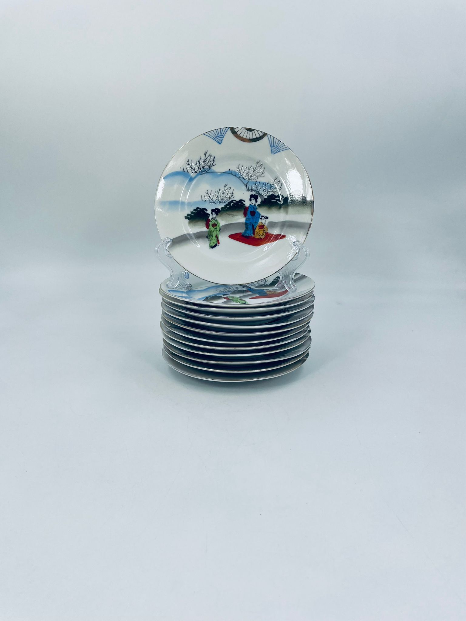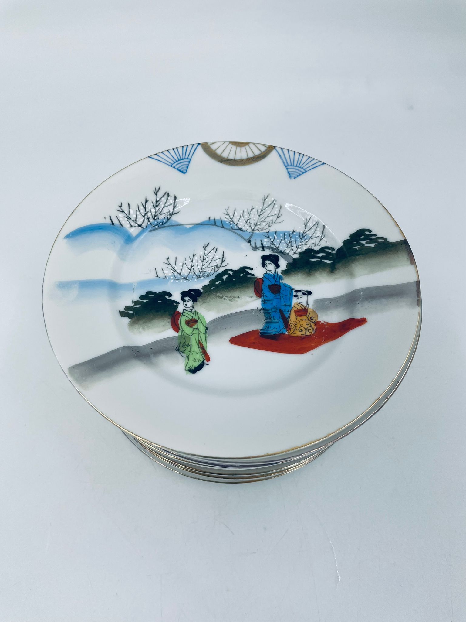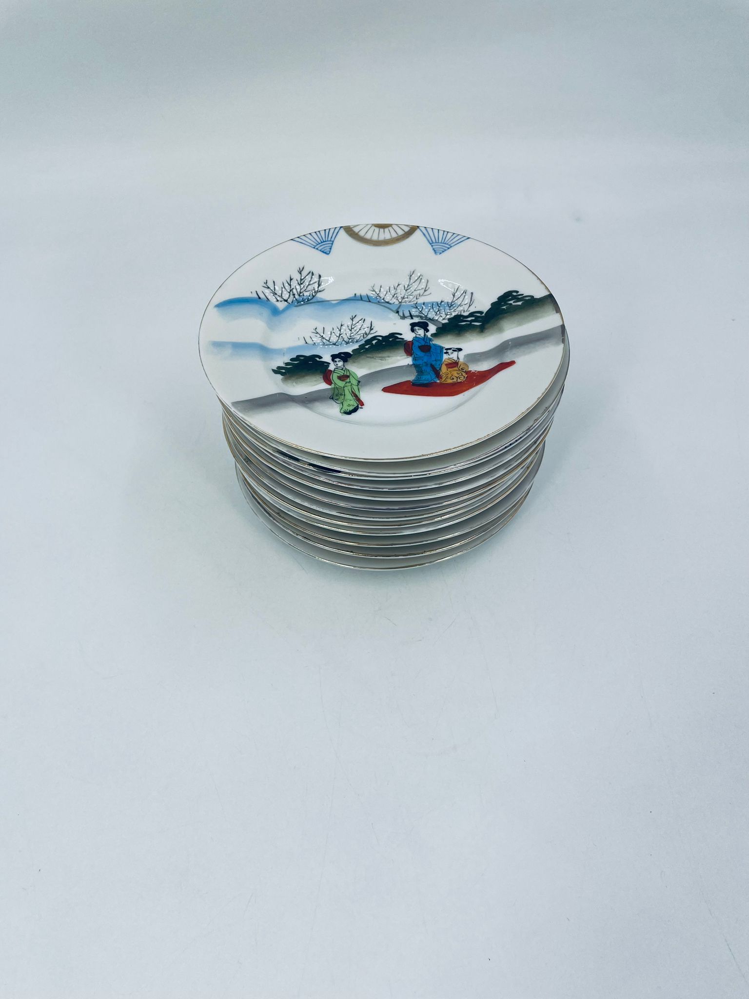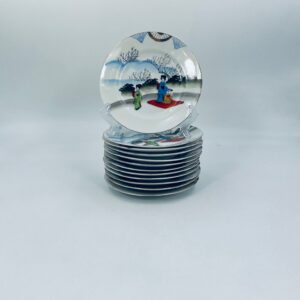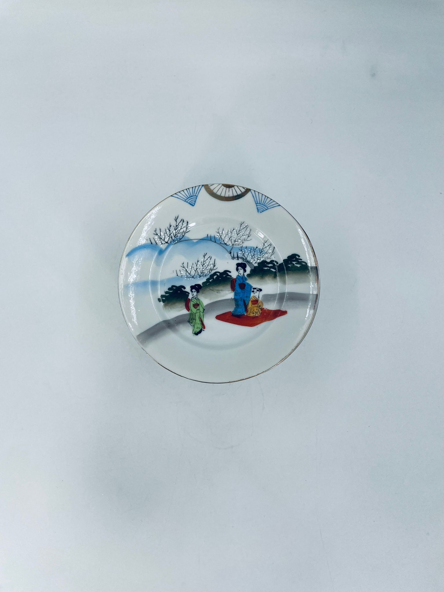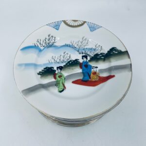 Talerzyk deserowy mały Yamda Nippon, Japoński, wyprodukowany z białej, cienkiej porcelany, ręcznie malowany na wzór w stylu Geisha.