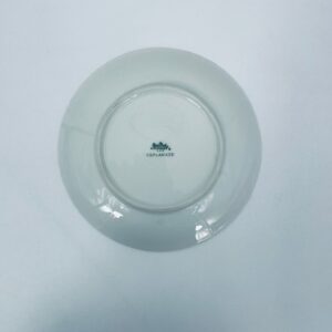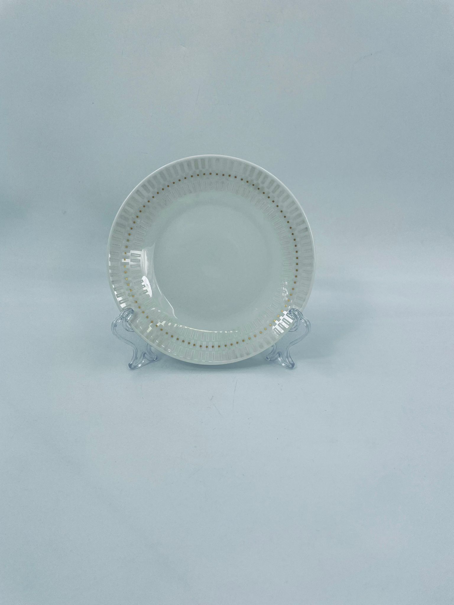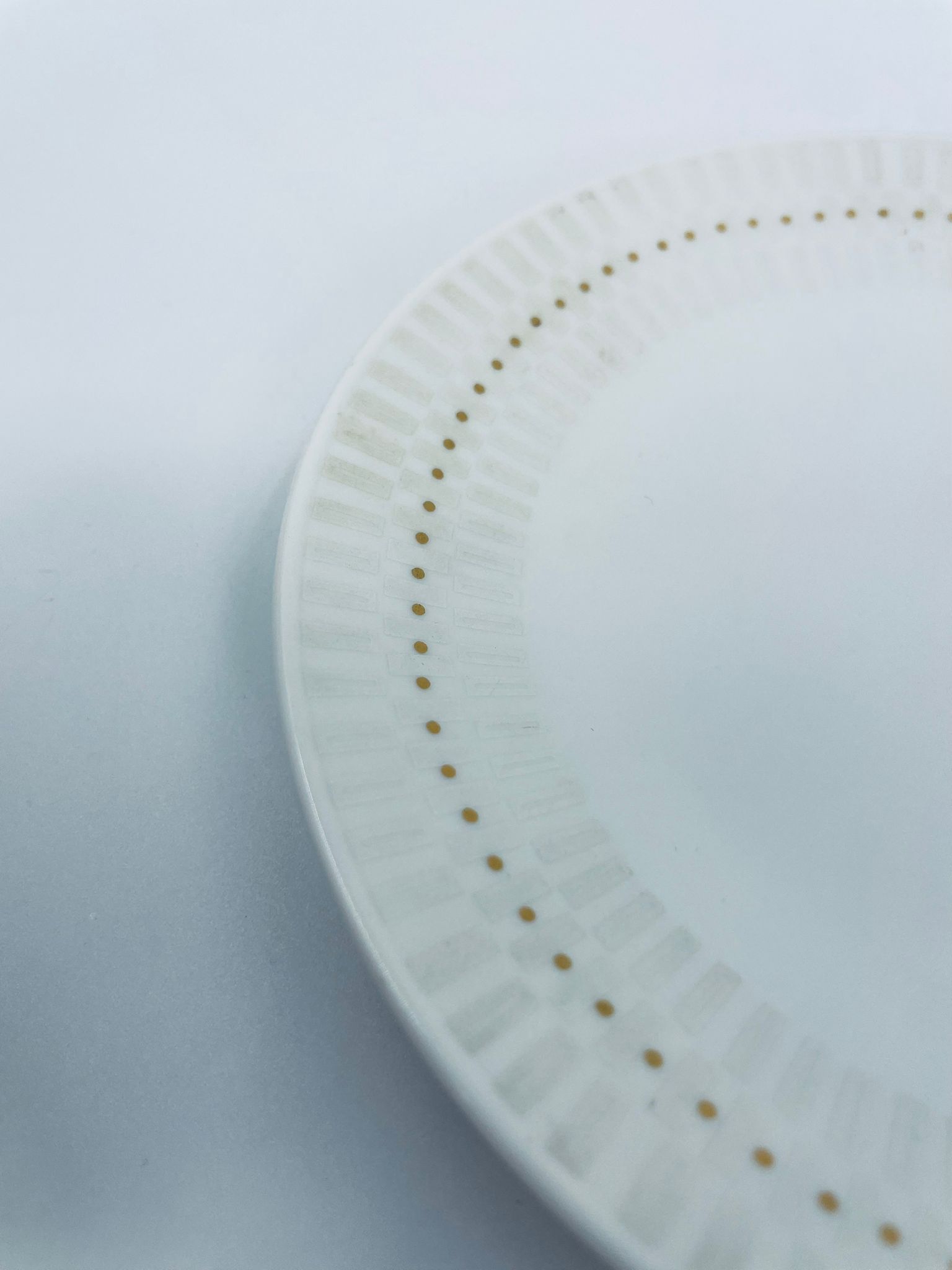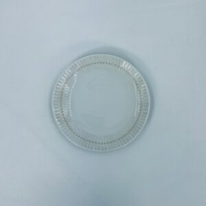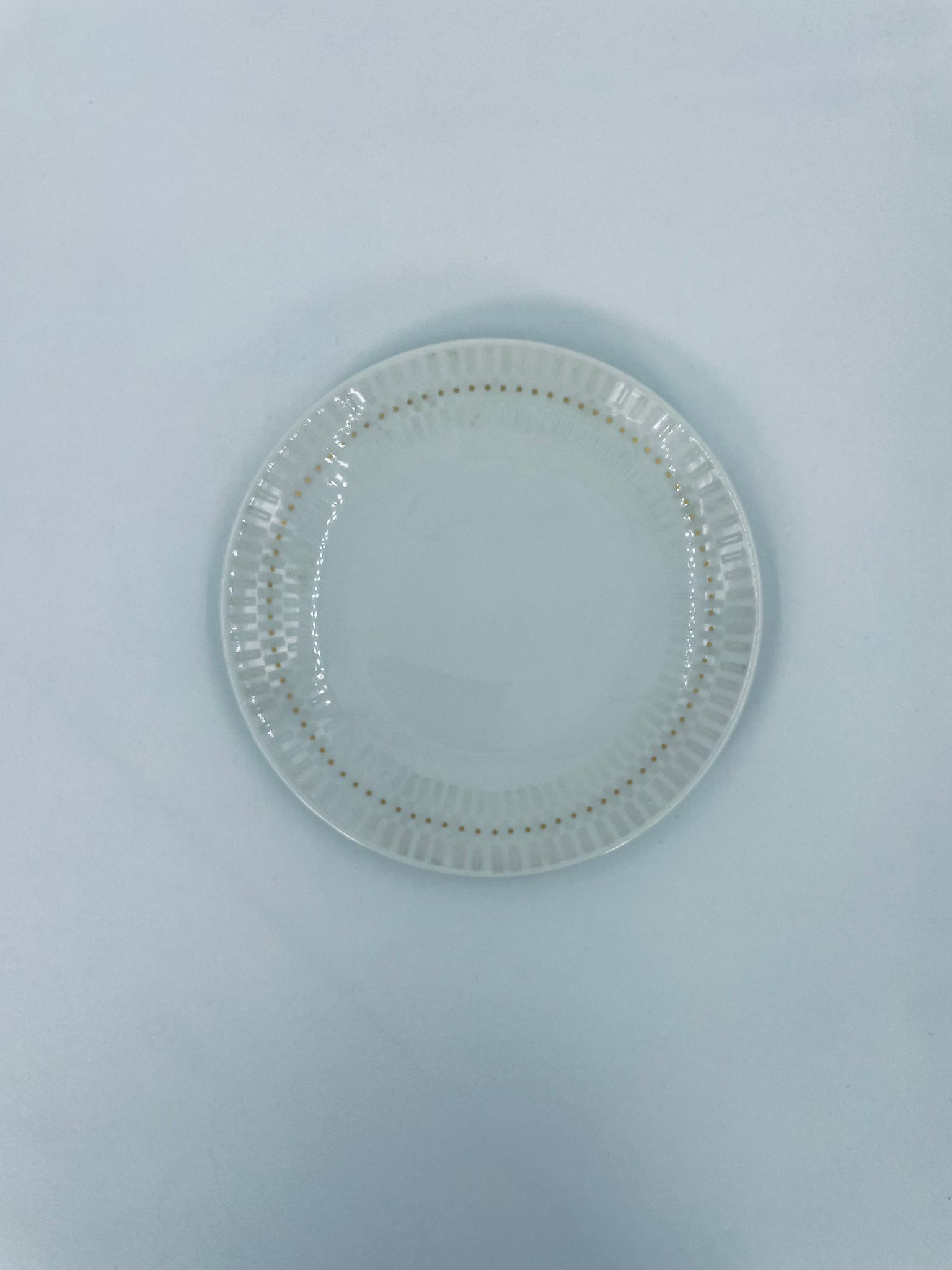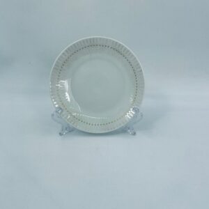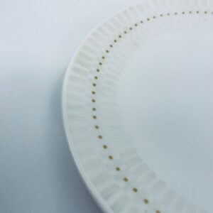 Mały Talerzyk deserowy wytwórni Rosenthal, wykonany z najwyższej jakości porcelany w kolorze ecru. Talerzyk z delikatnym wypukłym wzorem wokół krawędzi, ozdobiony złotymi kropeczkami.