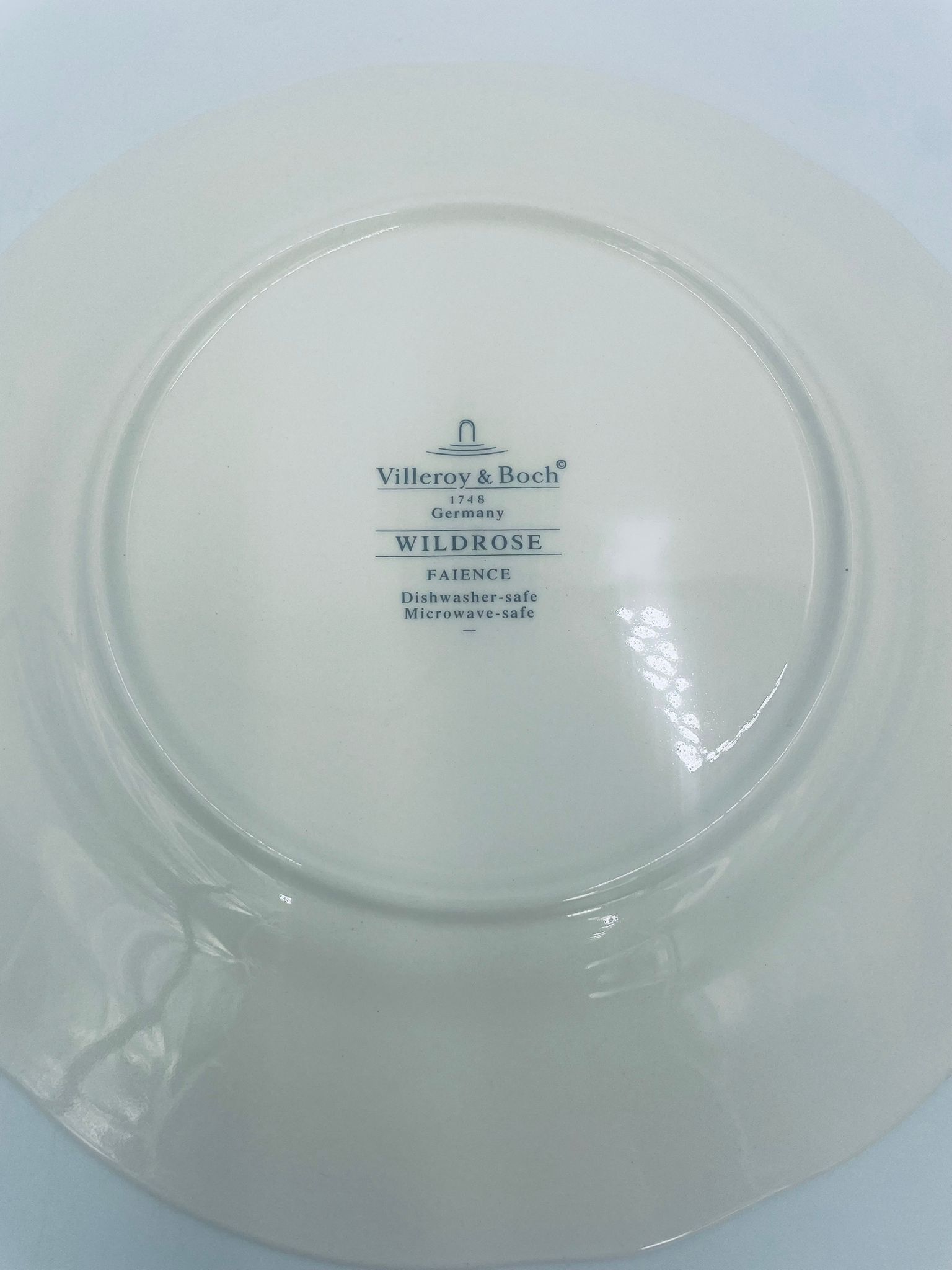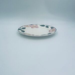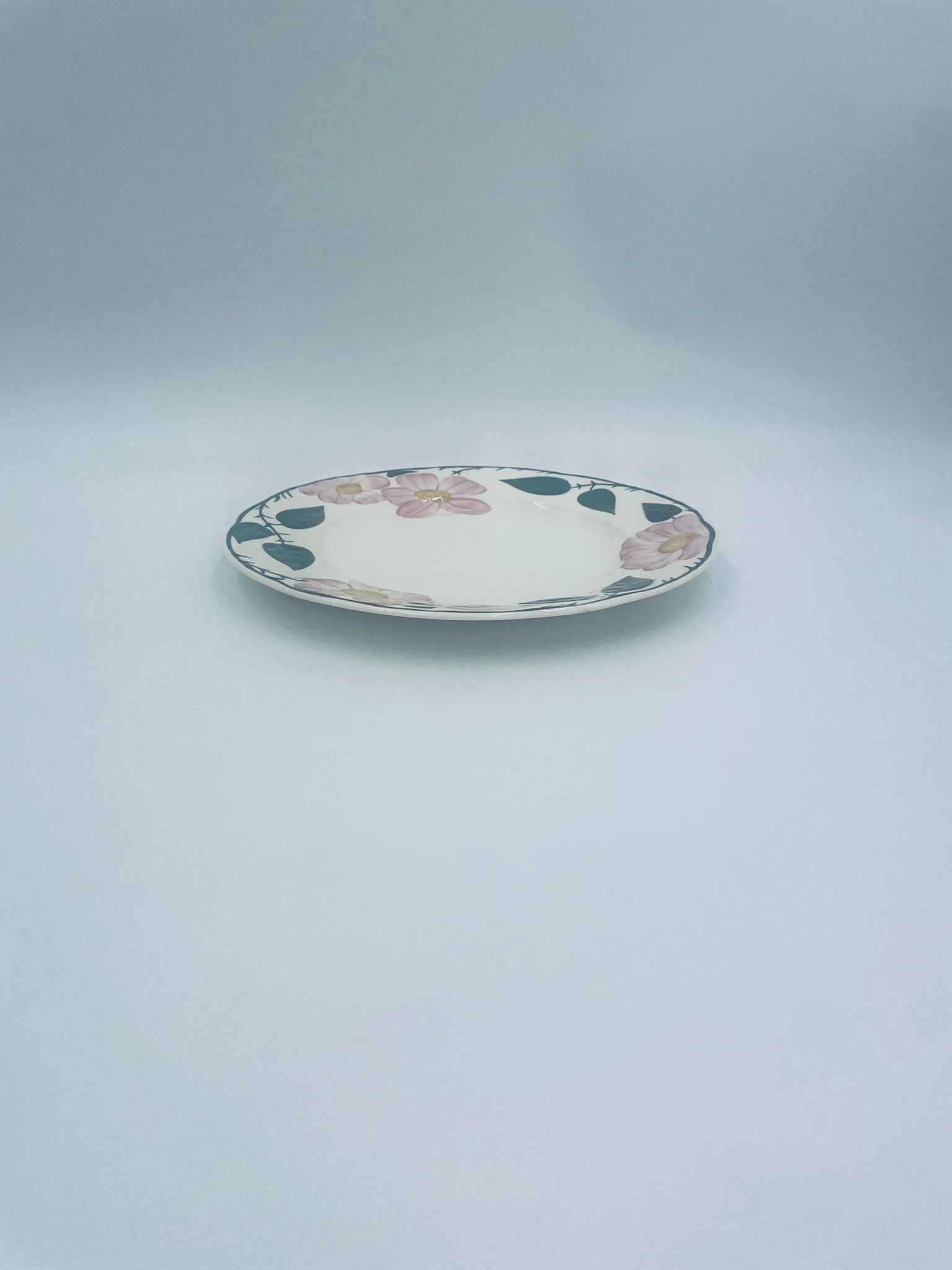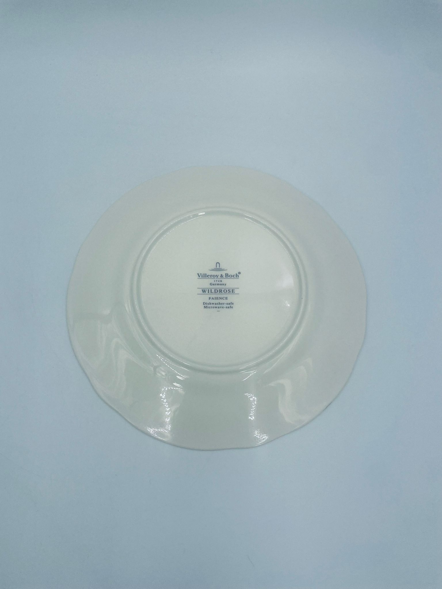 Talerzyk deserowy wytwórni Villeroy & Boch z kolekcji Wildrose zaprojektowany w 1969r, wykonany z wysokiej jakości porcelany w kolorze ecru. Talerz o nieregularnym, falistym rancie z zieloną obwódką, ozdobiony motywem ręcznie malowanych różowych kwiatów i zielonych liści.