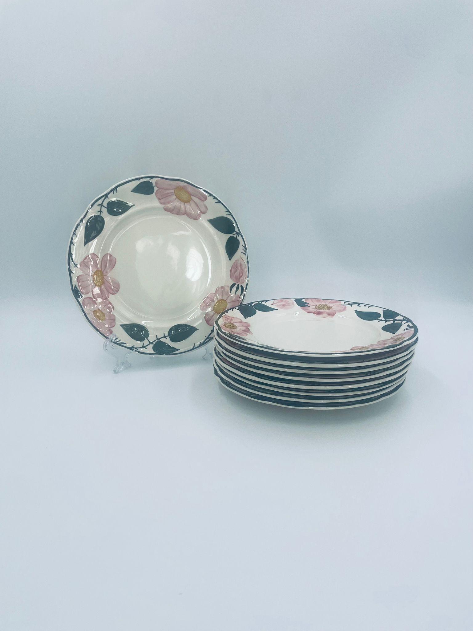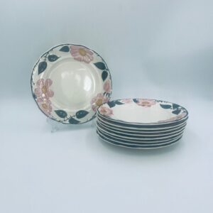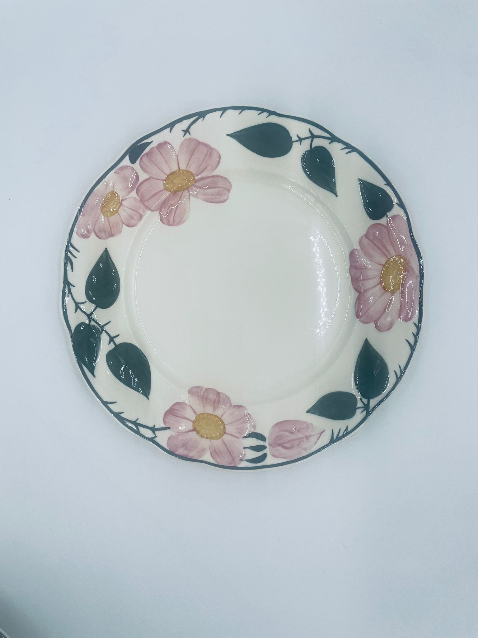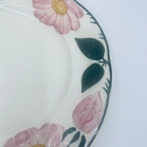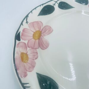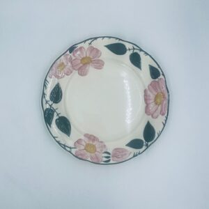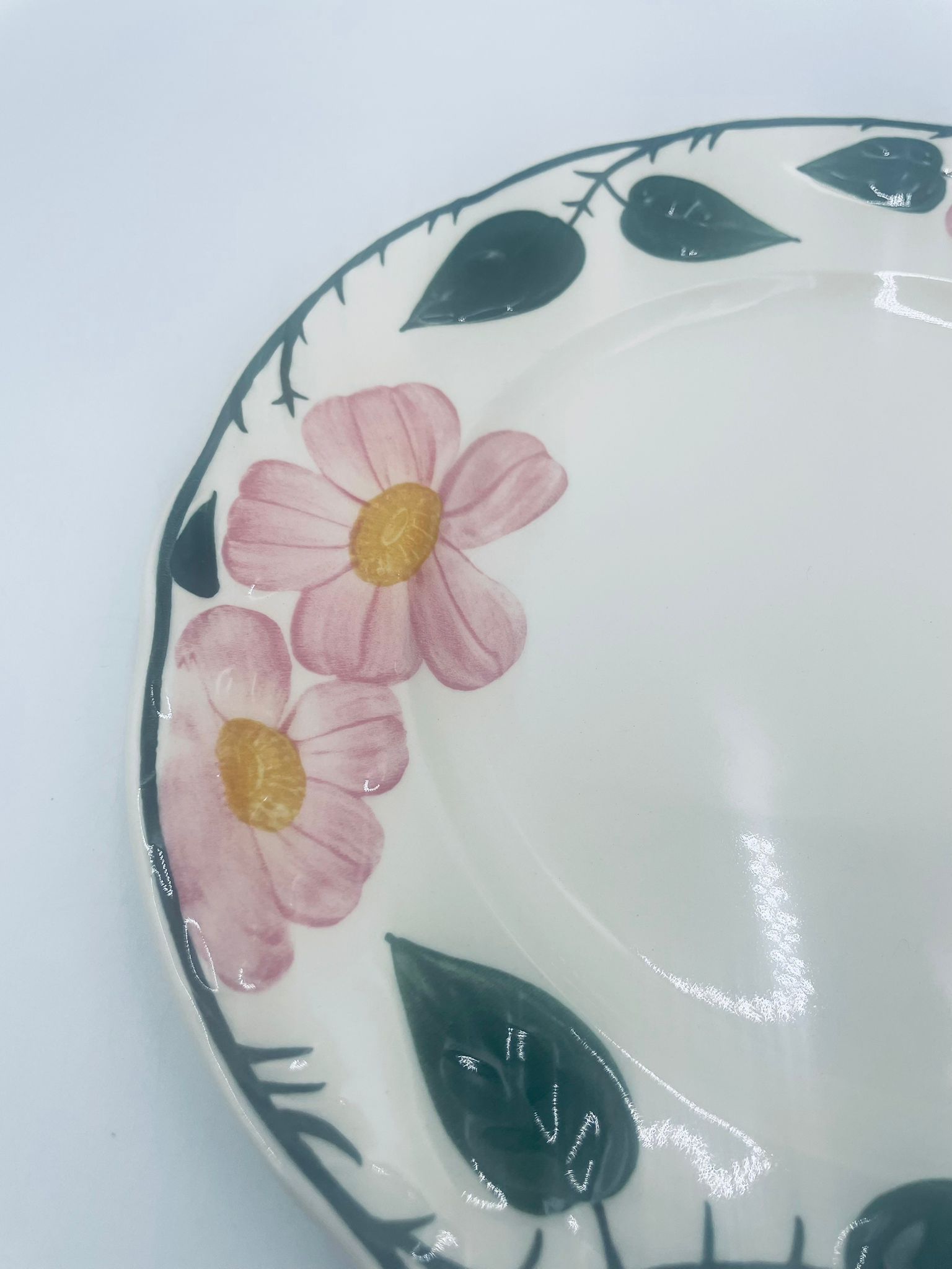 Talerzyk deserowy wytwórni Villeroy & Boch z kolekcji Wildrose zaprojektowany w 1969r, wykonany z wysokiej jakości porcelany w kolorze ecru. Talerz o nieregularnym, falistym rancie z zieloną obwódką, ozdobiony motywem ręcznie malowanych różowych kwiatów i zielonych liści.