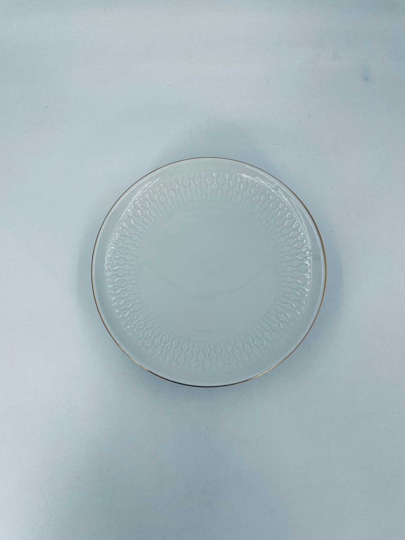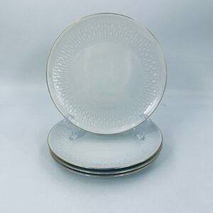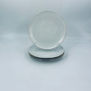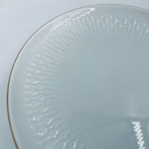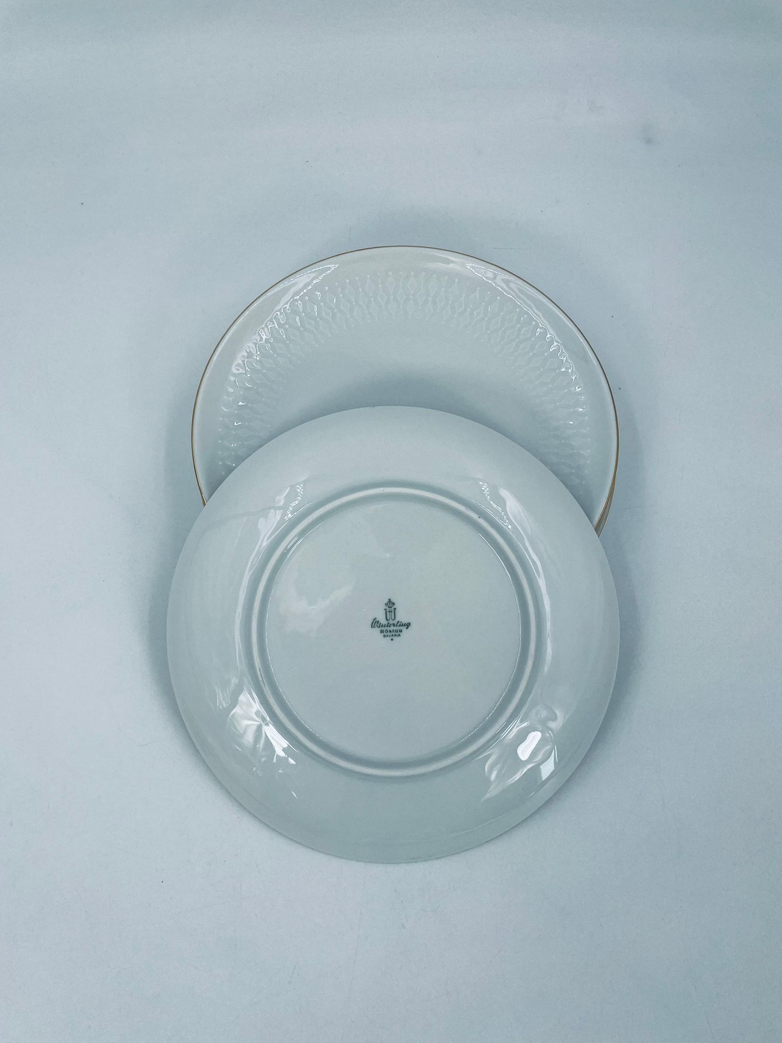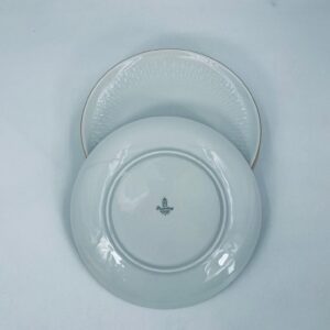 Talerzyk deserowy wytwórni Winterling Röslau, wykonany z białej porcelany z reliefami i złotym zdobieniem na krawędzi.