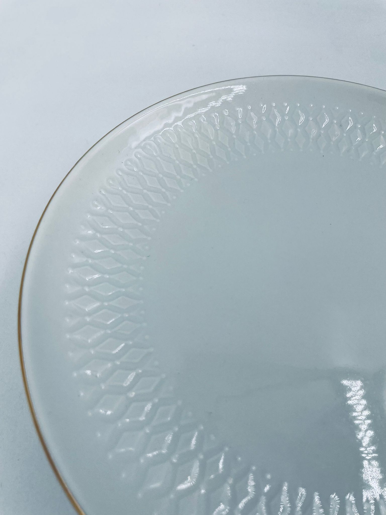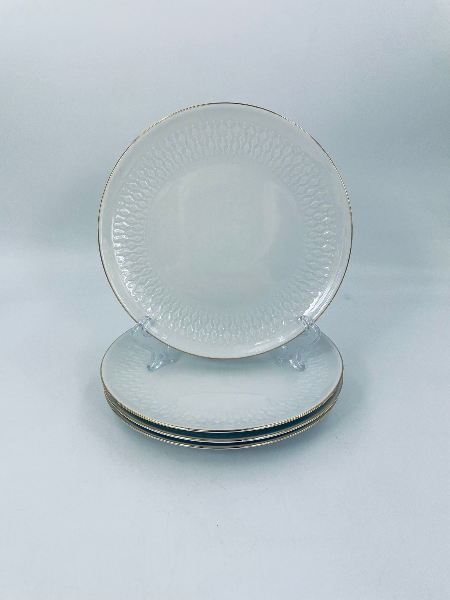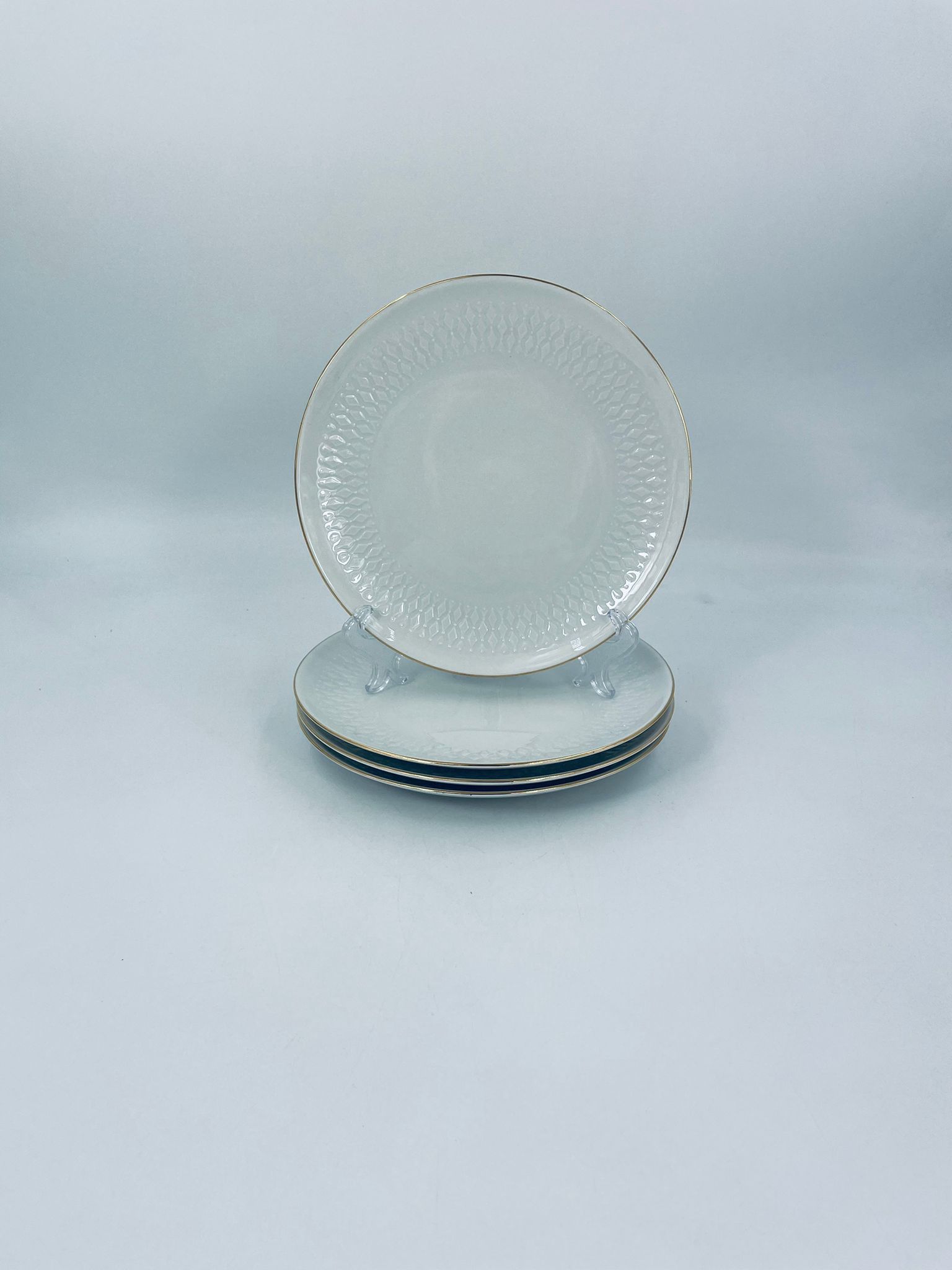 Talerzyk deserowy wytwórni Winterling Röslau, wykonany z białej porcelany z reliefami i złotym zdobieniem na krawędzi.