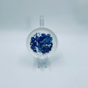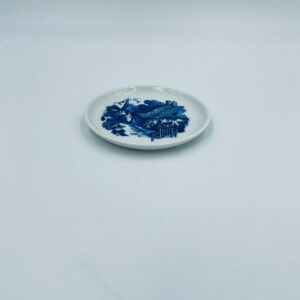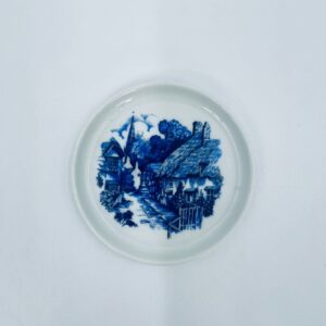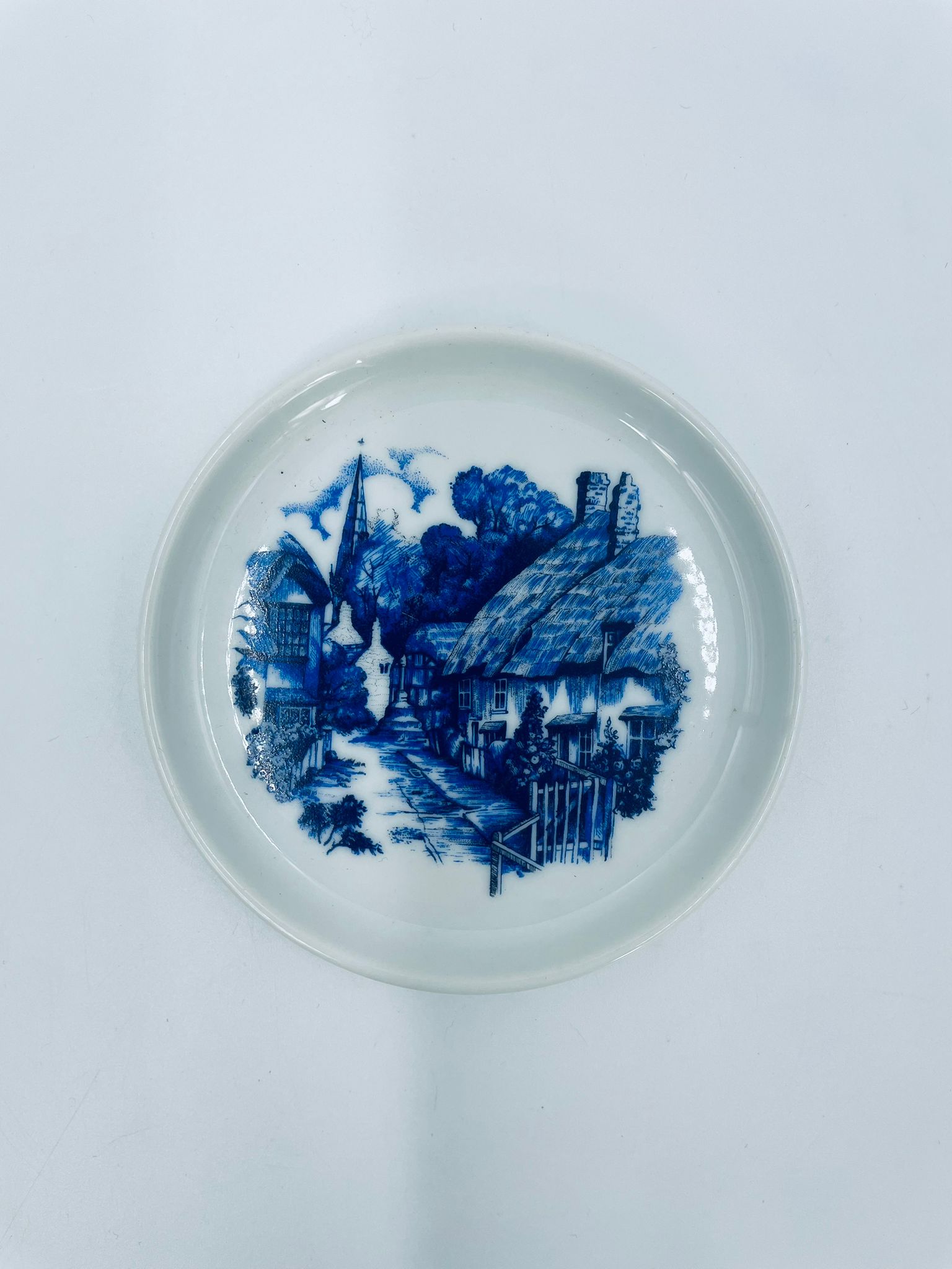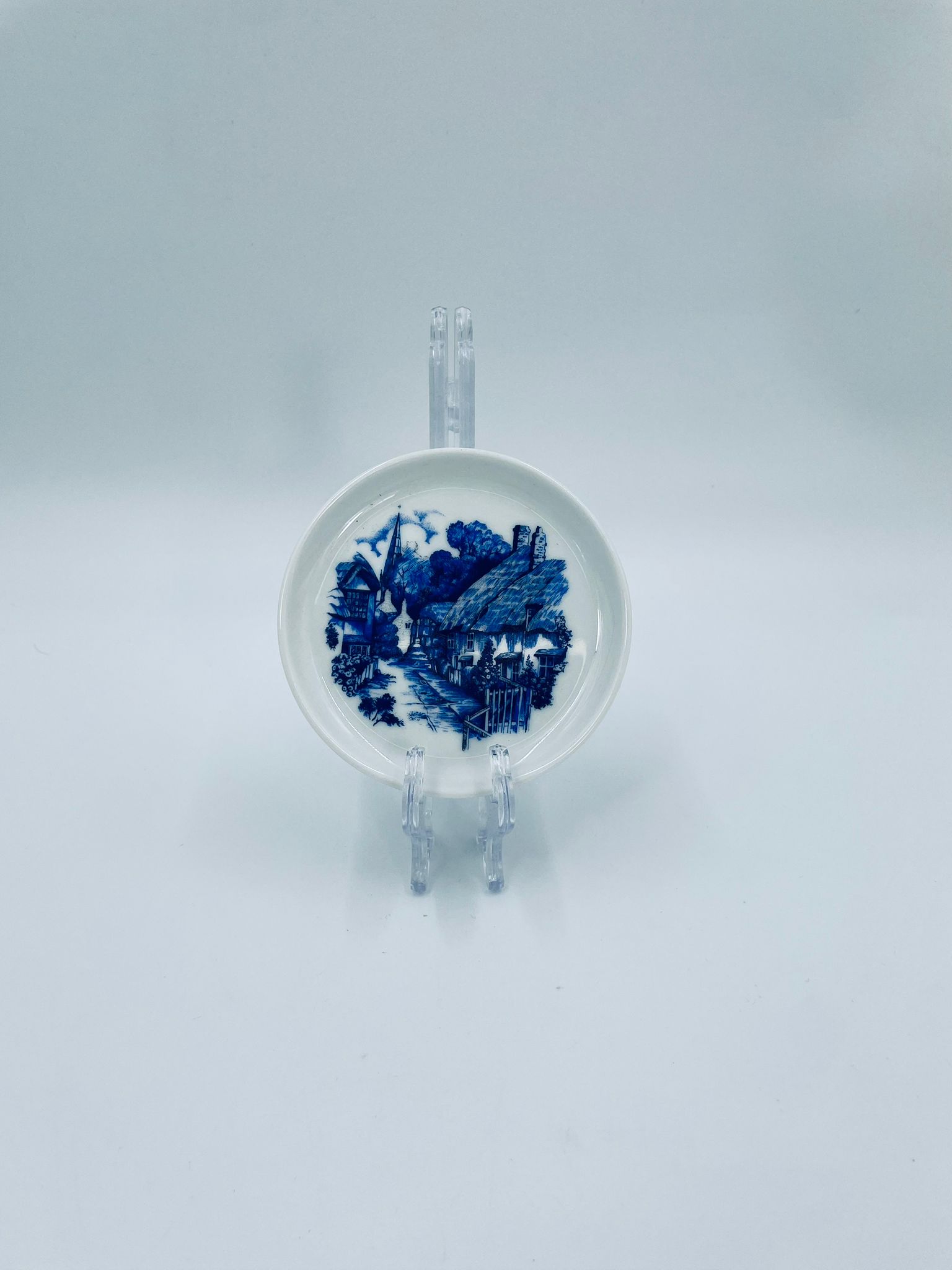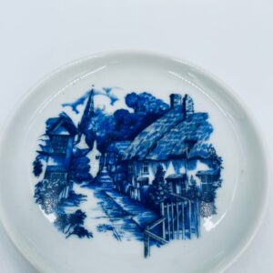 Talerzyk kolekcjonerski wytwórni Furstenberg, wykonany z wysokiej jakości białej porcelany. Talerzyk ozdobiony motywem wiejskiej sceny z chatami krytymi strzechą i kościołem w niebieskiej kolorystyce.
