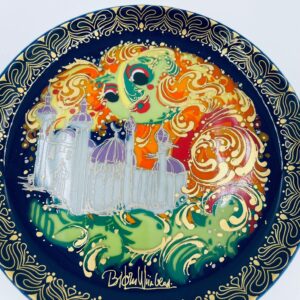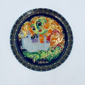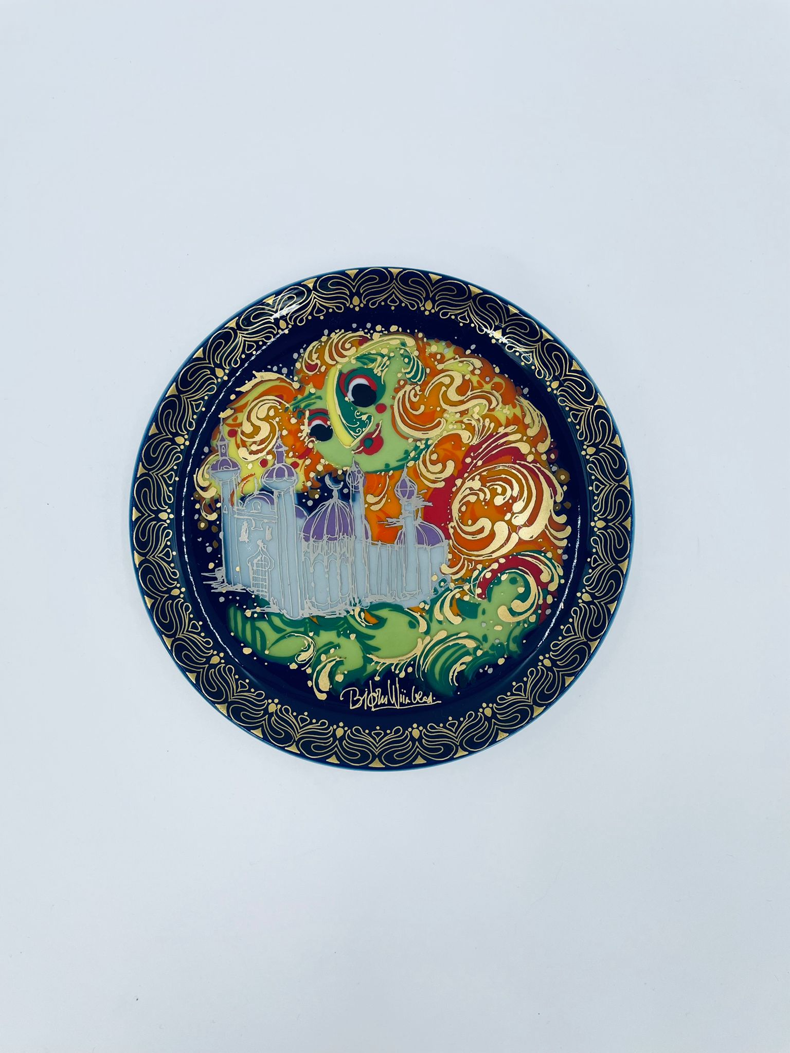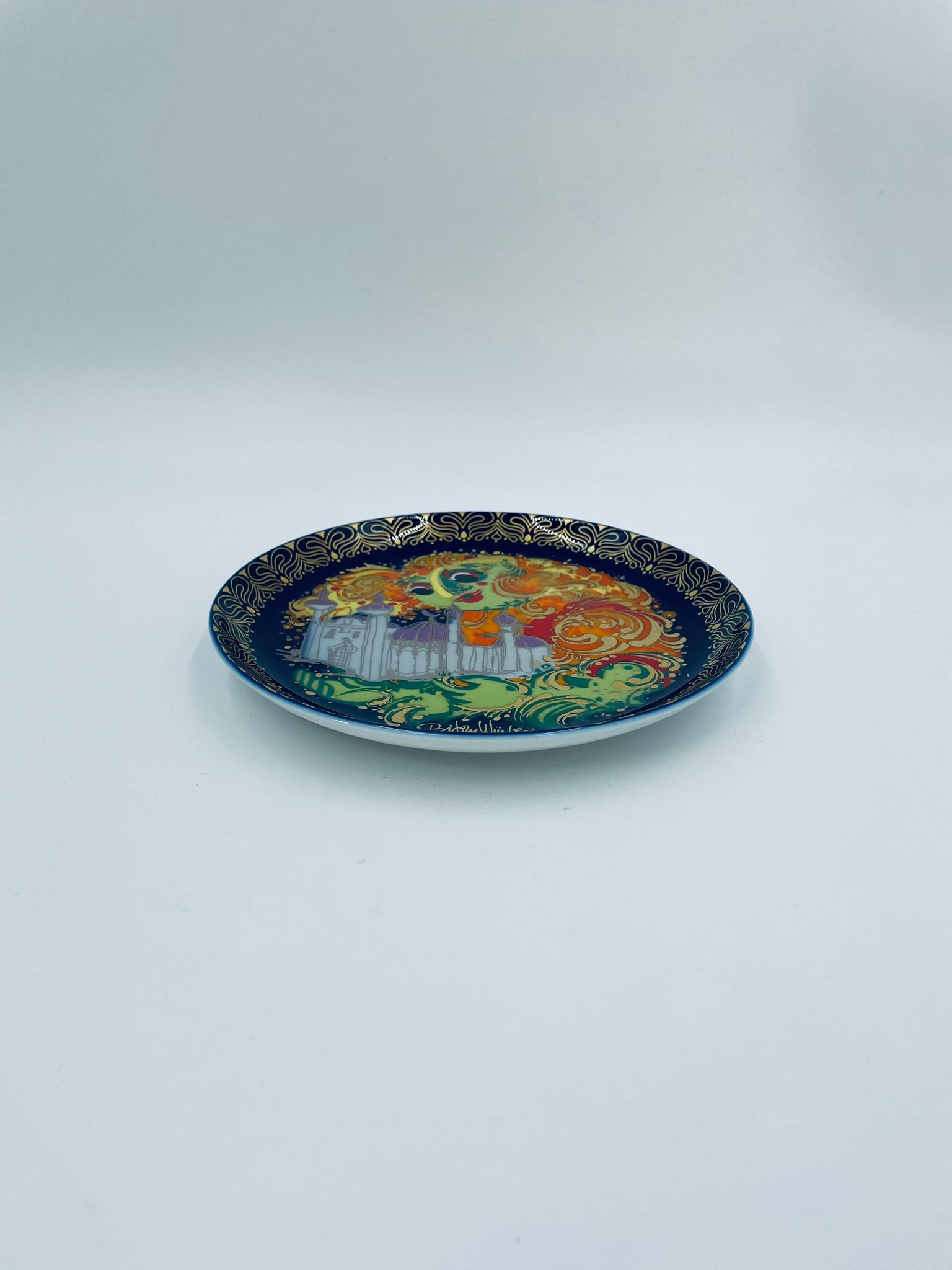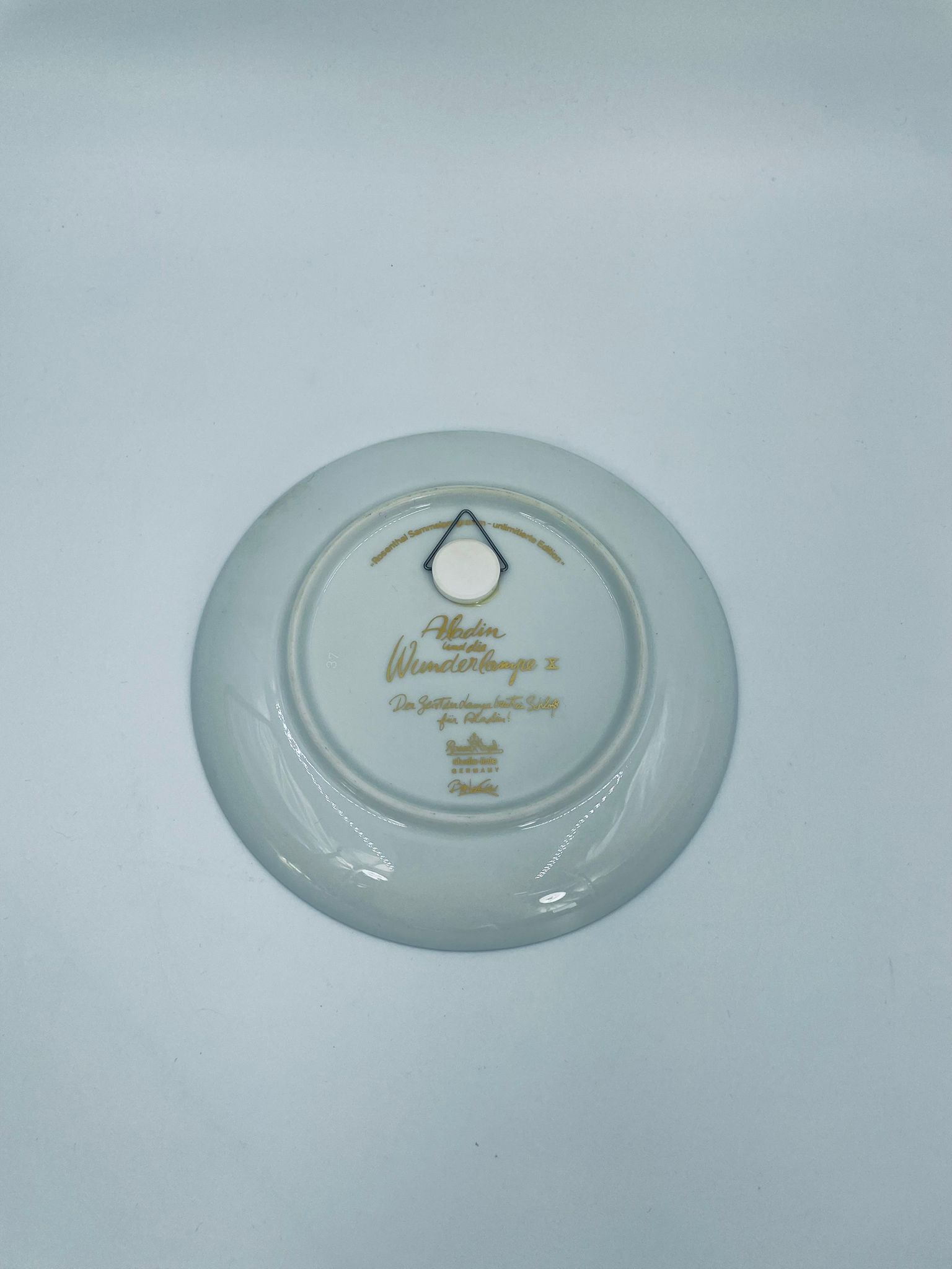 Talerzyk kolekcjonerski renomowanej wytwórni Rosenthal, z limitowanej edycji seri „Aladyn i magiczna lampa”, zaprojektowany przez duńskiego artystę Bjorna Wiinblada, wykonany z wysokiej jakości porcelany. Talerz nr X przedstawiający scenę „Der Geist der Lampe baut win Schloss fur Aladin” (dżin z lampy buduje zamek dla aladyna).
