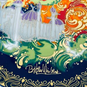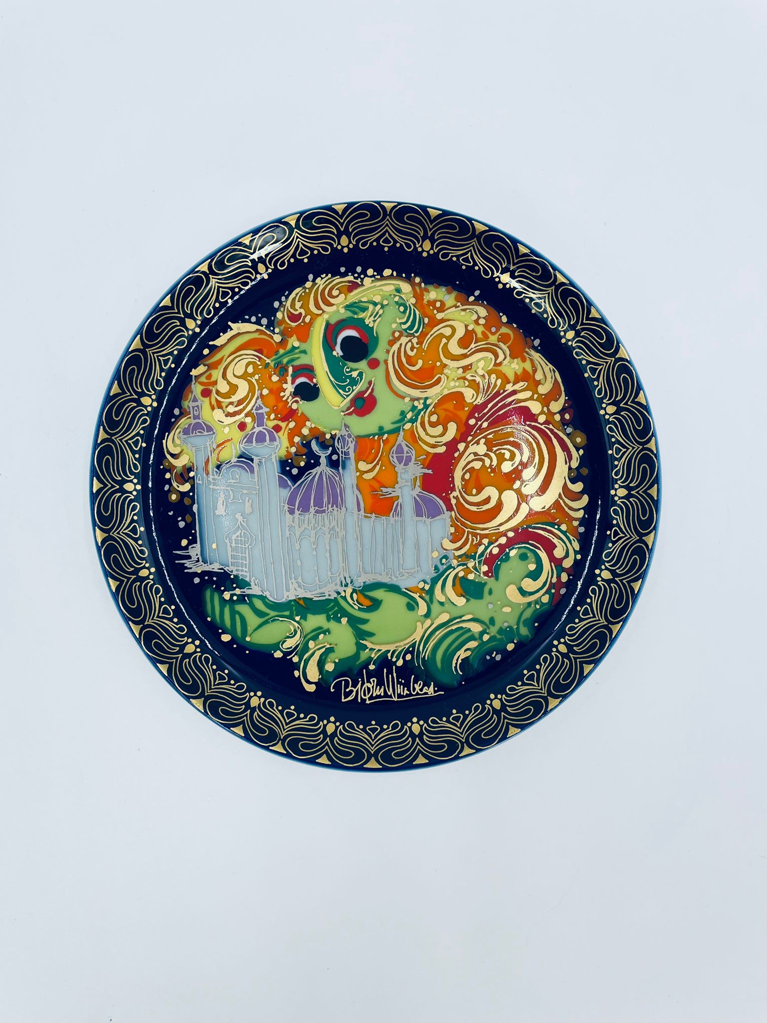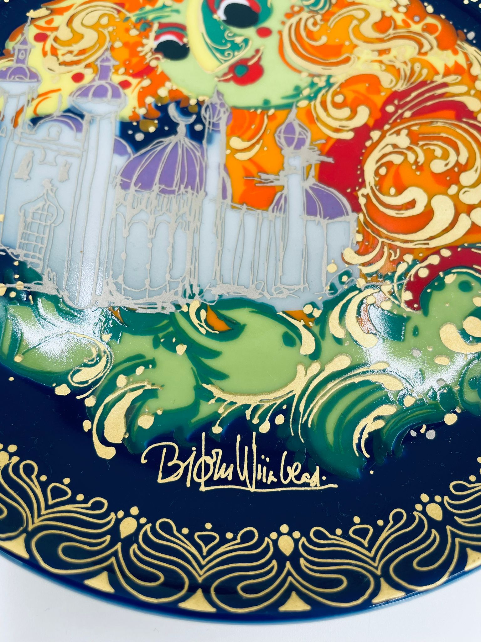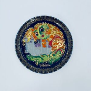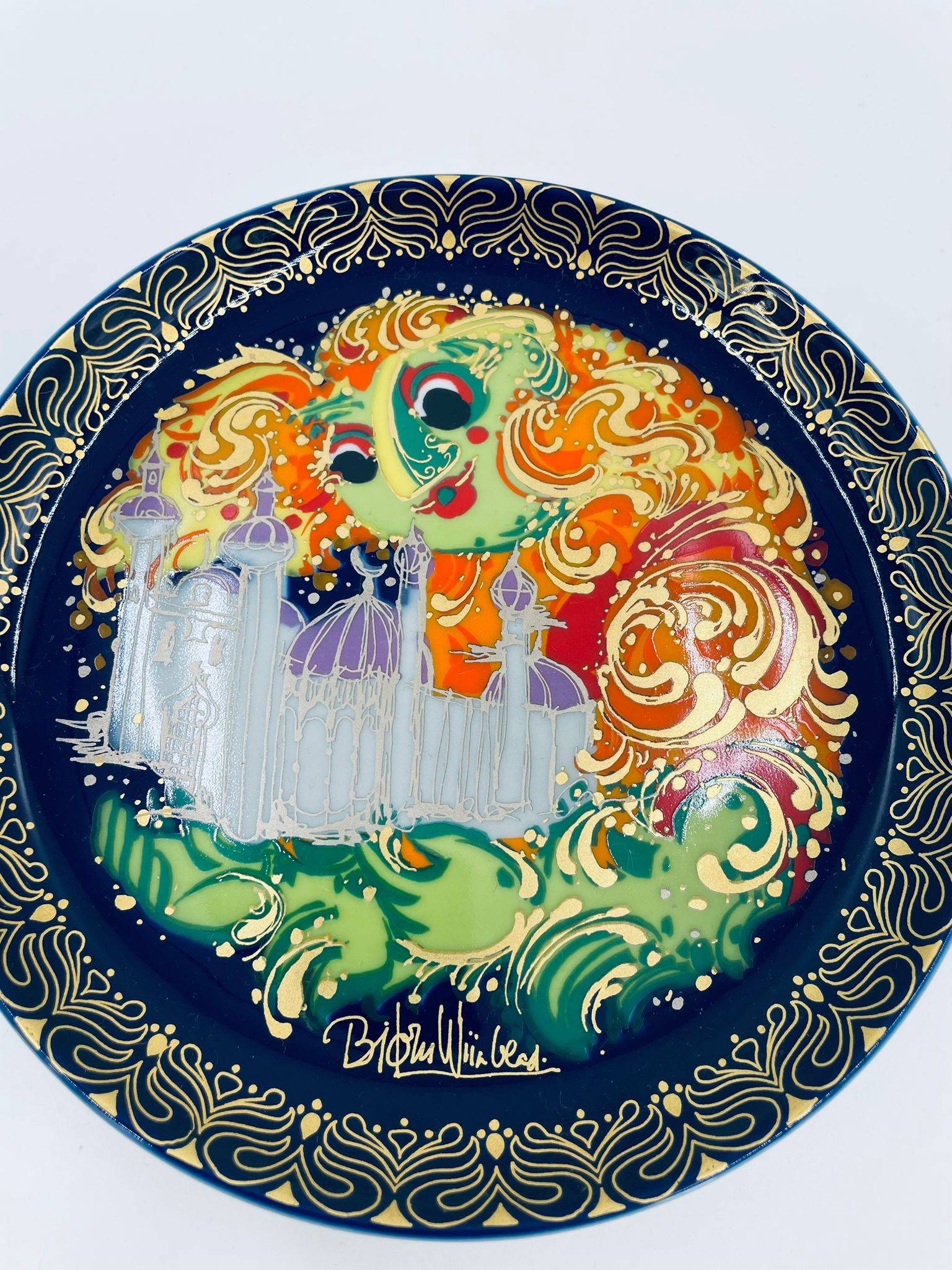 Talerzyk kolekcjonerski renomowanej wytwórni Rosenthal, z limitowanej edycji seri „Aladyn i magiczna lampa”, zaprojektowany przez duńskiego artystę Bjorna Wiinblada, wykonany z wysokiej jakości porcelany. Talerz nr X przedstawiający scenę „Der Geist der Lampe baut win Schloss fur Aladin” (dżin z lampy buduje zamek dla aladyna).