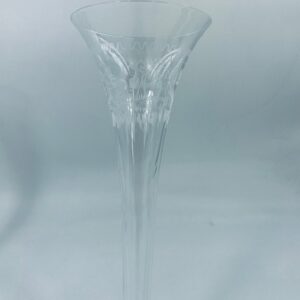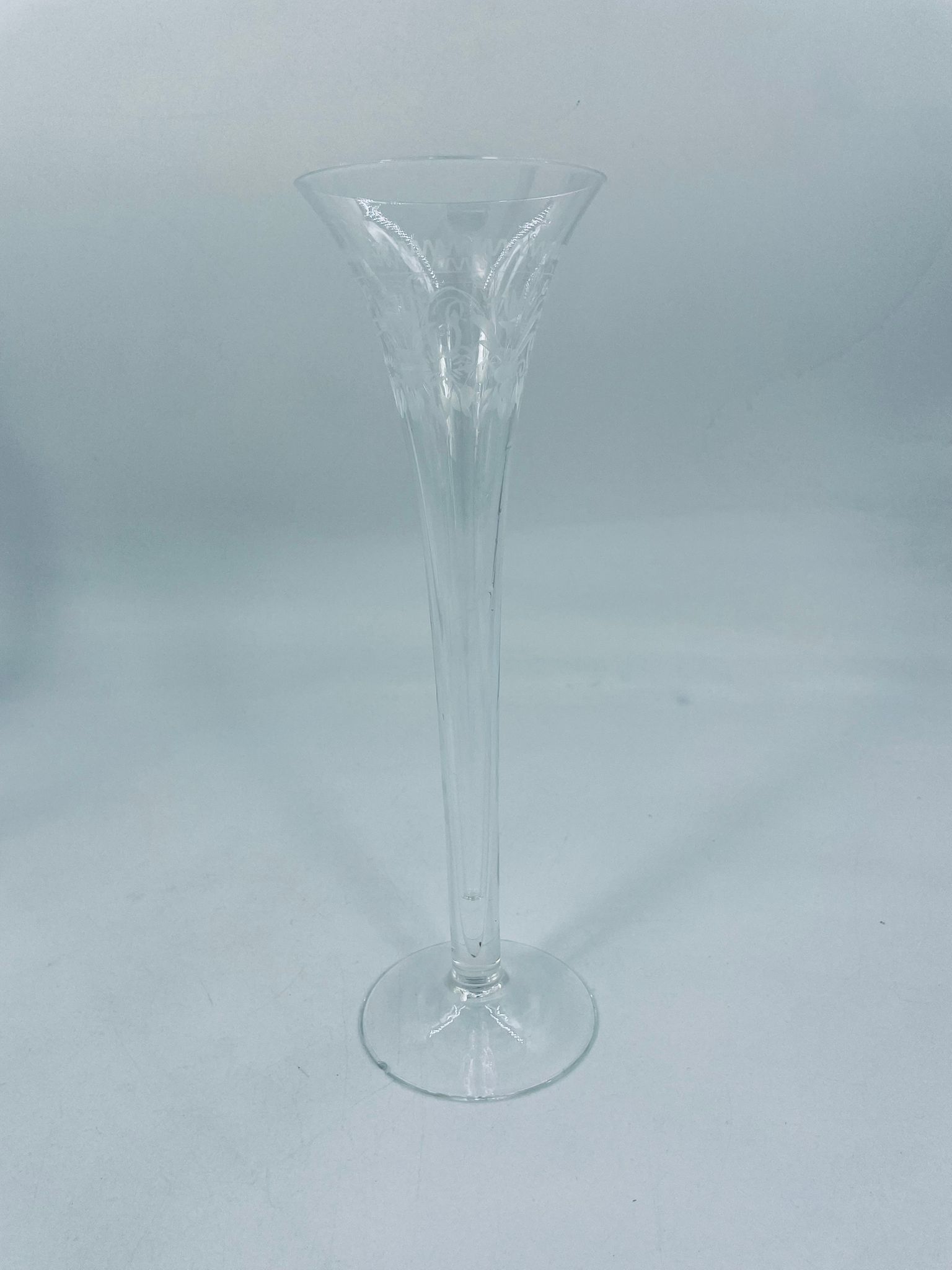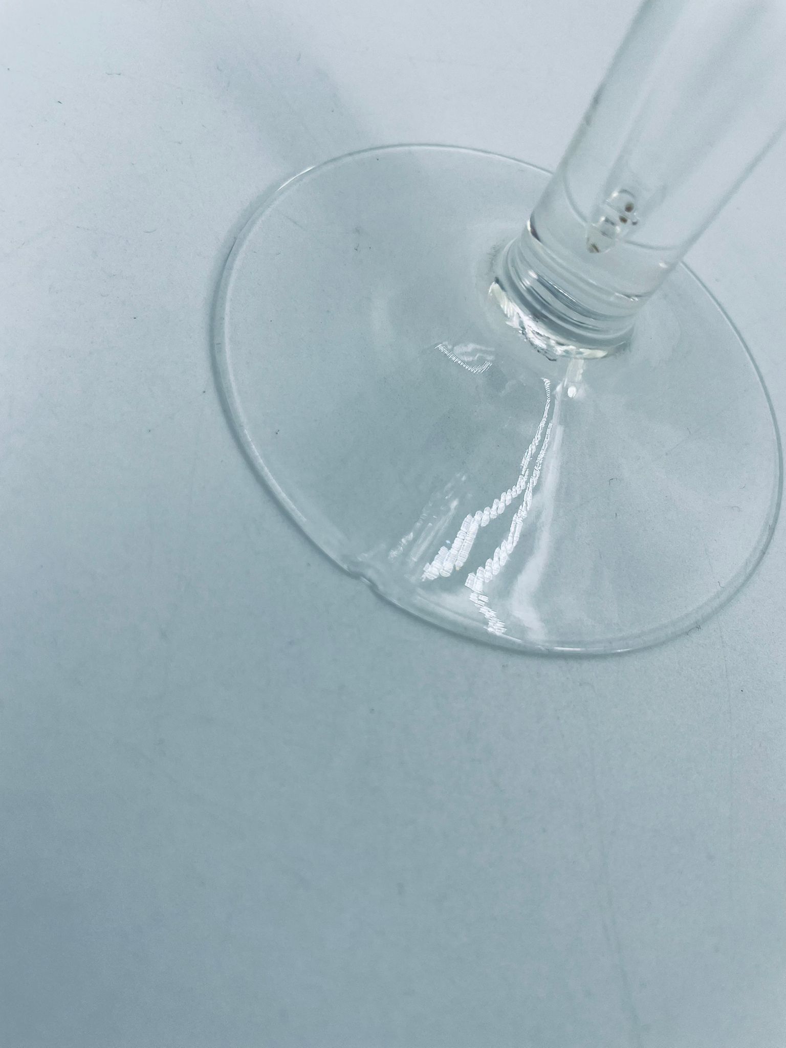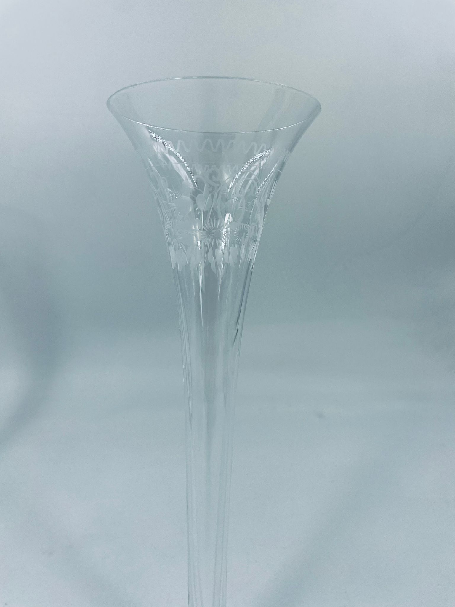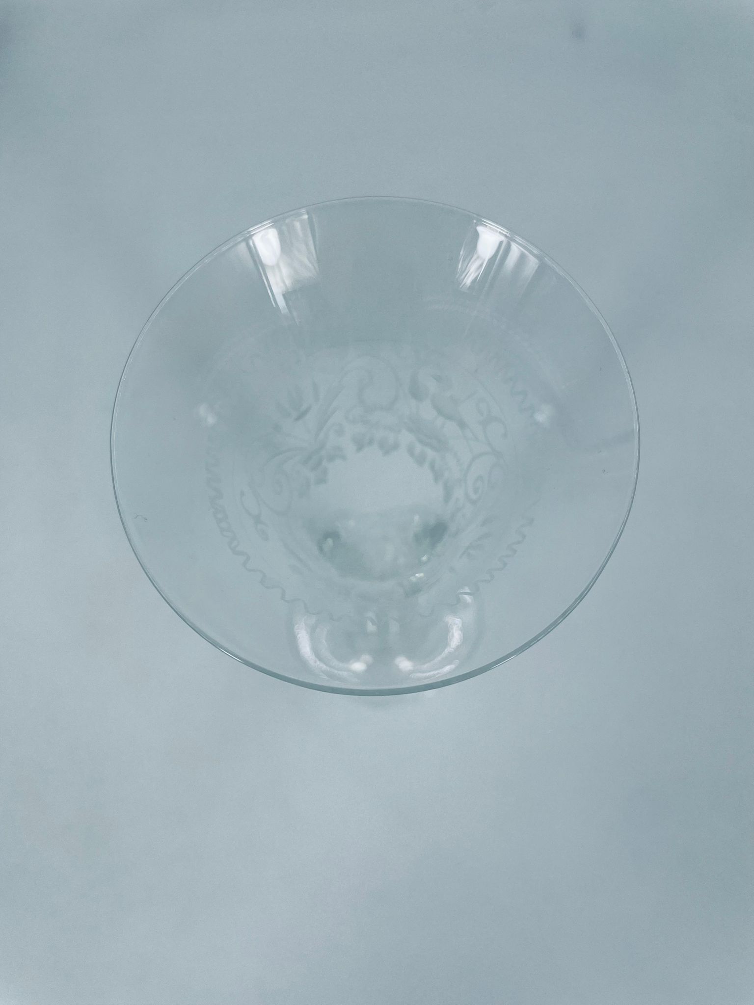 Crystal champagne glass by the Theresienthal label, transparent with an interesting hand-engraved design. One glass has a delicate dent, hardly visible.