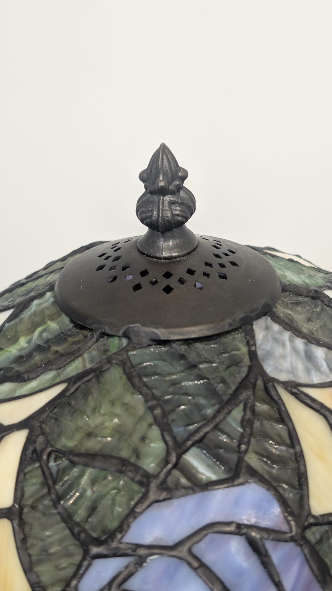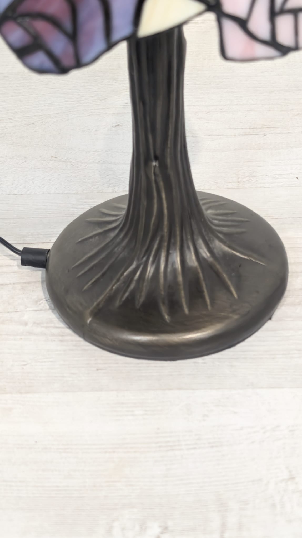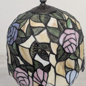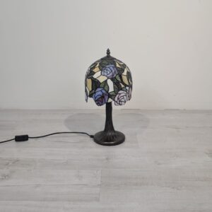 A stylish Tiffany-style table lamp. Made of dark, metallic material, which gives it an elegant look. The lamp has a carved base that adds character. It is perfect as an interior decoration or practical lighting in any room.