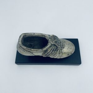 Silver-plated metal sculpture on a wooden base.