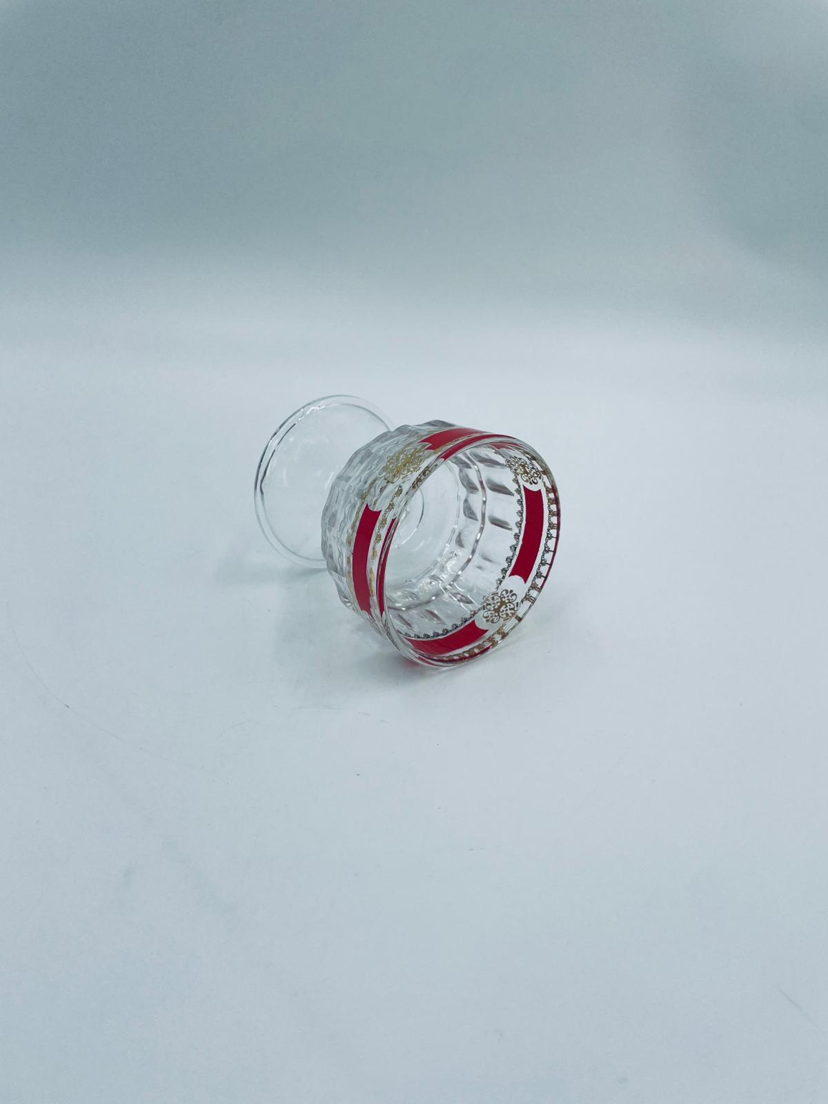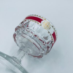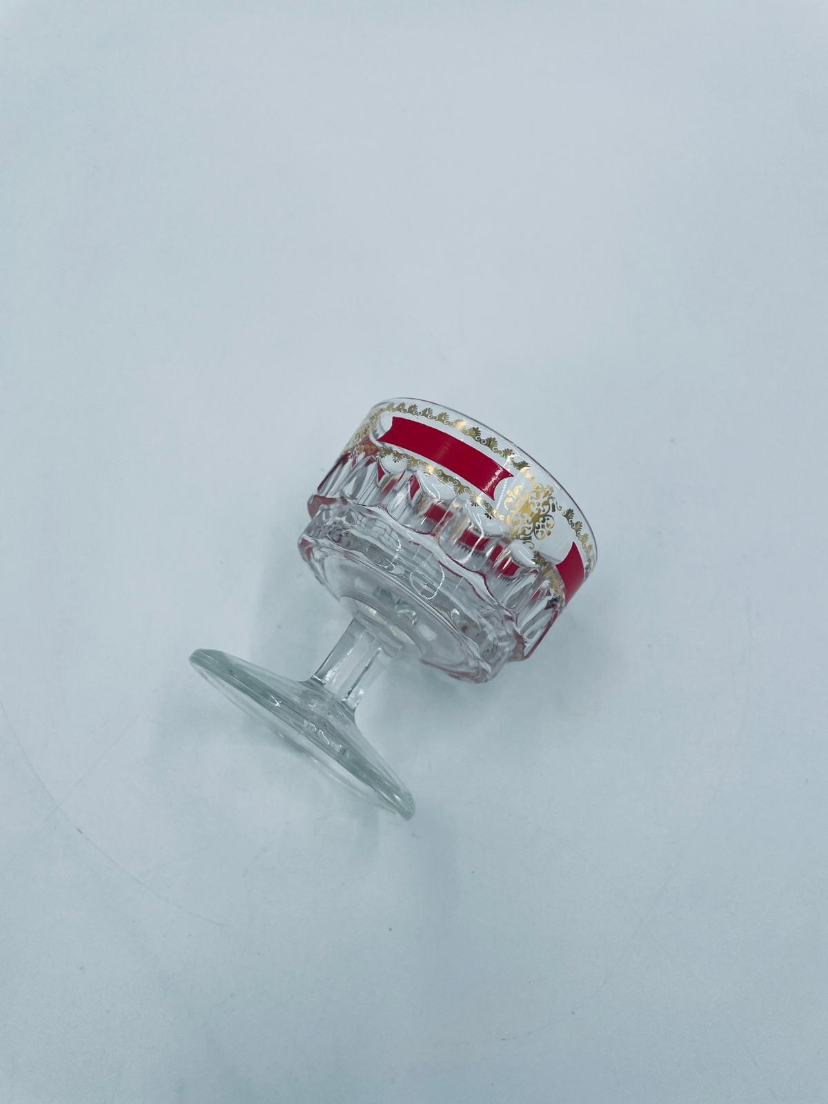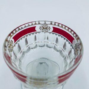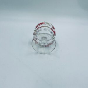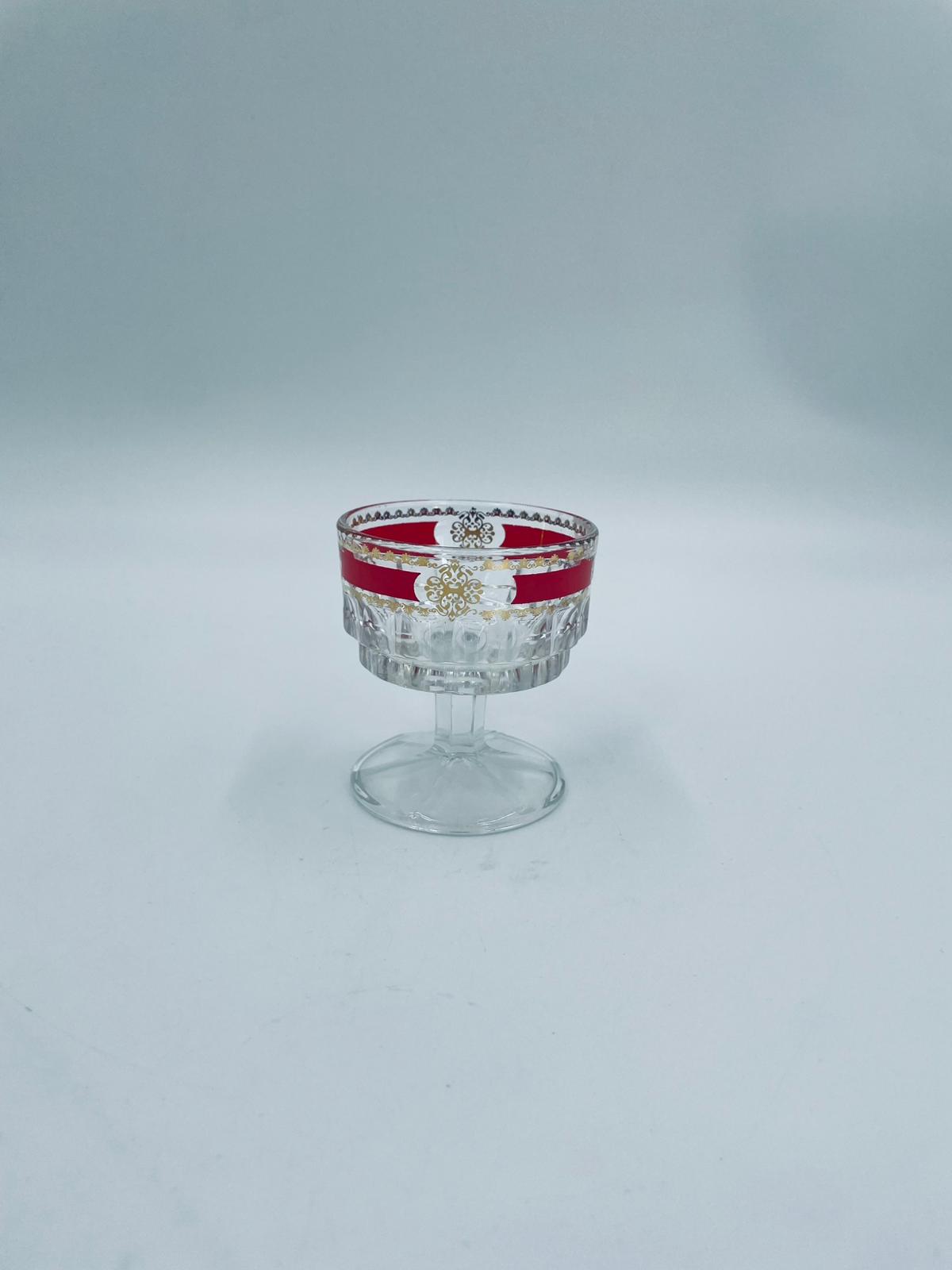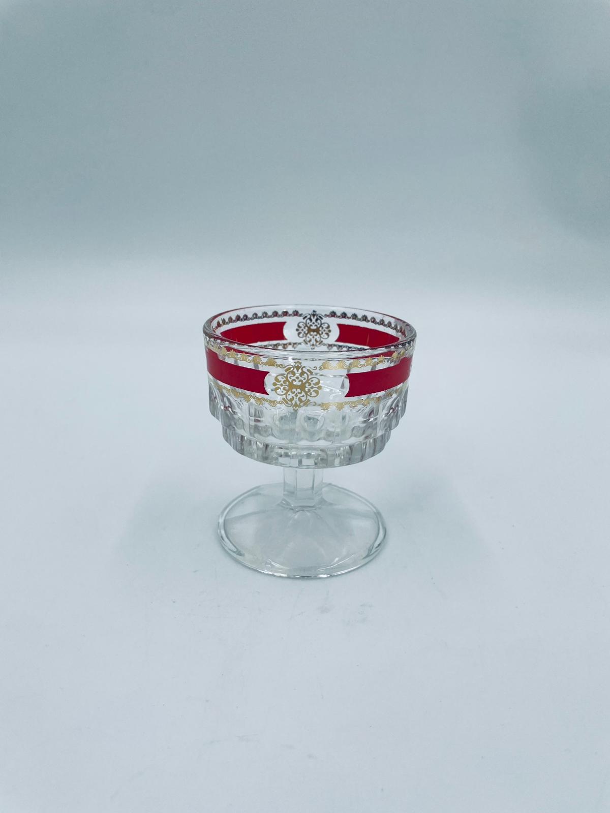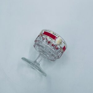 Unikatowy kieliszek do likieru Włoski, wykonany z wysokiej jakości szkła kryształowego. Kieliszek charakteryzuje się ozdobną, fasetowana czaszą z czerwonym paskiem i złotymi akcentami, posiada krótką nóżkę i stabilną podstawę.
