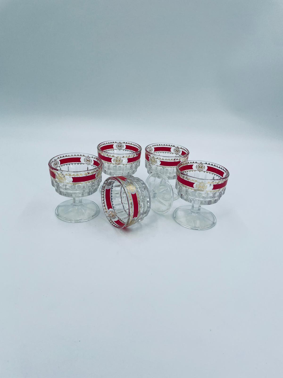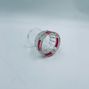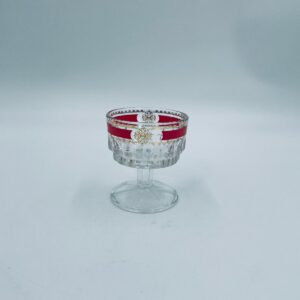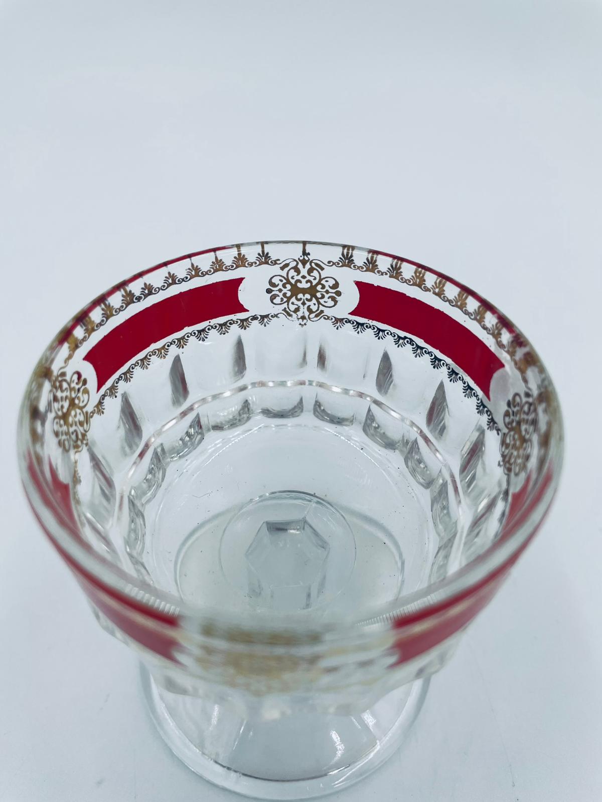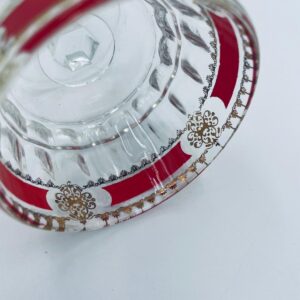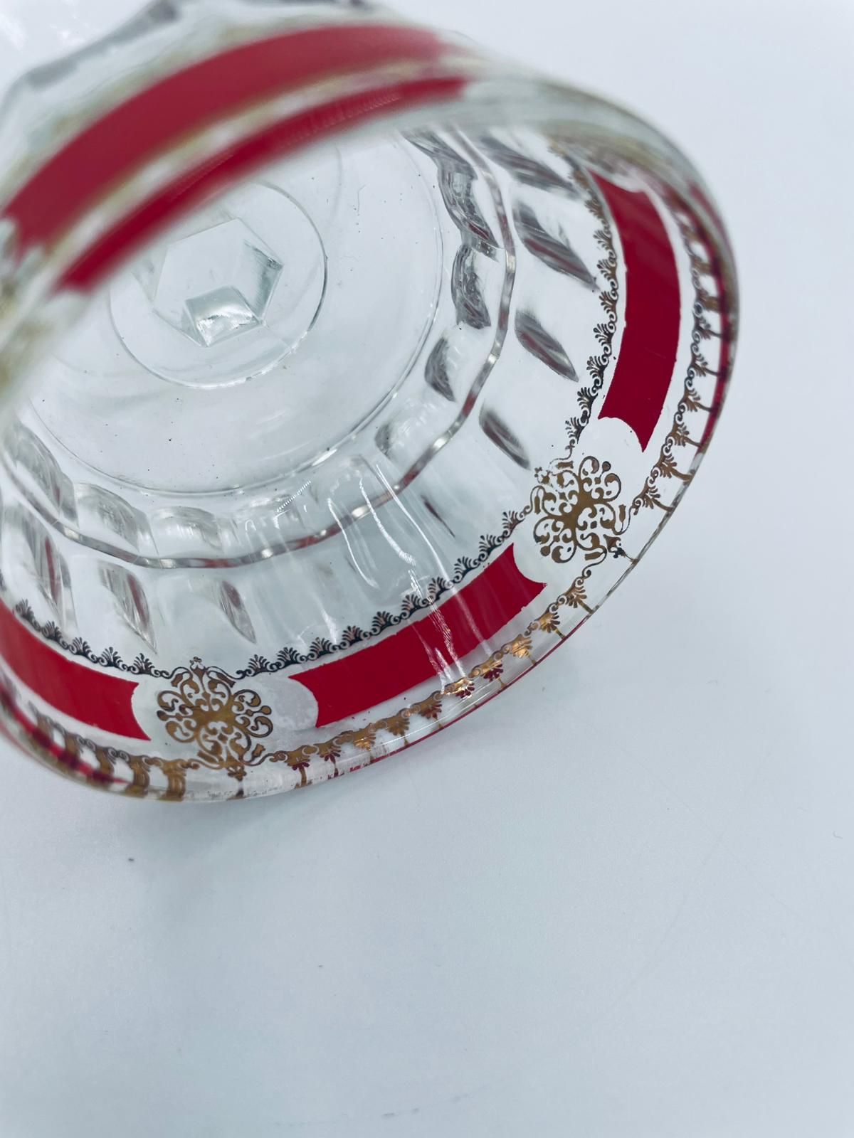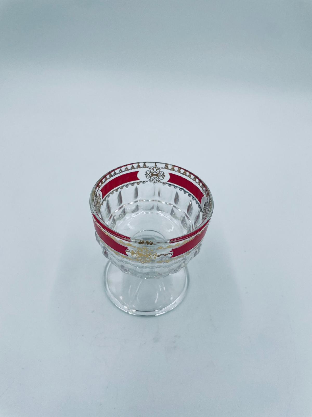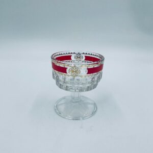 Unikatowy kieliszek do likieru Włoski, wykonany z wysokiej jakości szkła kryształowego. Kieliszek charakteryzuje się ozdobną, fasetowana czaszą z czerwonym paskiem i złotymi akcentami, posiada krótką nóżkę i stabilną podstawę.
