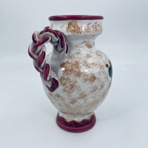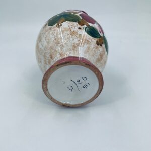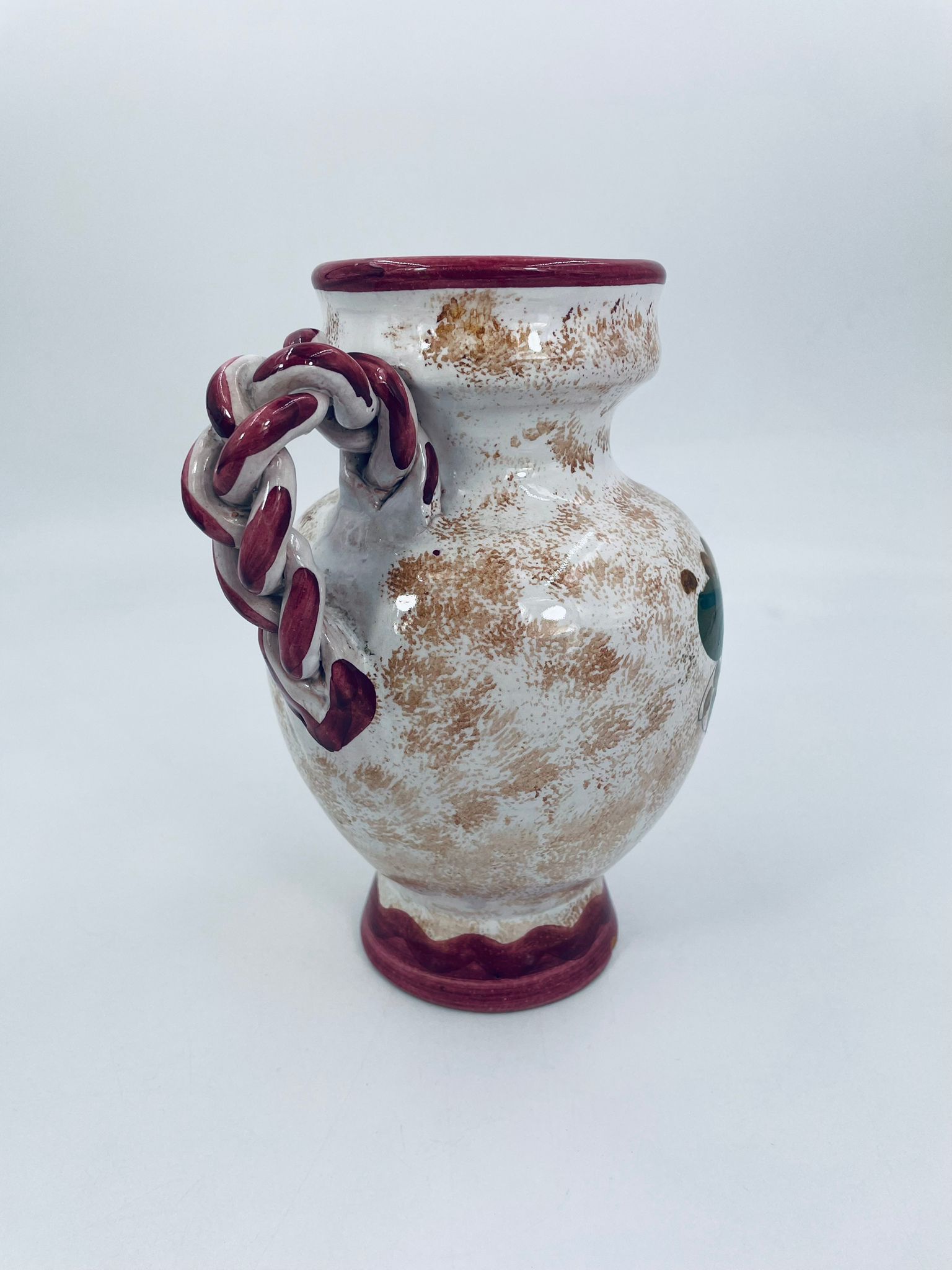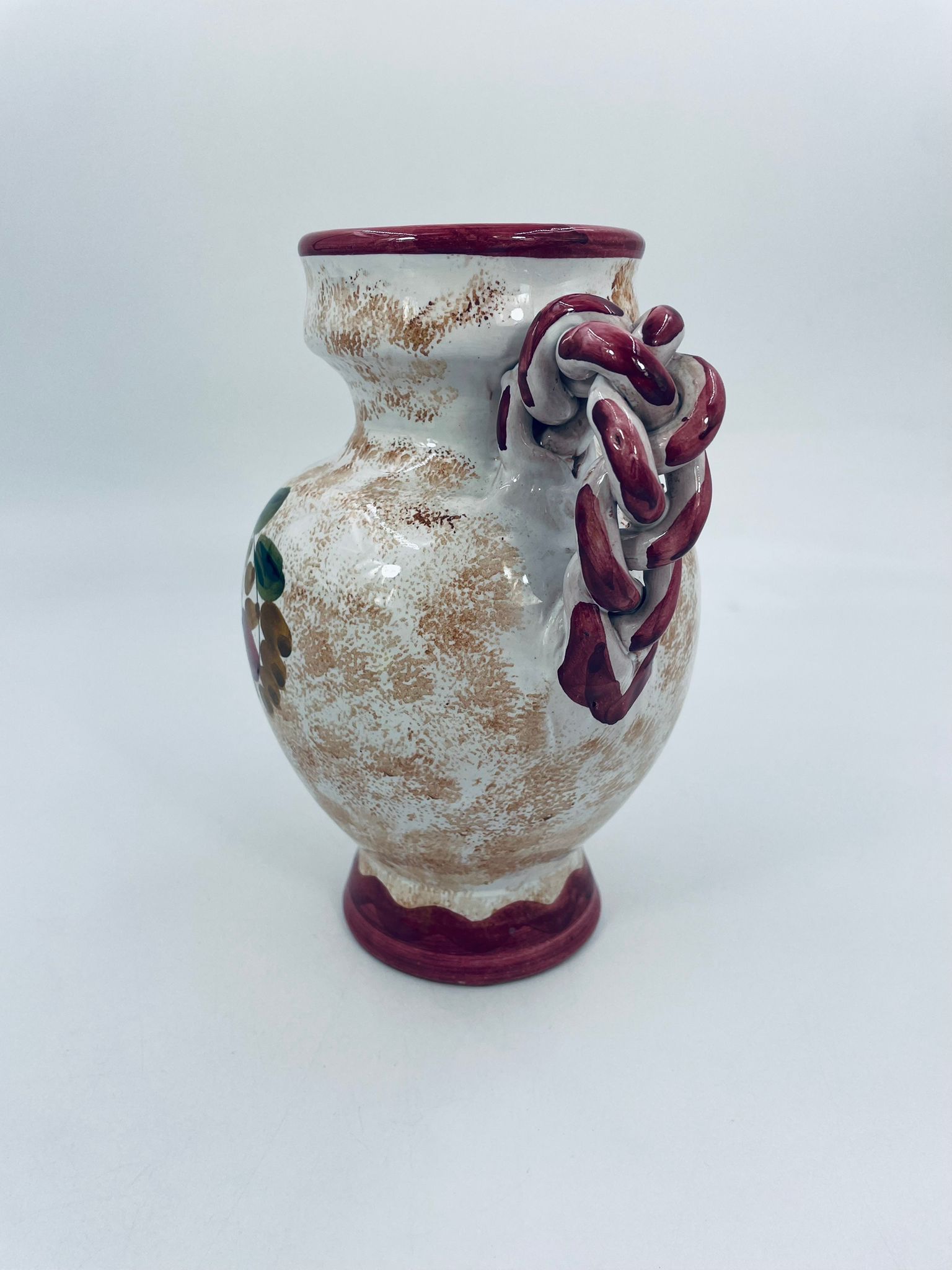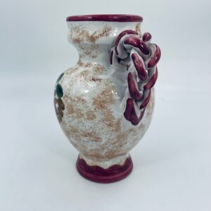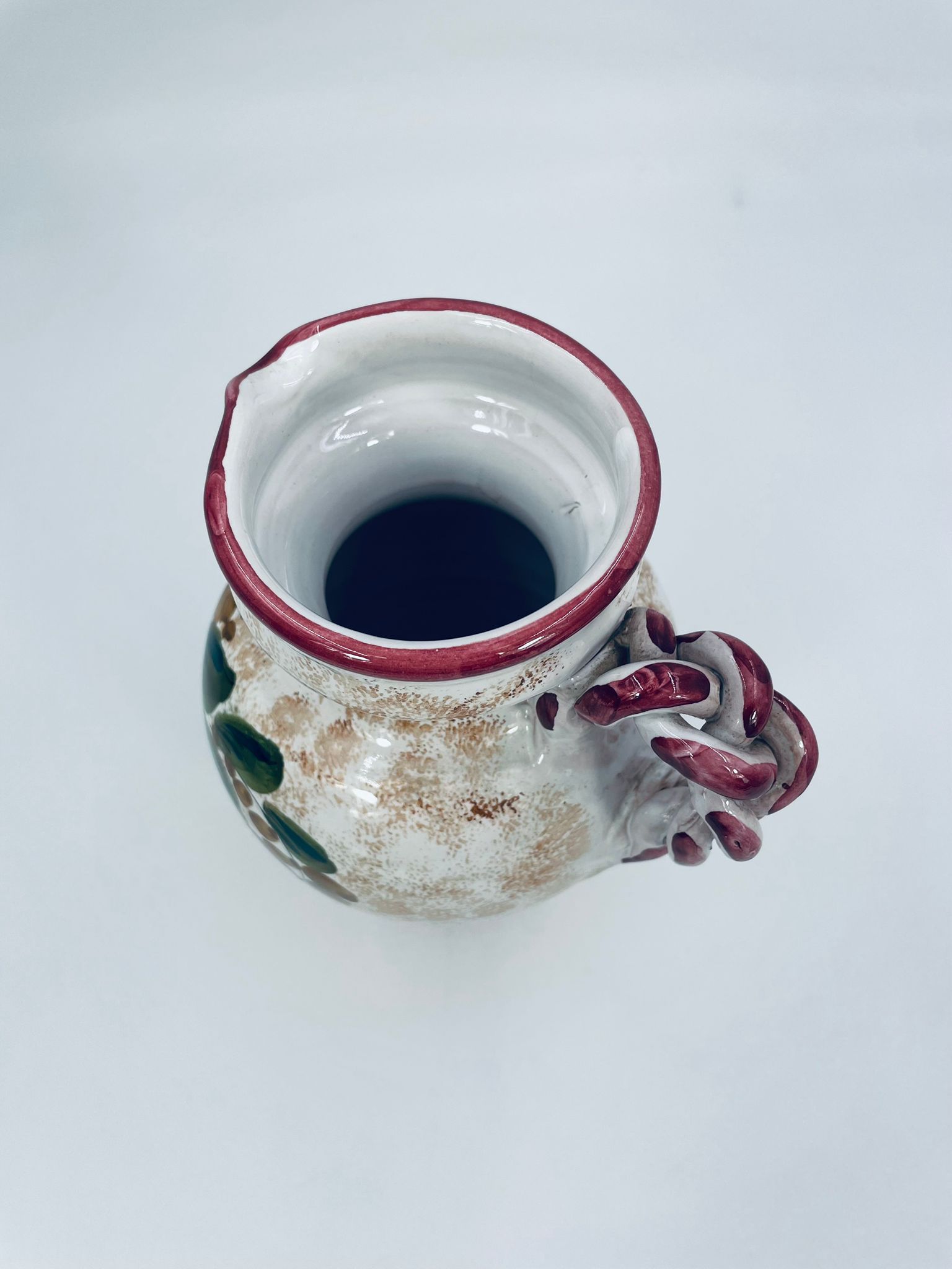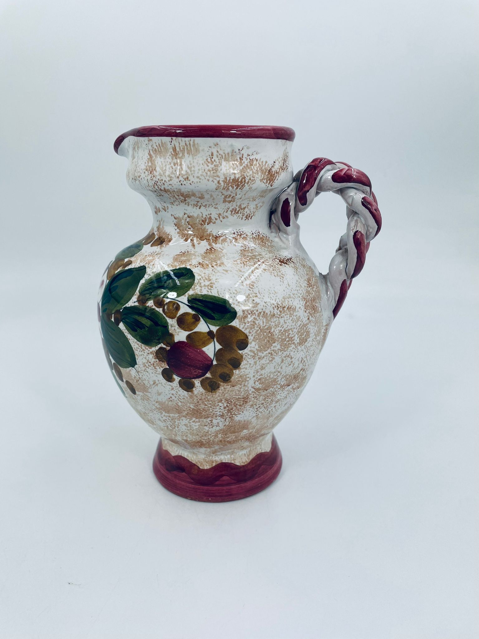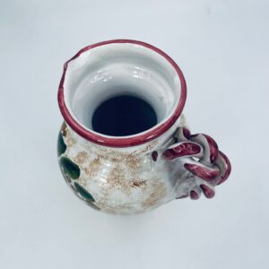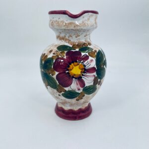 Vintage style Italian ceramic jug. Hand-painted with a flower motif , in intense maroon and green colours. The jug can be used to serve drinks or as a decorative piece. It has a small dent on the base.