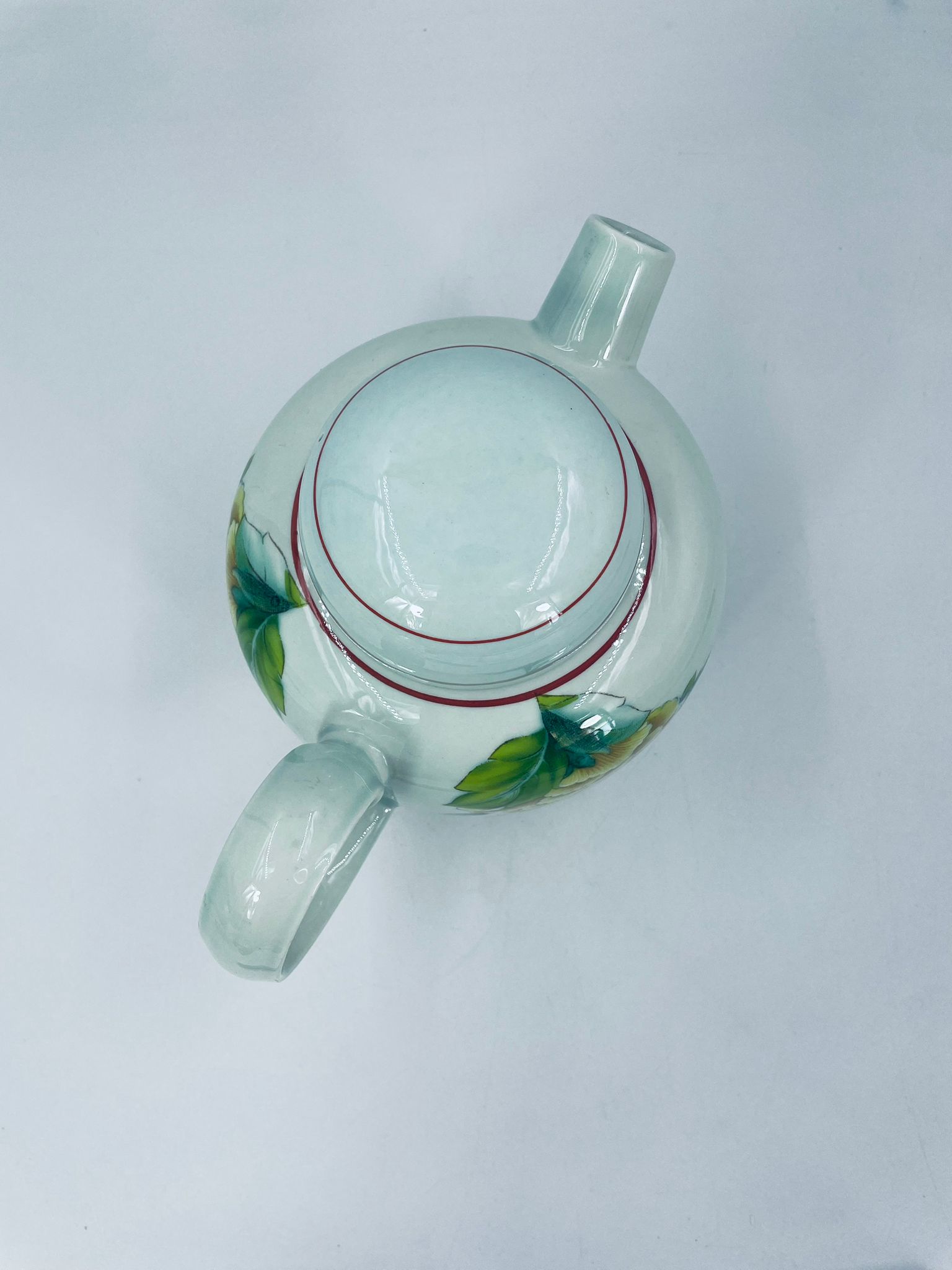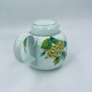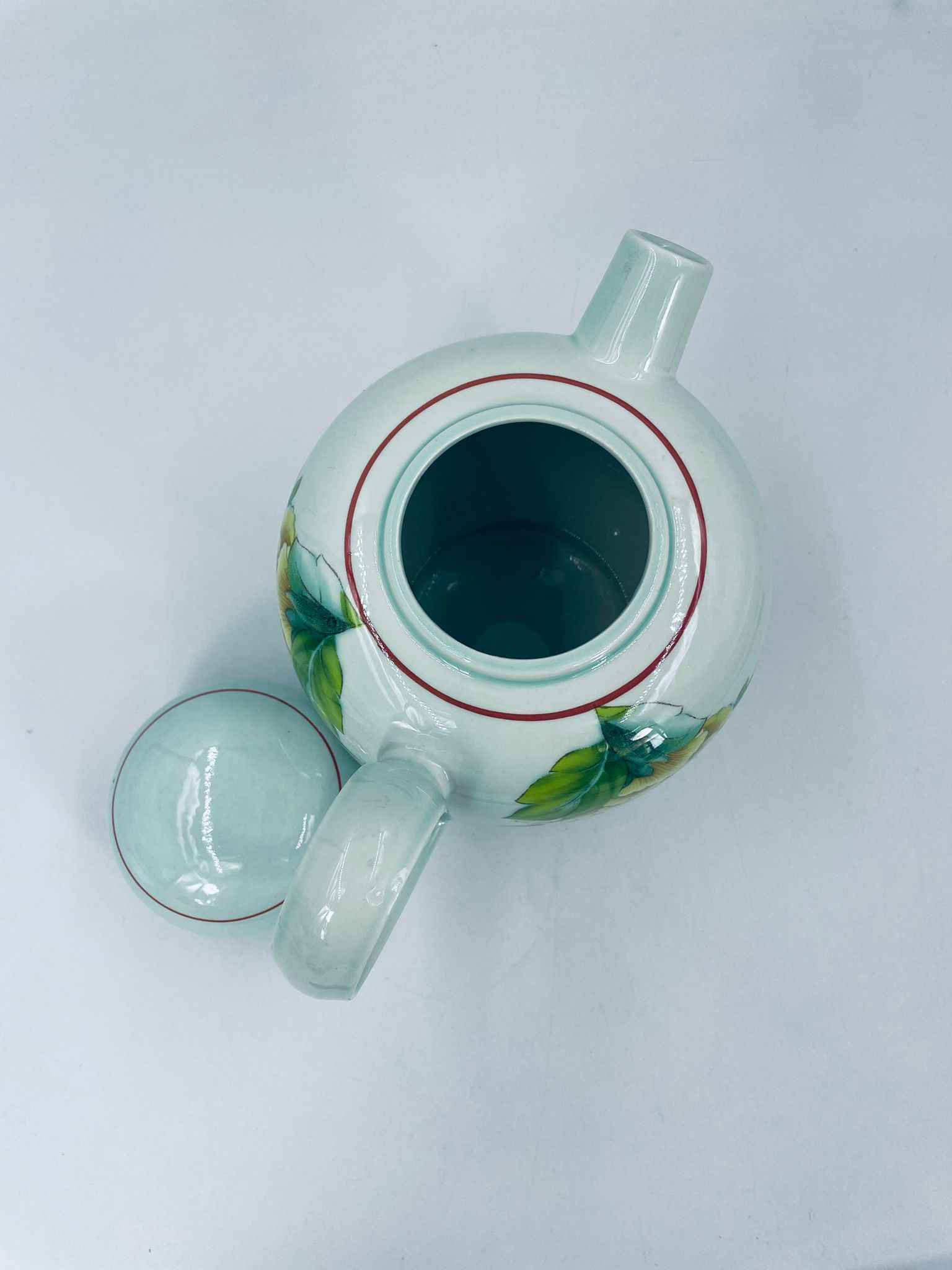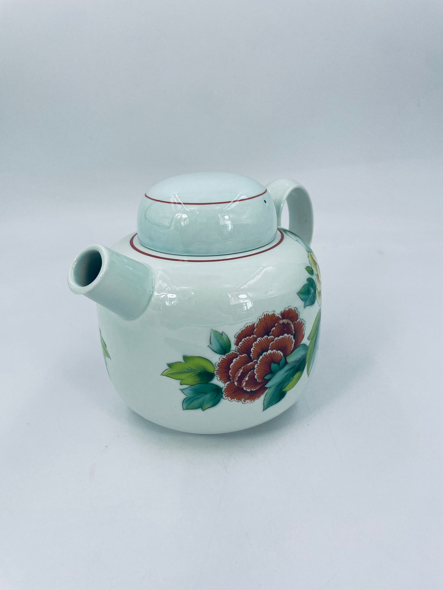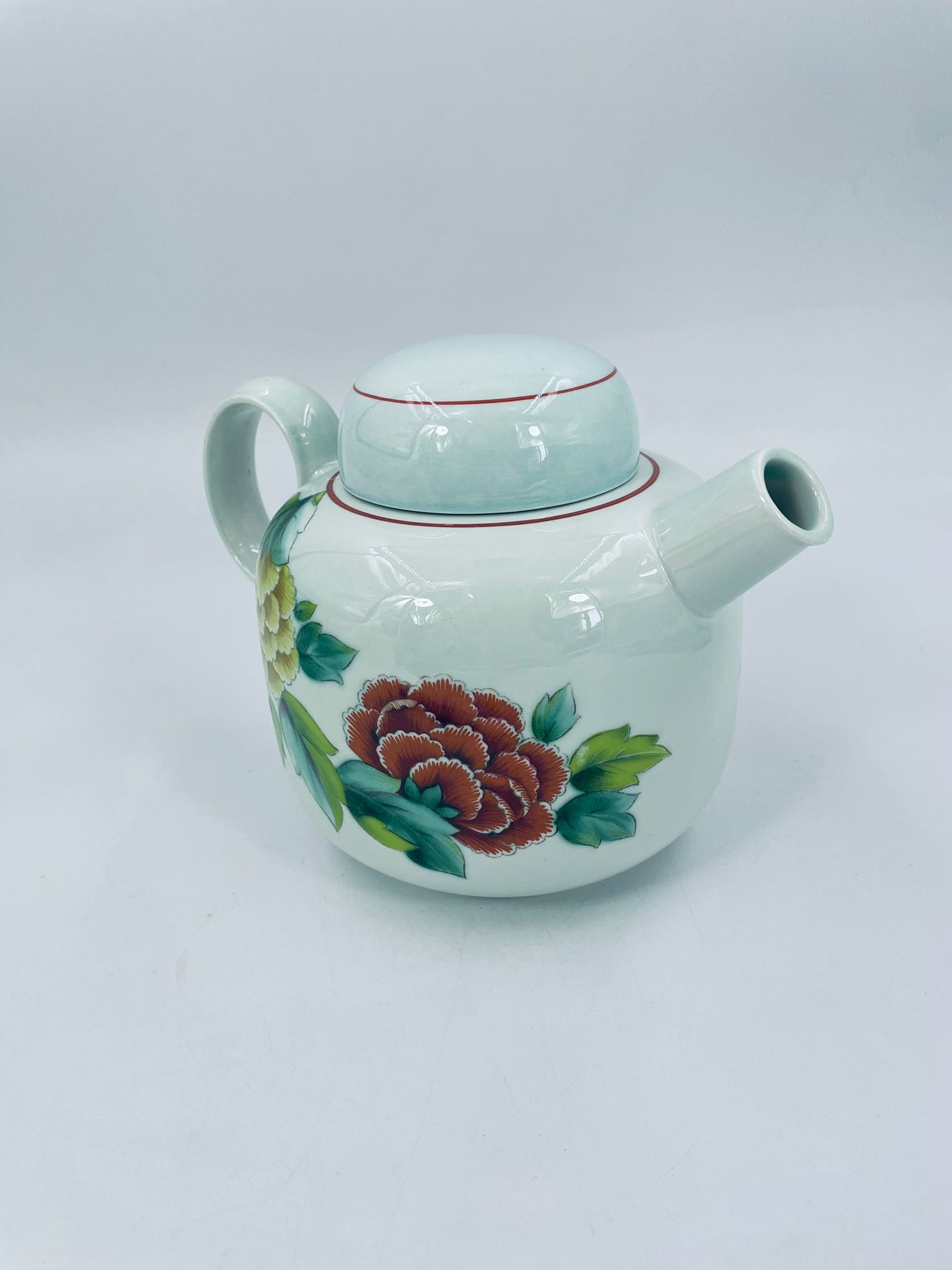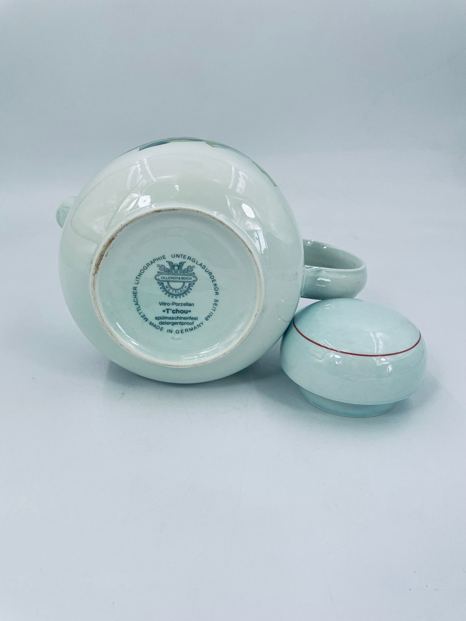 Teapot by the renowned Villeroy Boch mattlacher lithographie label. The T'chou teapot is a design characterised by a light green background and a decoration of red and yellow chrysanthemums with green leaves, finished with a thin red stripe around the edge.