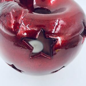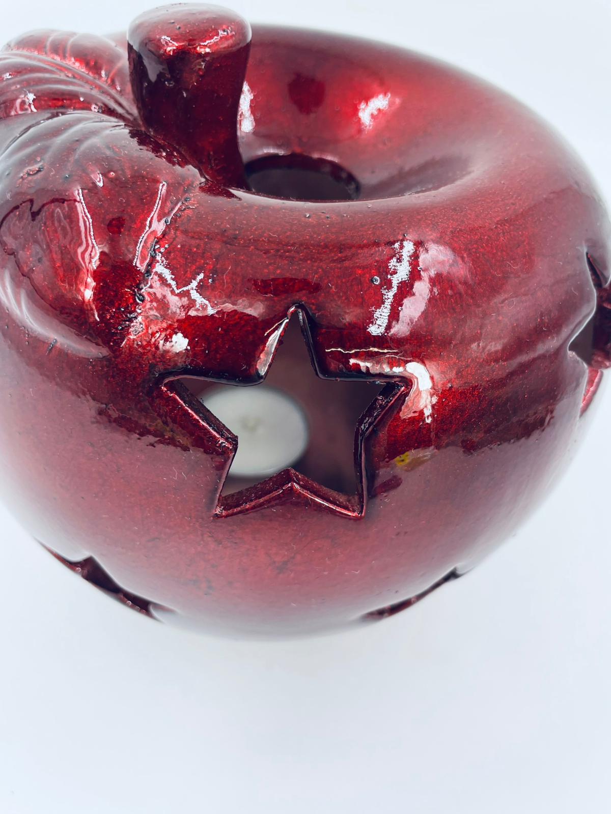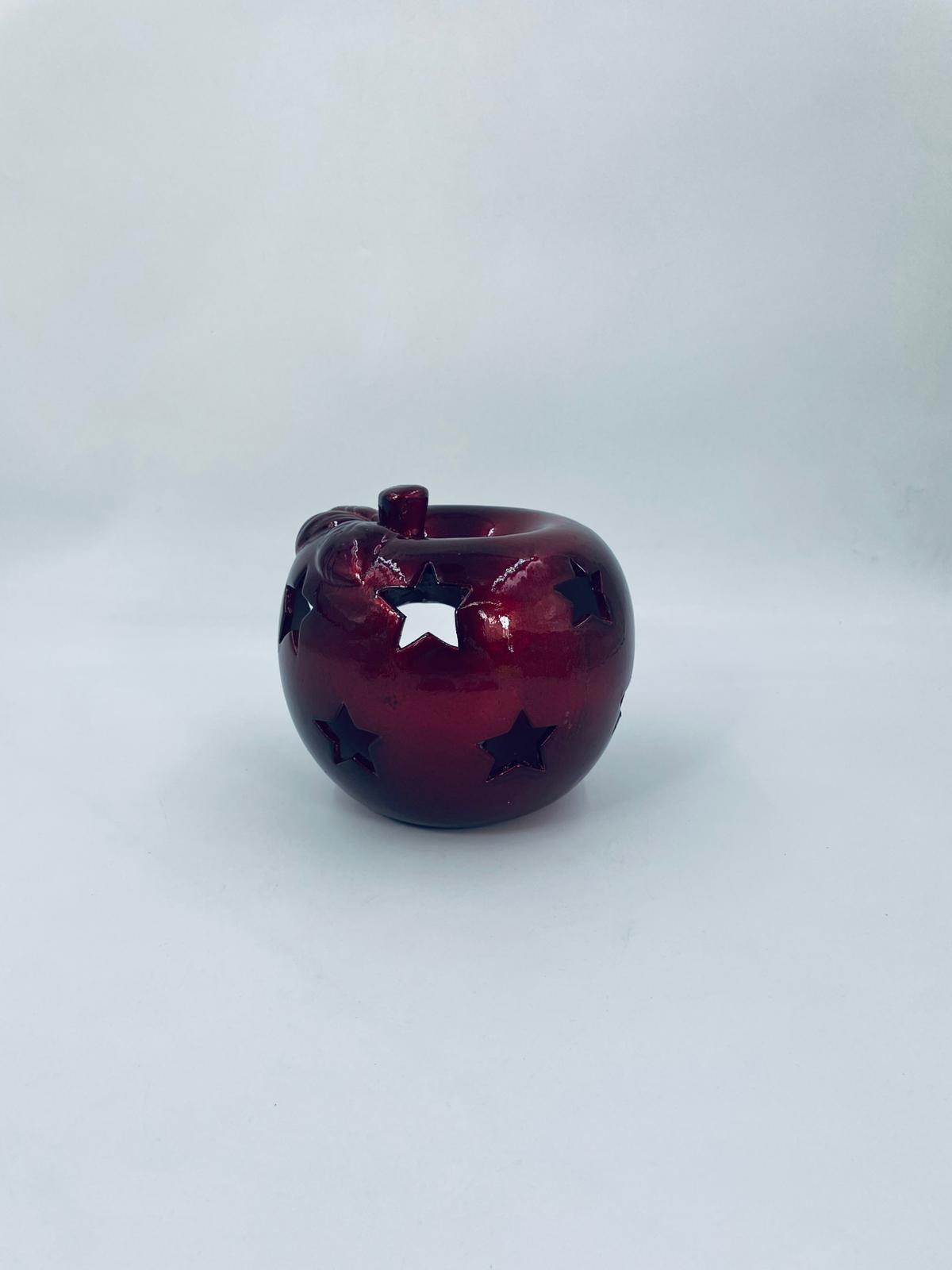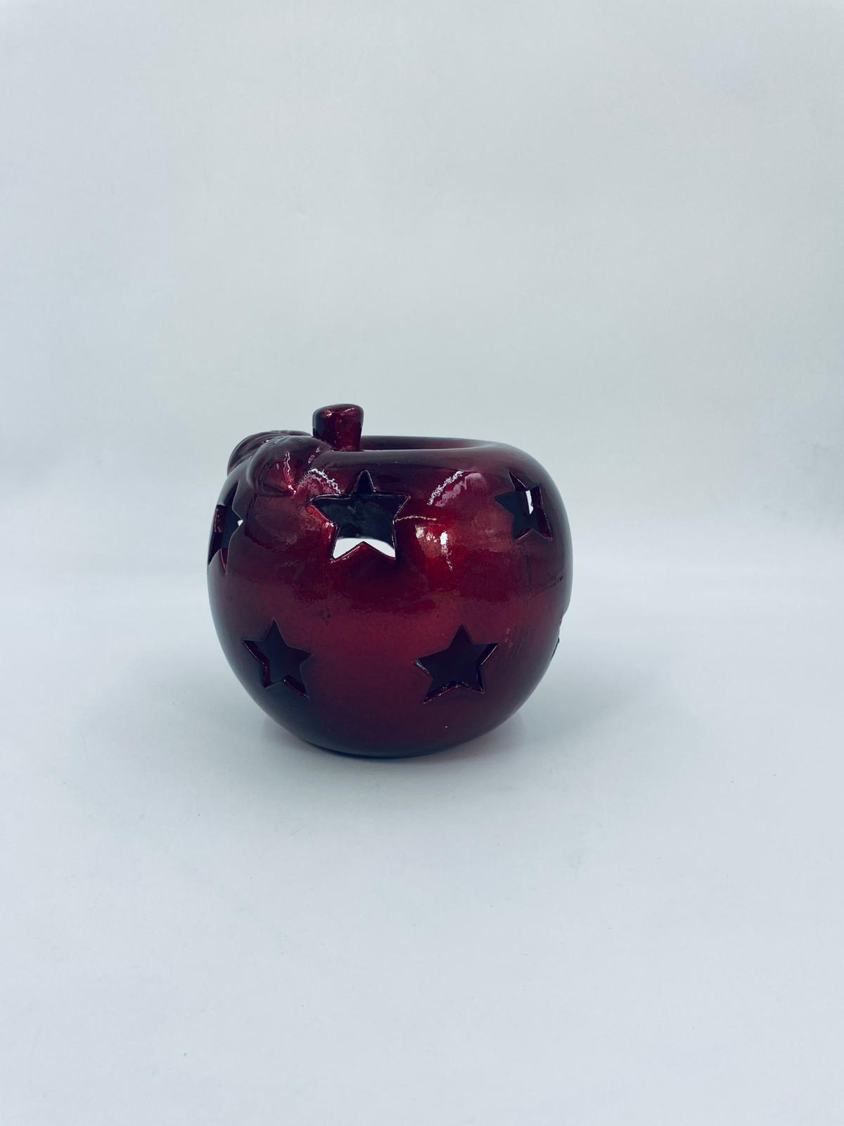 A decorative candle holder in vintage style, made of ceramic. The candle holder is shaped like an apple and comes in a deep, glossy red colour. It has star-shaped cut-outs through which the light shines.