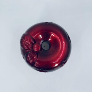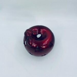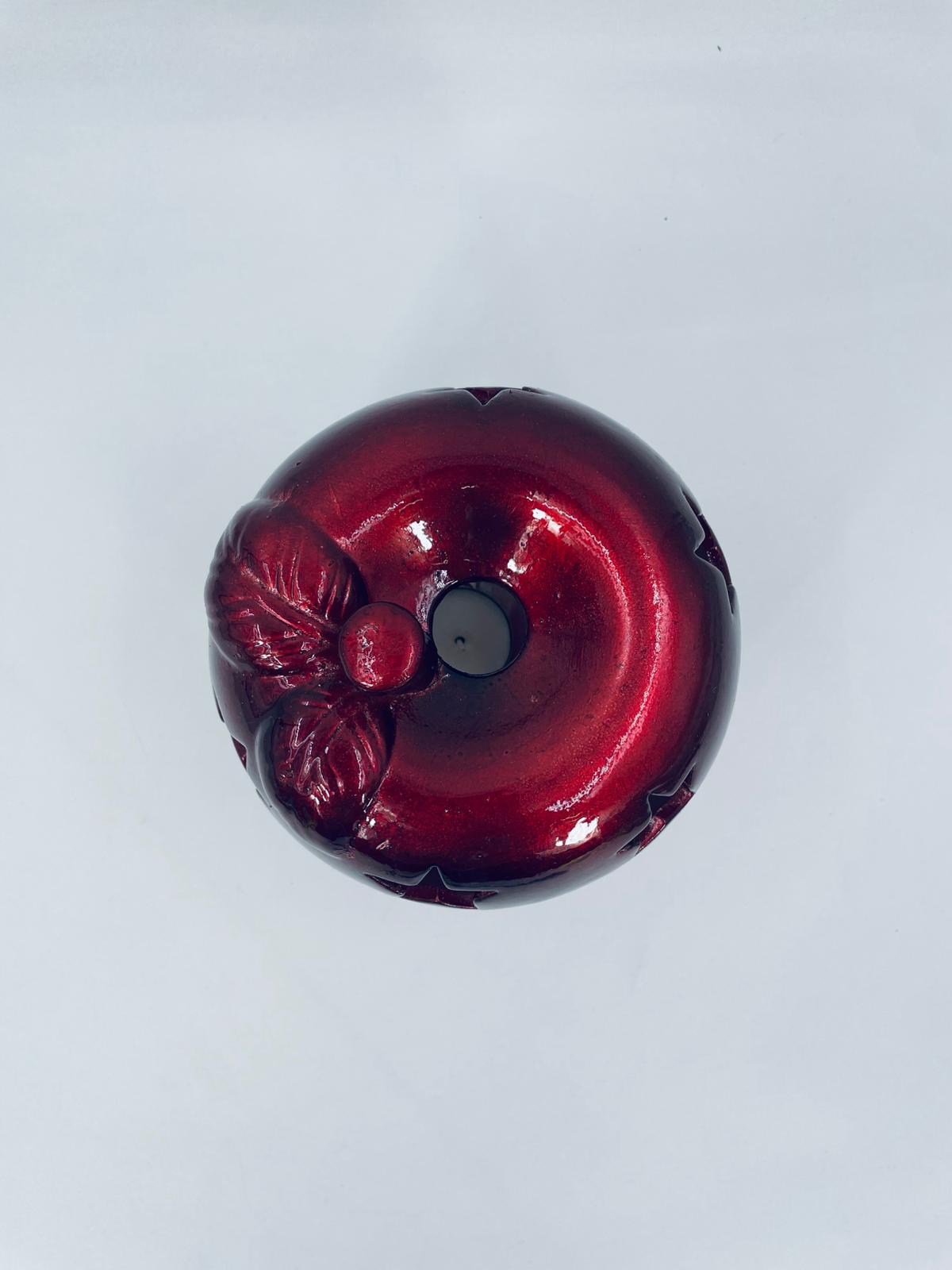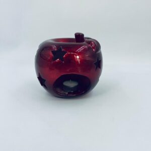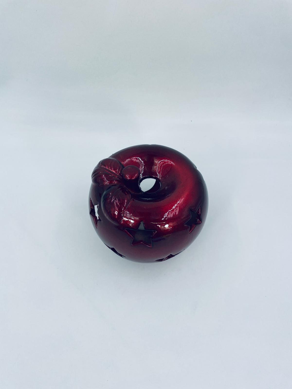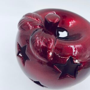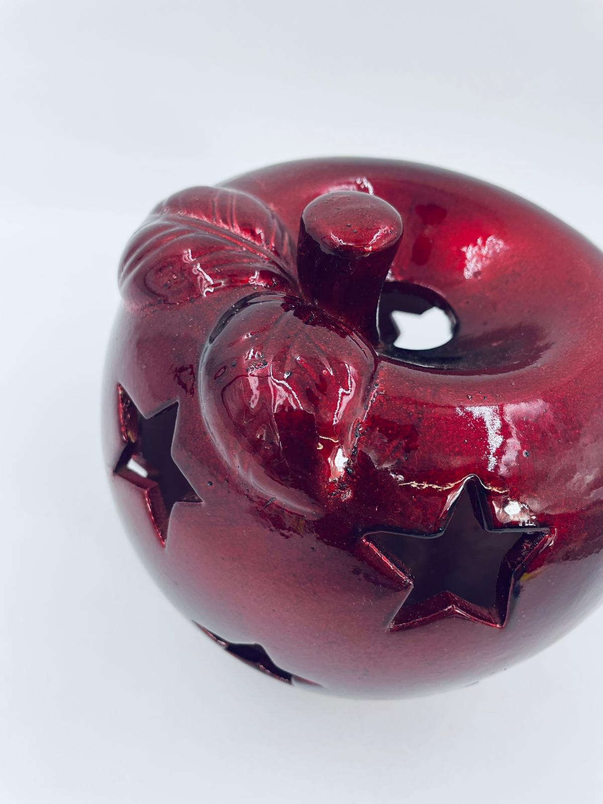 A decorative candle holder in vintage style, made of ceramic. The candle holder is shaped like an apple and comes in a deep, glossy red colour. It has star-shaped cut-outs through which the light shines.