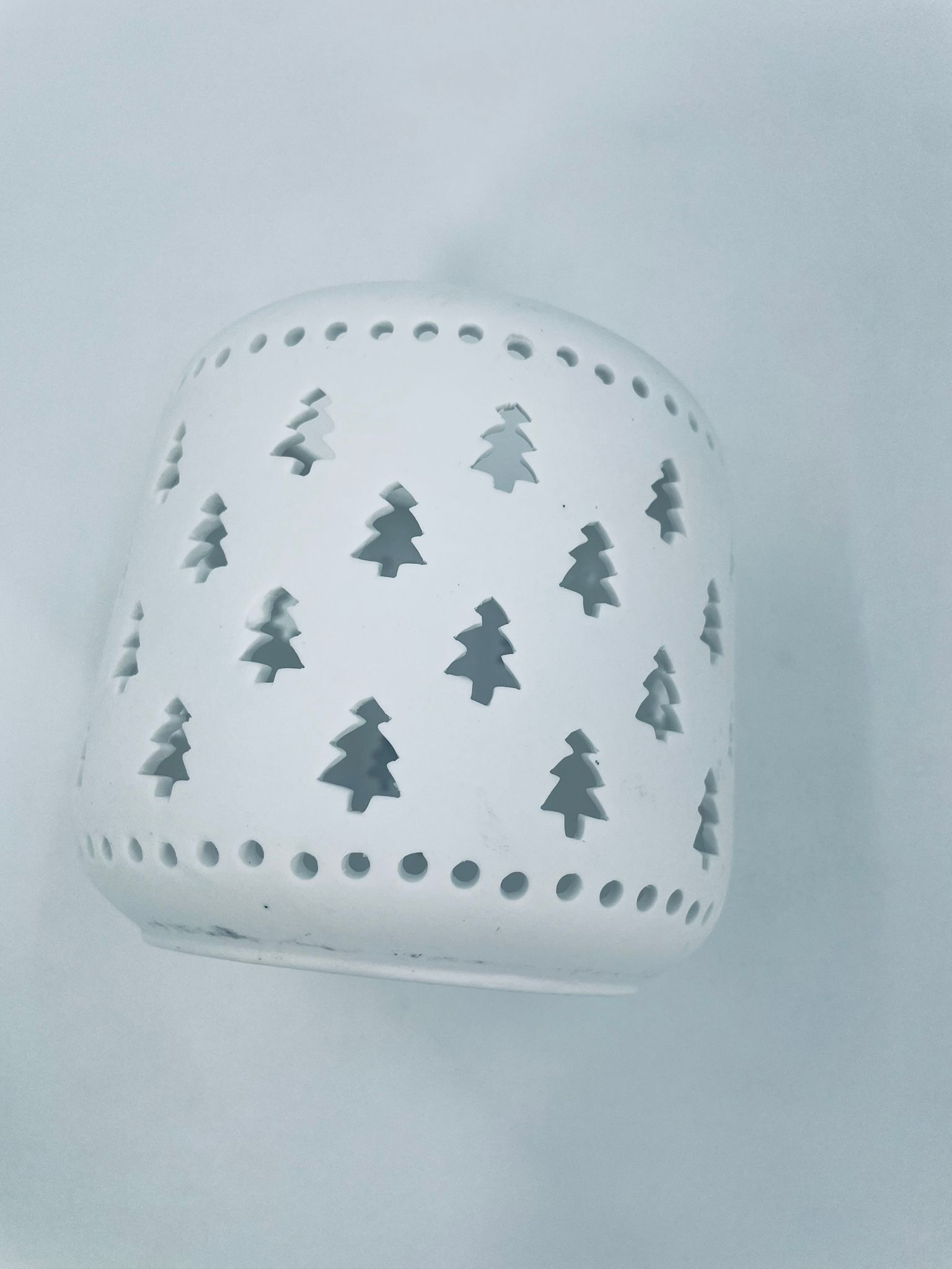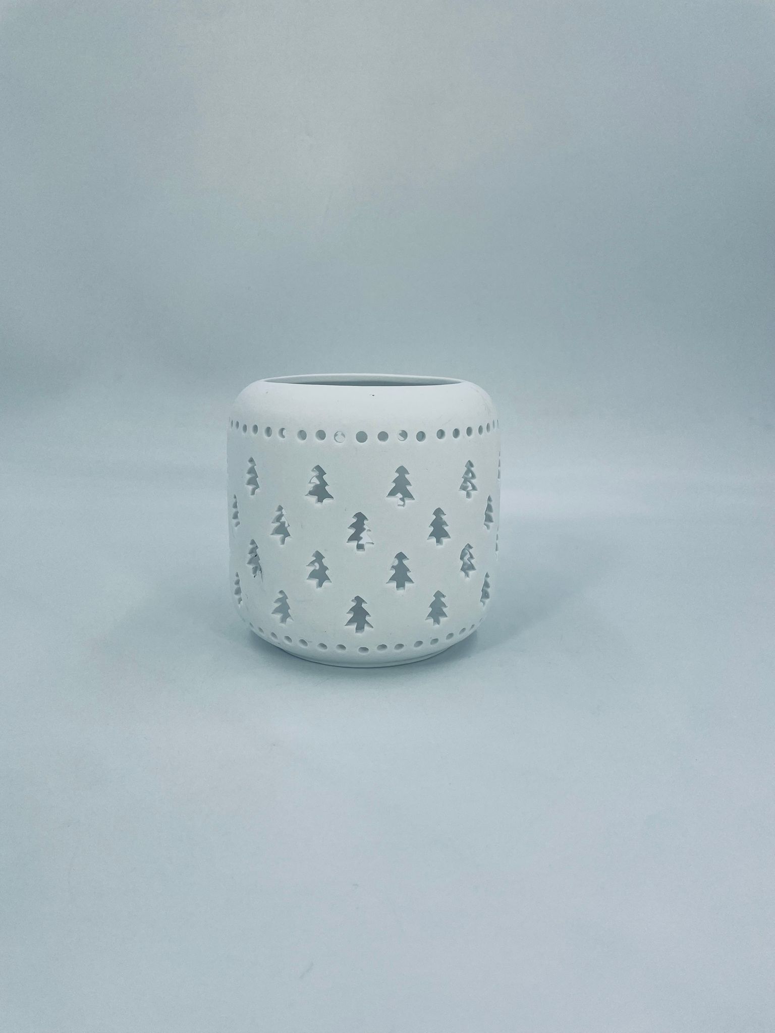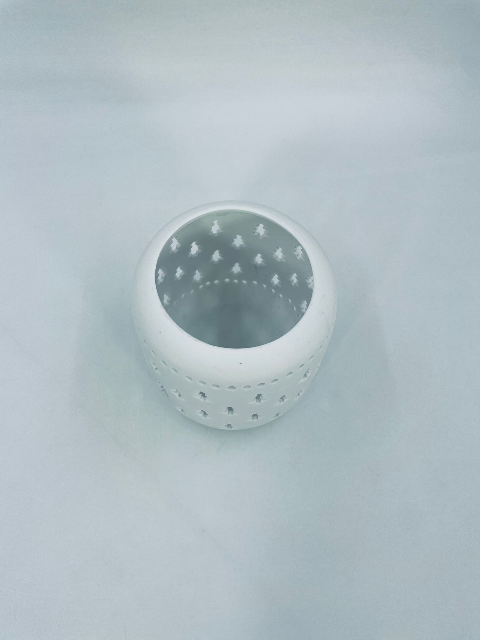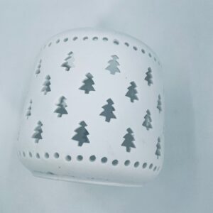 A decorative candle holder in vintage style, made of high-quality white ceramic. The candle holder has decorative cut-outs in the shape of Christmas trees and small dots at the top and bottom. It has minor stains on the base.
