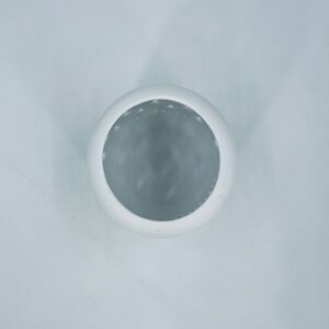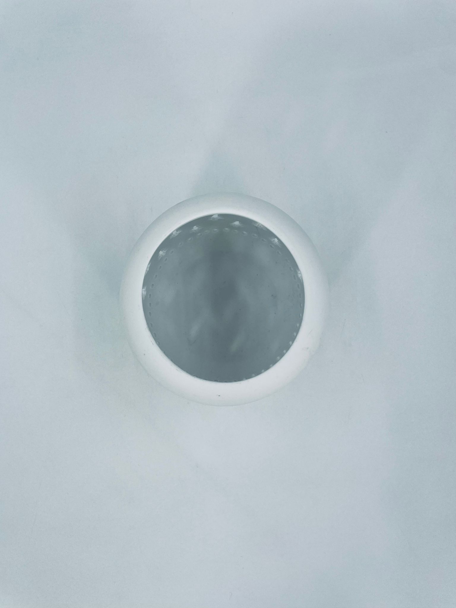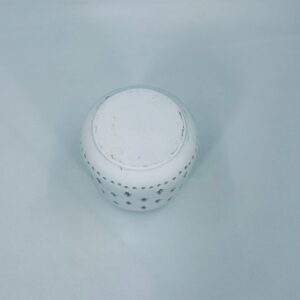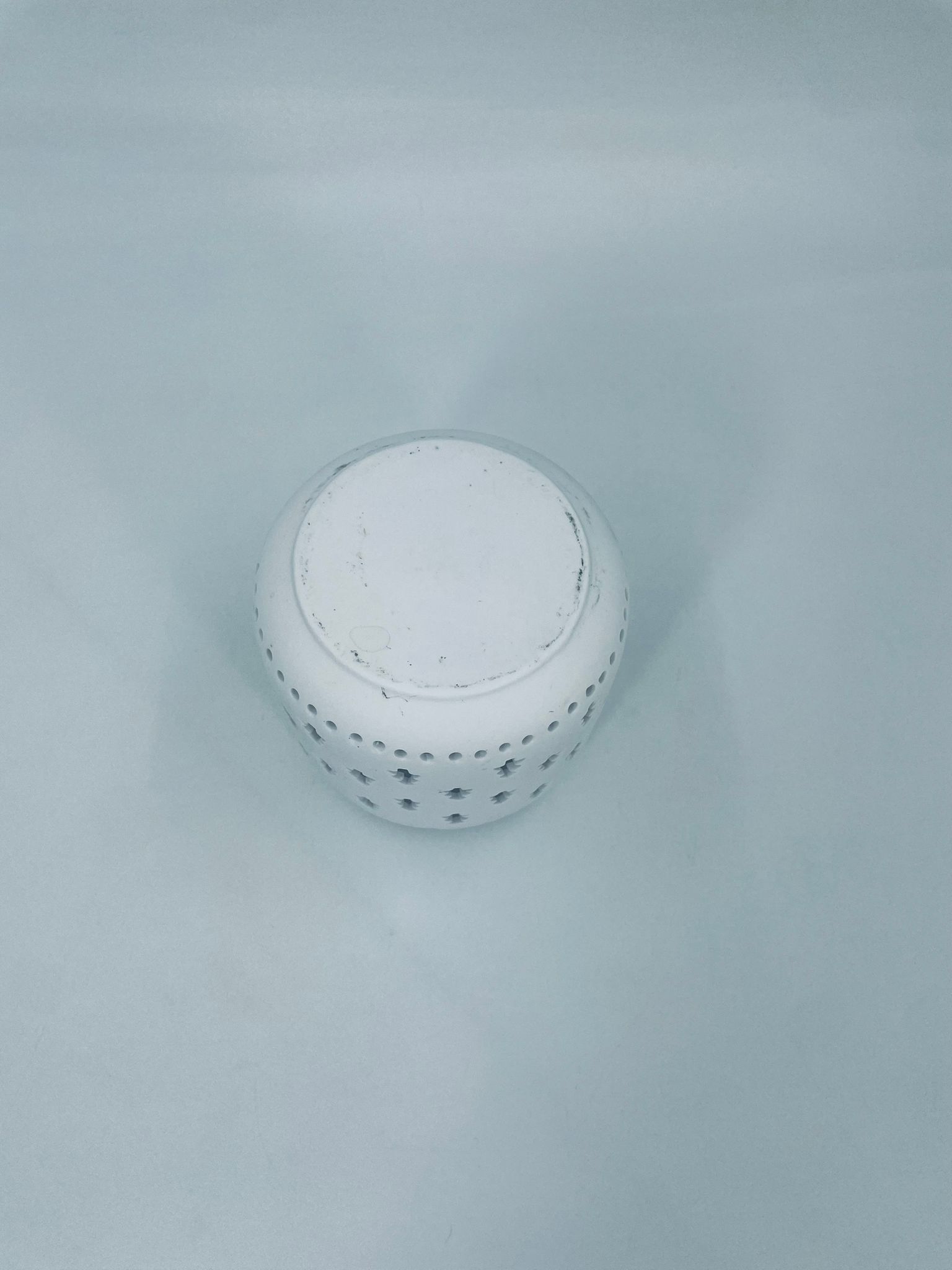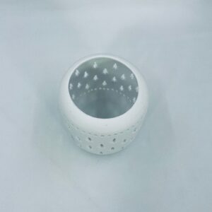 A decorative candle holder in vintage style, made of high-quality white ceramic. The candle holder has decorative cut-outs in the shape of Christmas trees and small dots at the top and bottom. It has minor stains on the base.