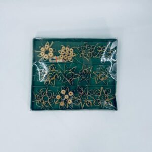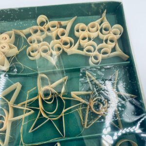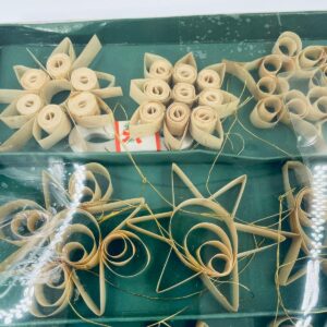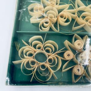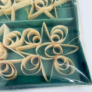 Vintage-style Christmas tree decorations made of delicate shavings. The decorations are shaped like stars and flowers, made of thin strips rolled up and connected in various patterns.