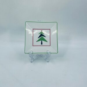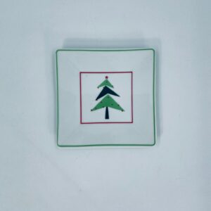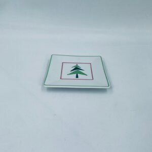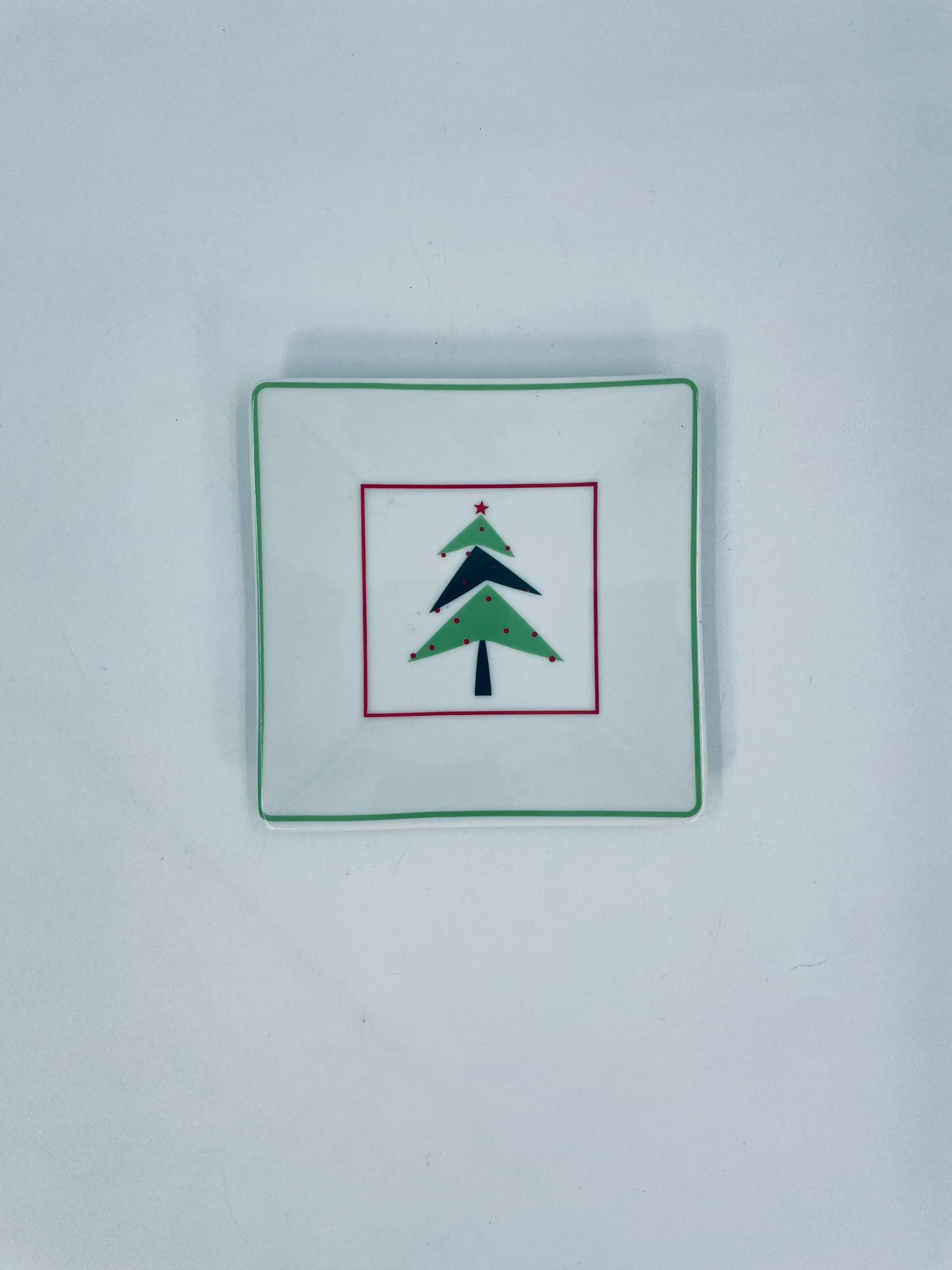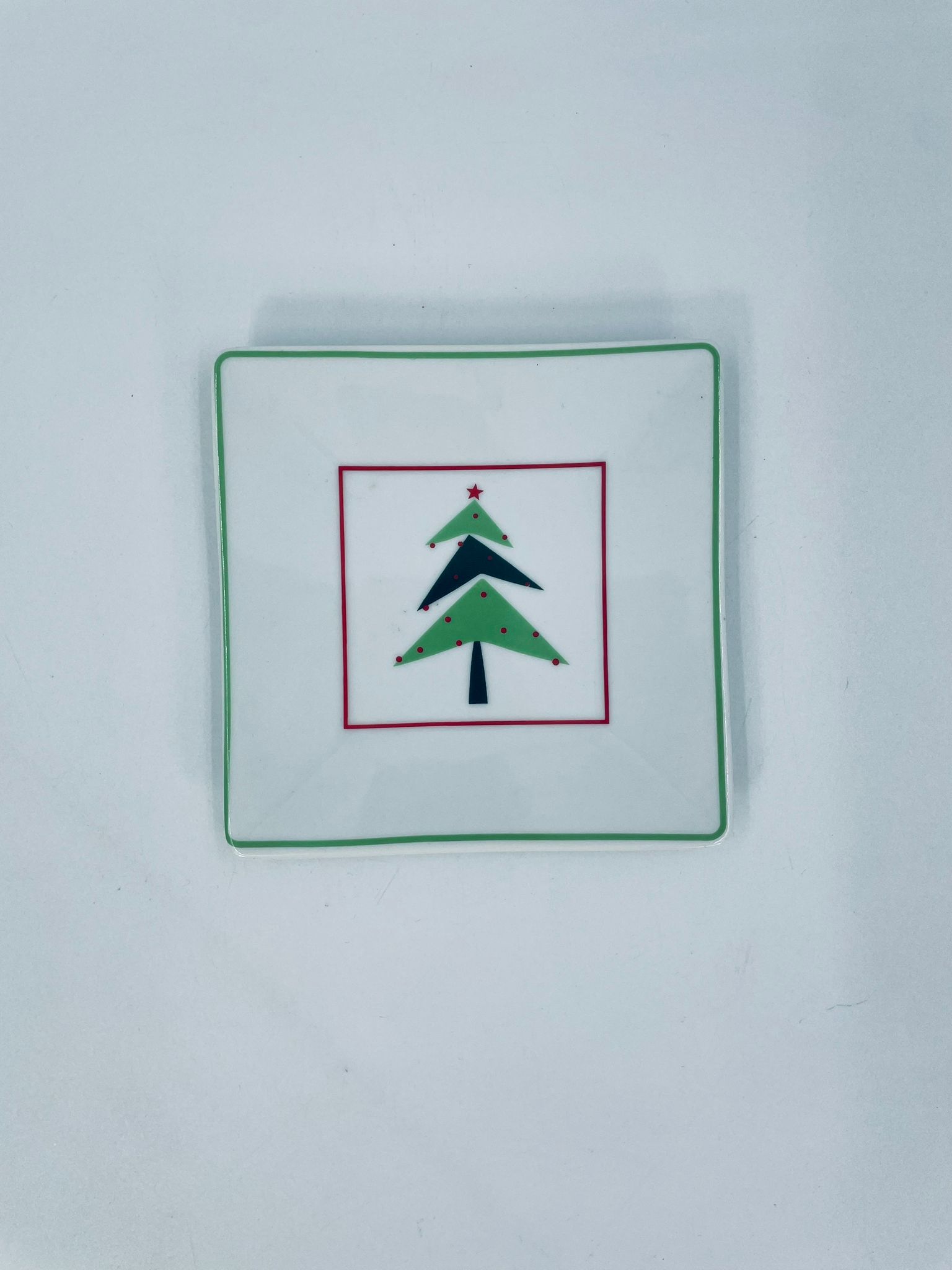 Vintage-style dessert and appetiser plate by Crate & Barrel, made of high-quality white porcelain. Square-shaped plate decorated with a green Christmas tree pattern and finished with green colour on the rim.