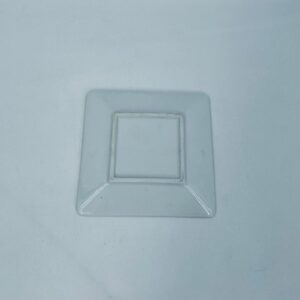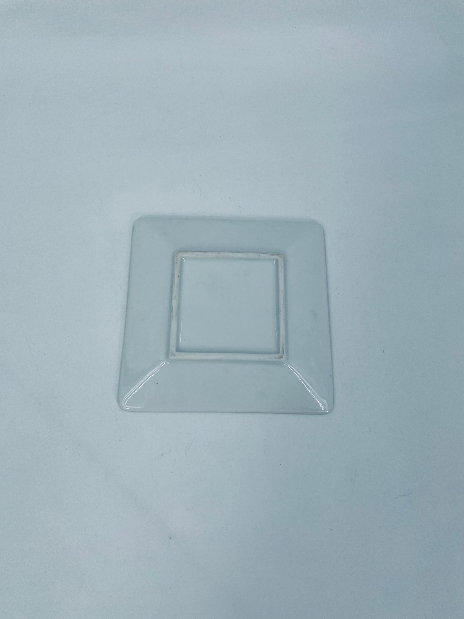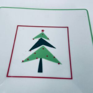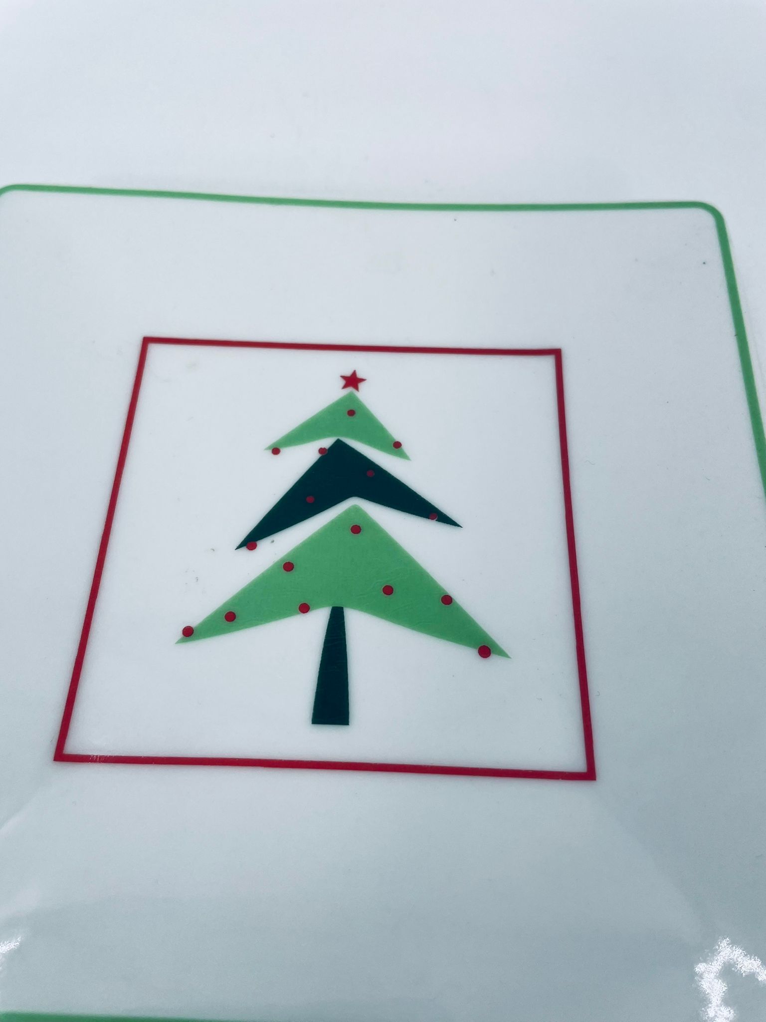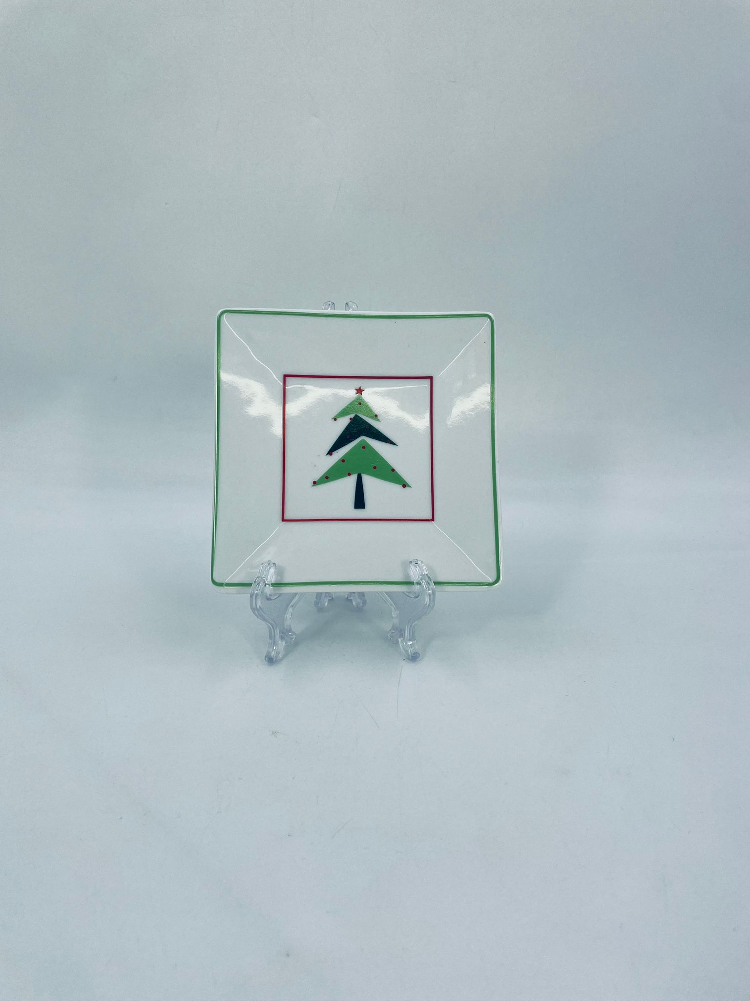 Vintage-style dessert and appetiser plate by Crate & Barrel, made of high-quality white porcelain. Square-shaped plate decorated with a green Christmas tree pattern and finished with green colour on the rim.