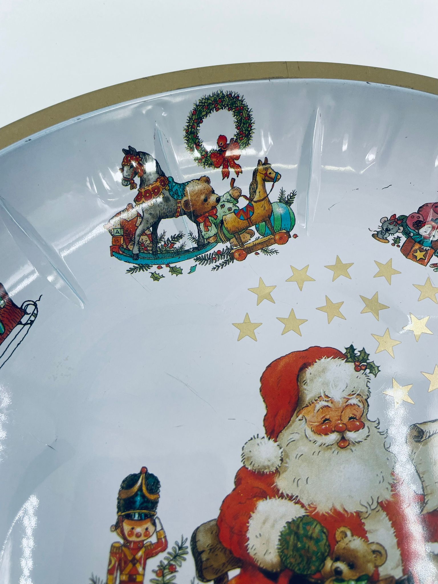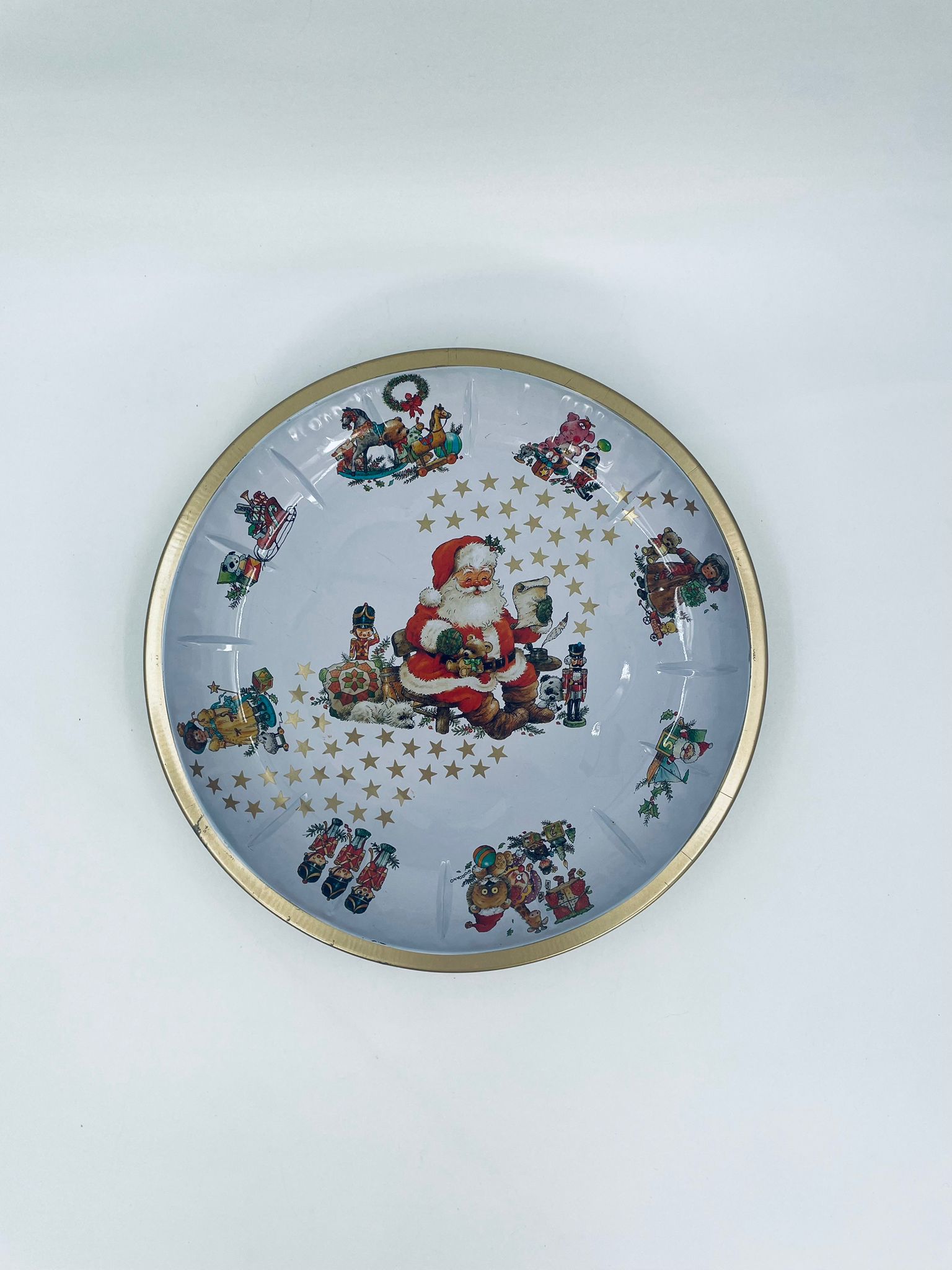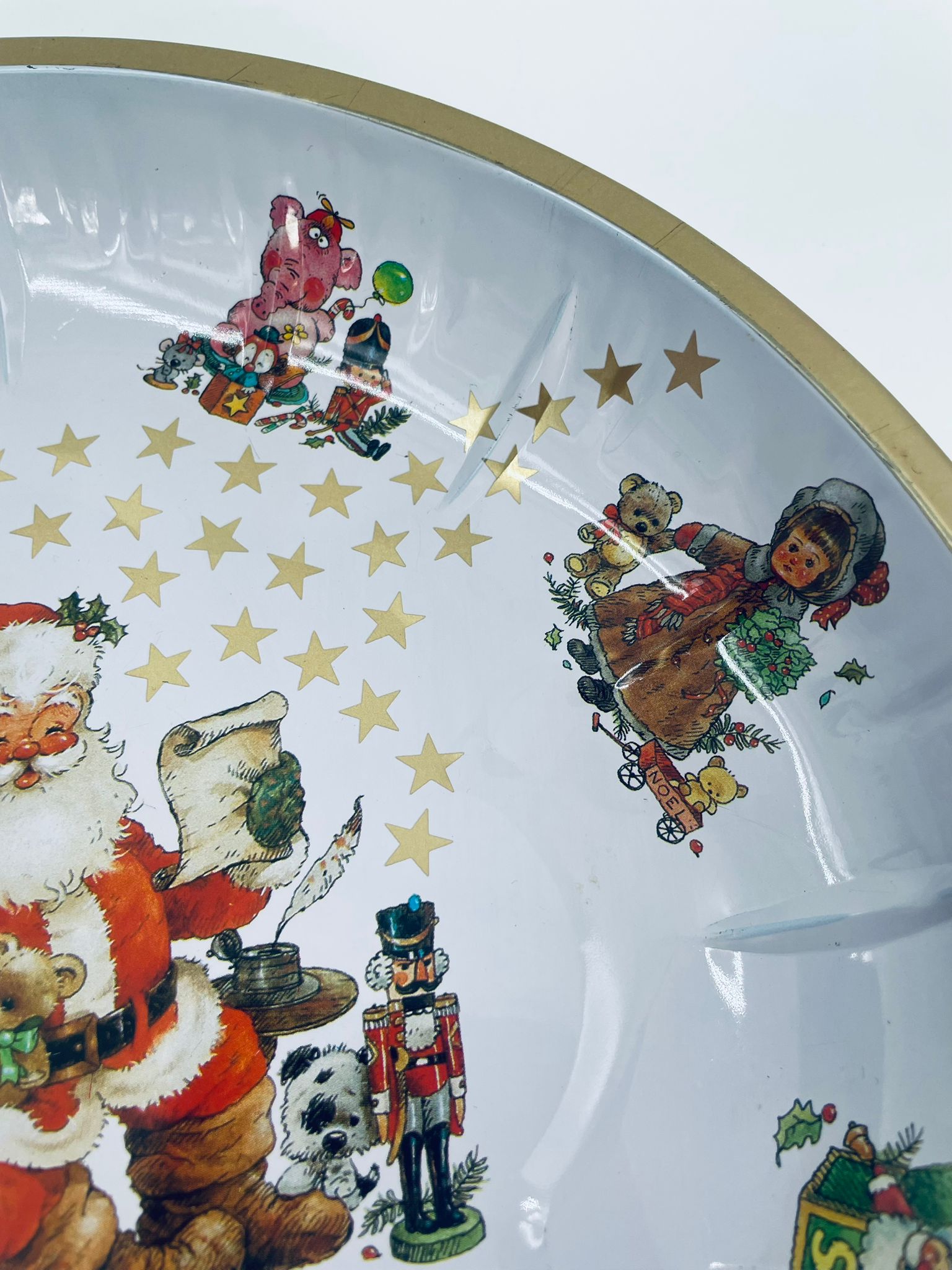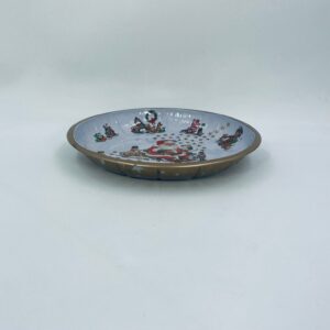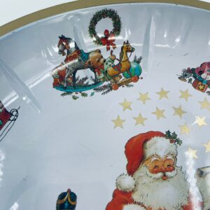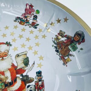 Misa dekoracyjna w stylu Vintage, wykonana ze stali nierdzewnej. Misa o okrągłym kształcie, ozdobiona centralnym motywem przedstawiającym Świętego Mikołaja w czerwonym stroju, czytającego list, wokół centralnego motywu znajdują się mniejsze ilustracje przedstawiające świąteczne zabawki i postacie, wykończona złotym obramowaniem. Posiada przetarcie na złoceniu.
