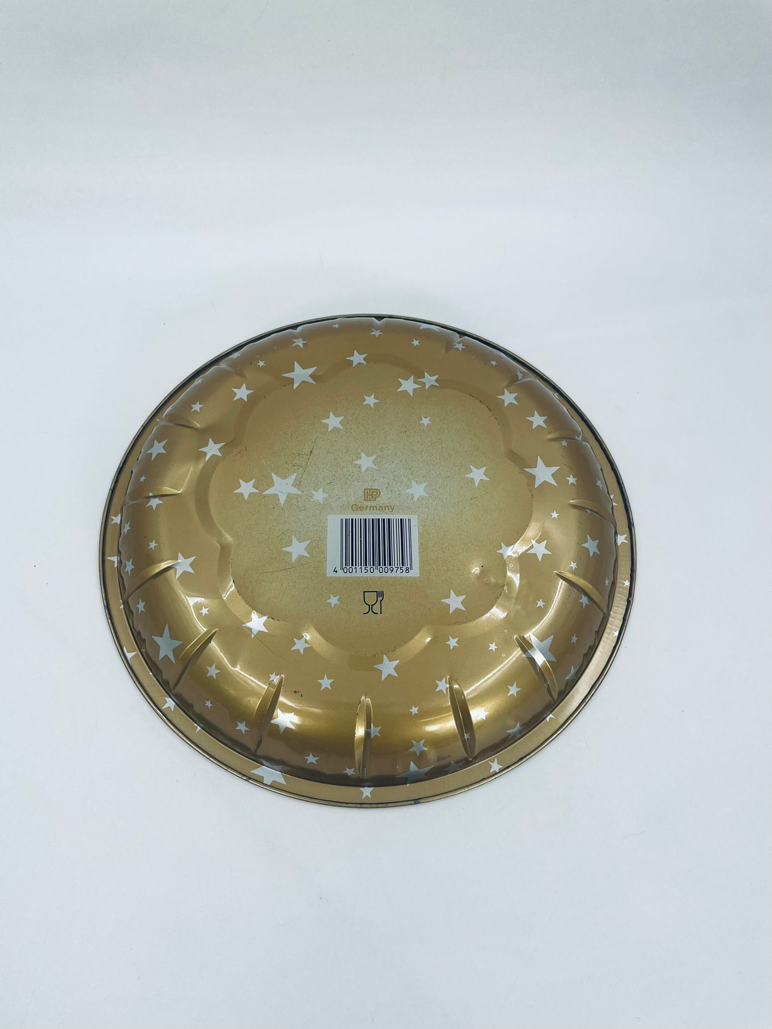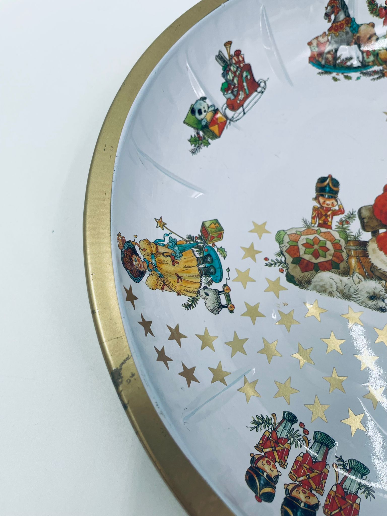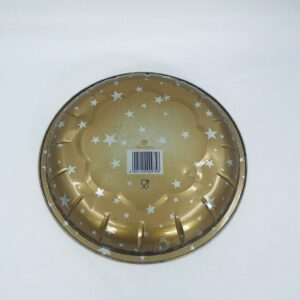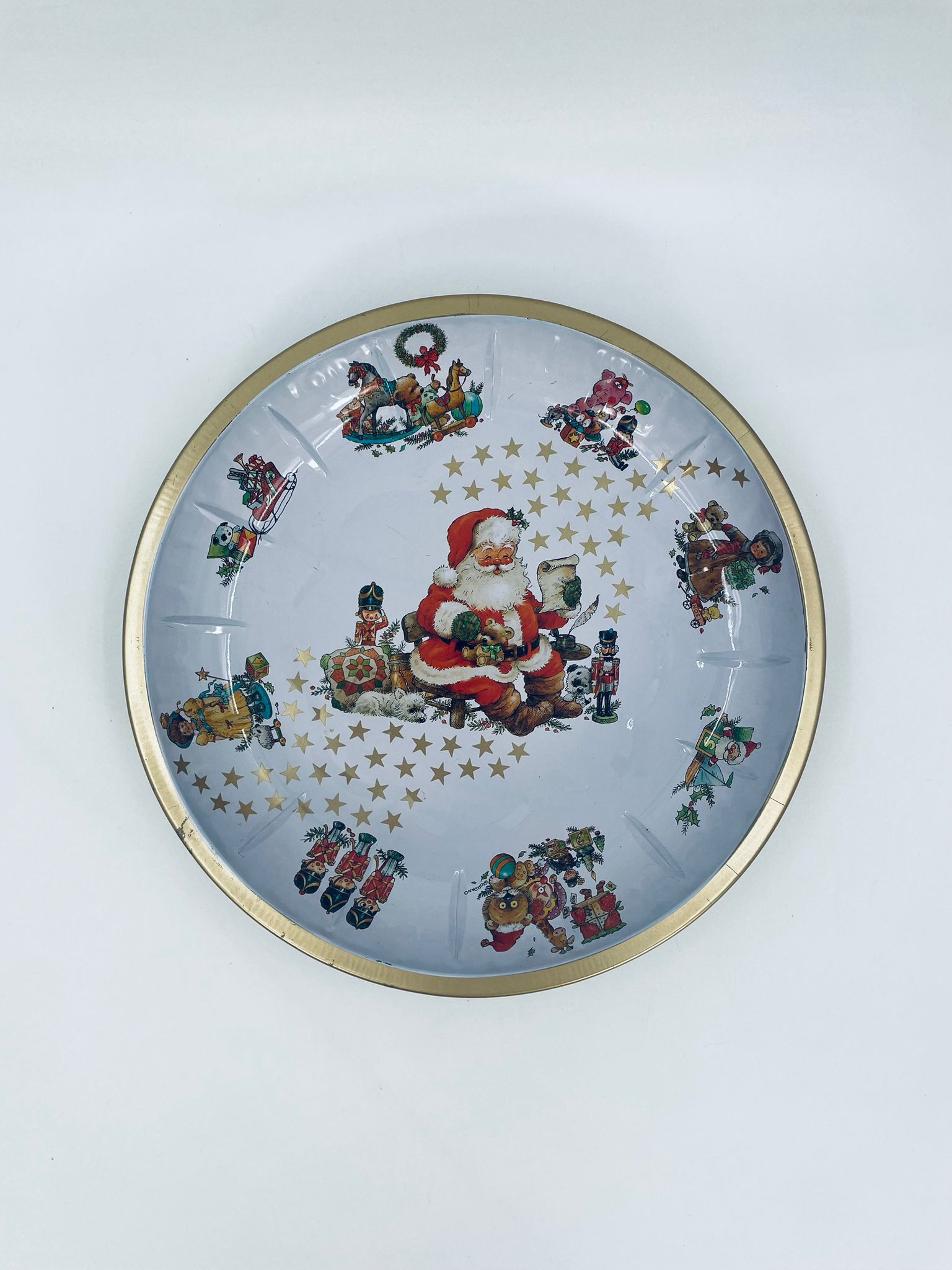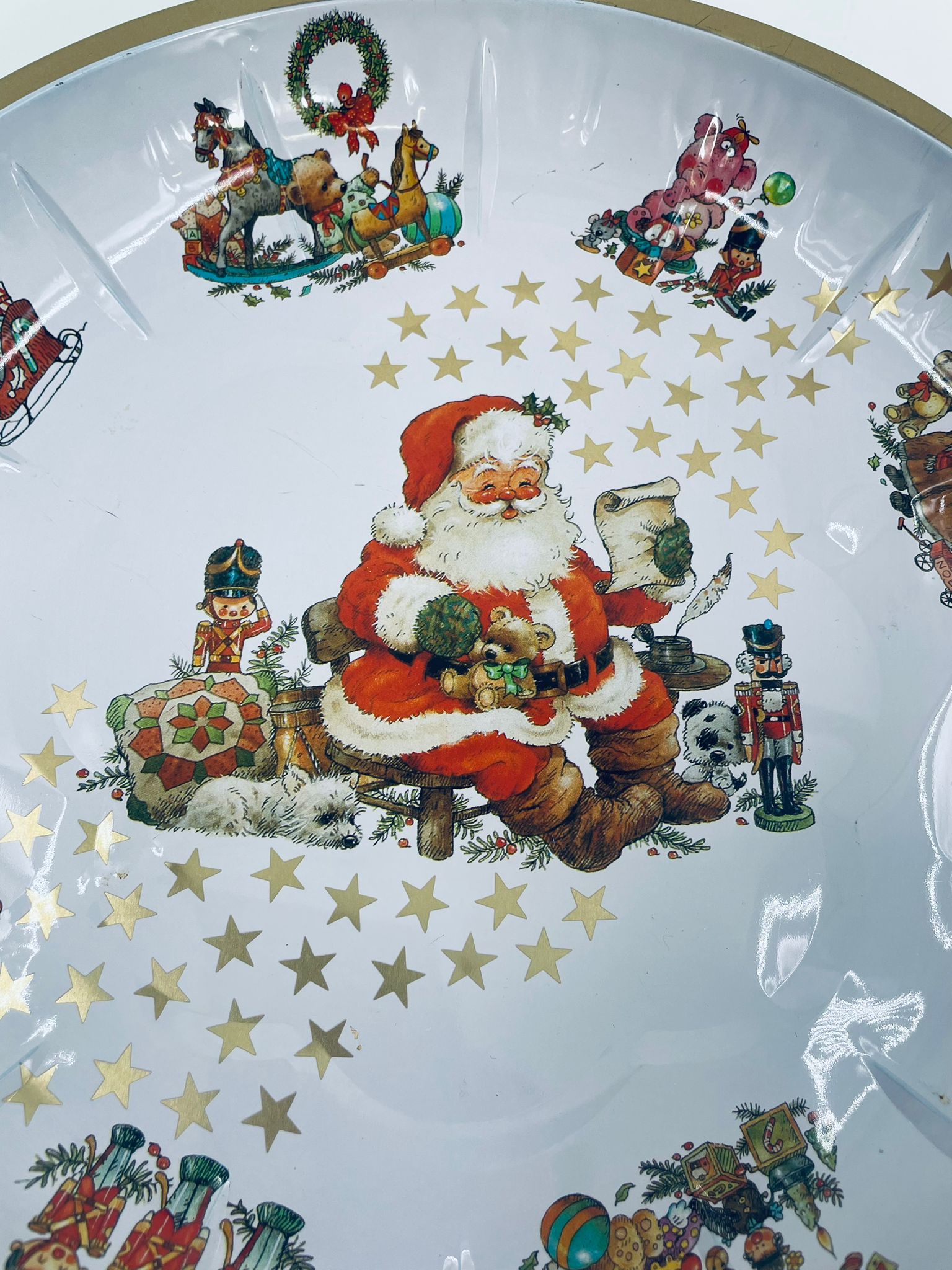 Misa dekoracyjna w stylu Vintage, wykonana ze stali nierdzewnej. Misa o okrągłym kształcie, ozdobiona centralnym motywem przedstawiającym Świętego Mikołaja w czerwonym stroju, czytającego list, wokół centralnego motywu znajdują się mniejsze ilustracje przedstawiające świąteczne zabawki i postacie, wykończona złotym obramowaniem. Posiada przetarcie na złoceniu.