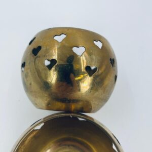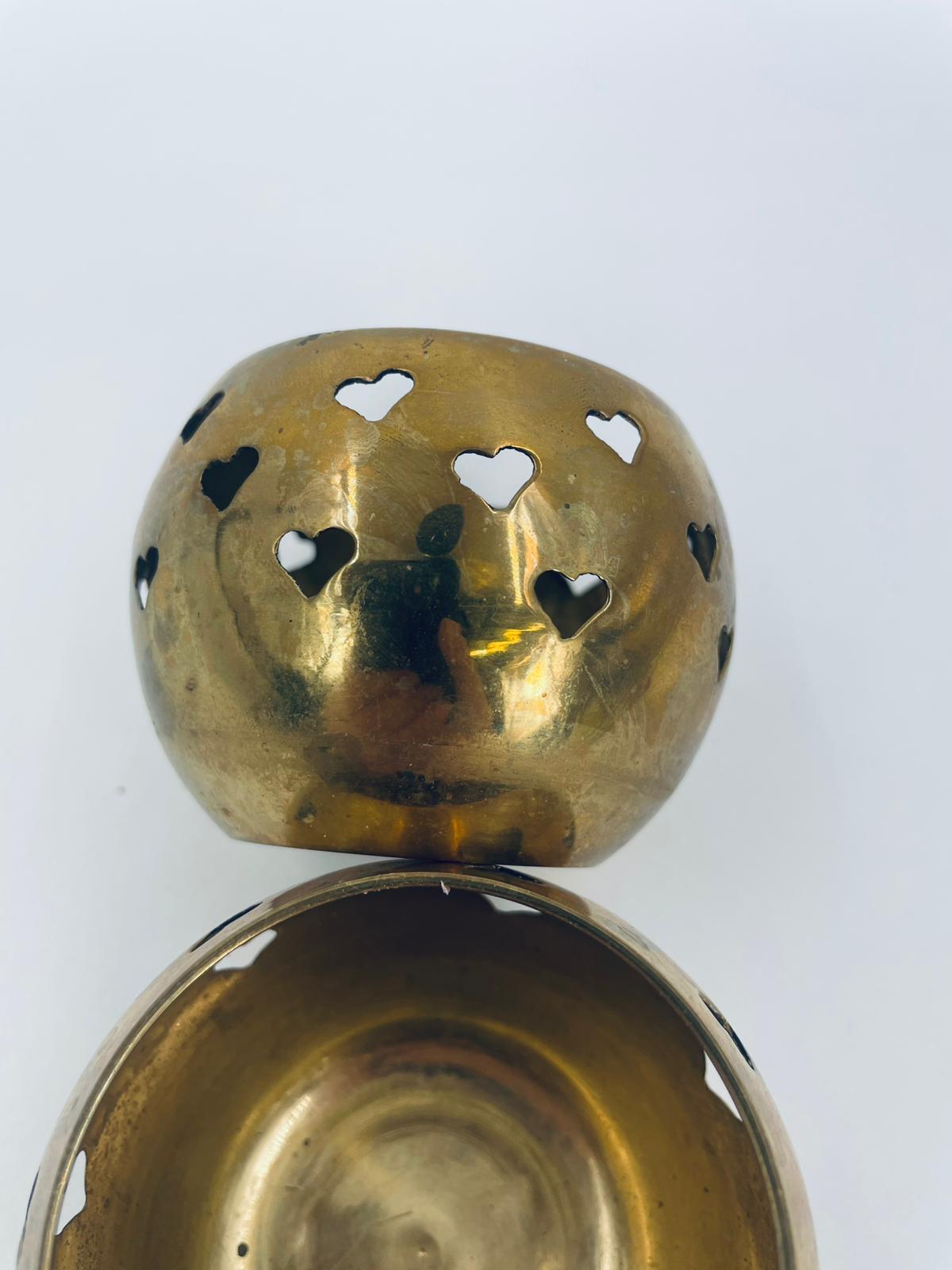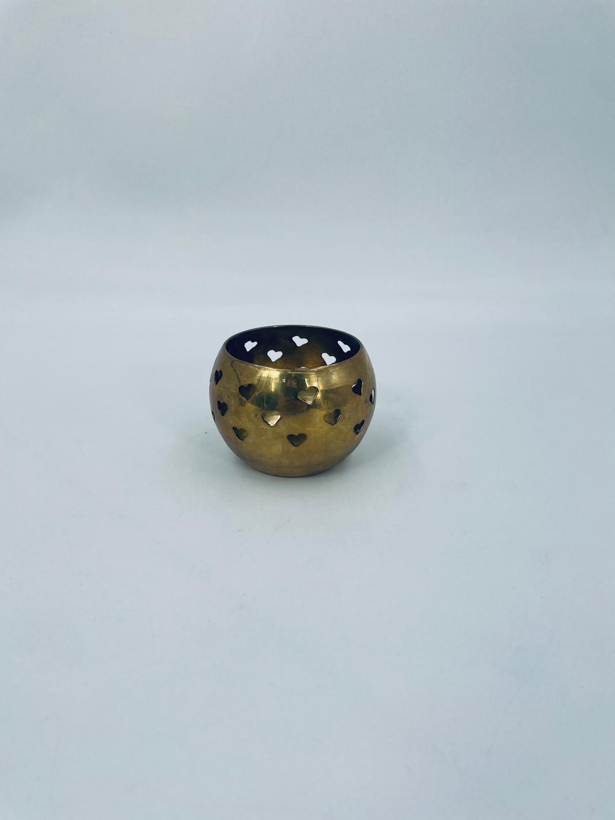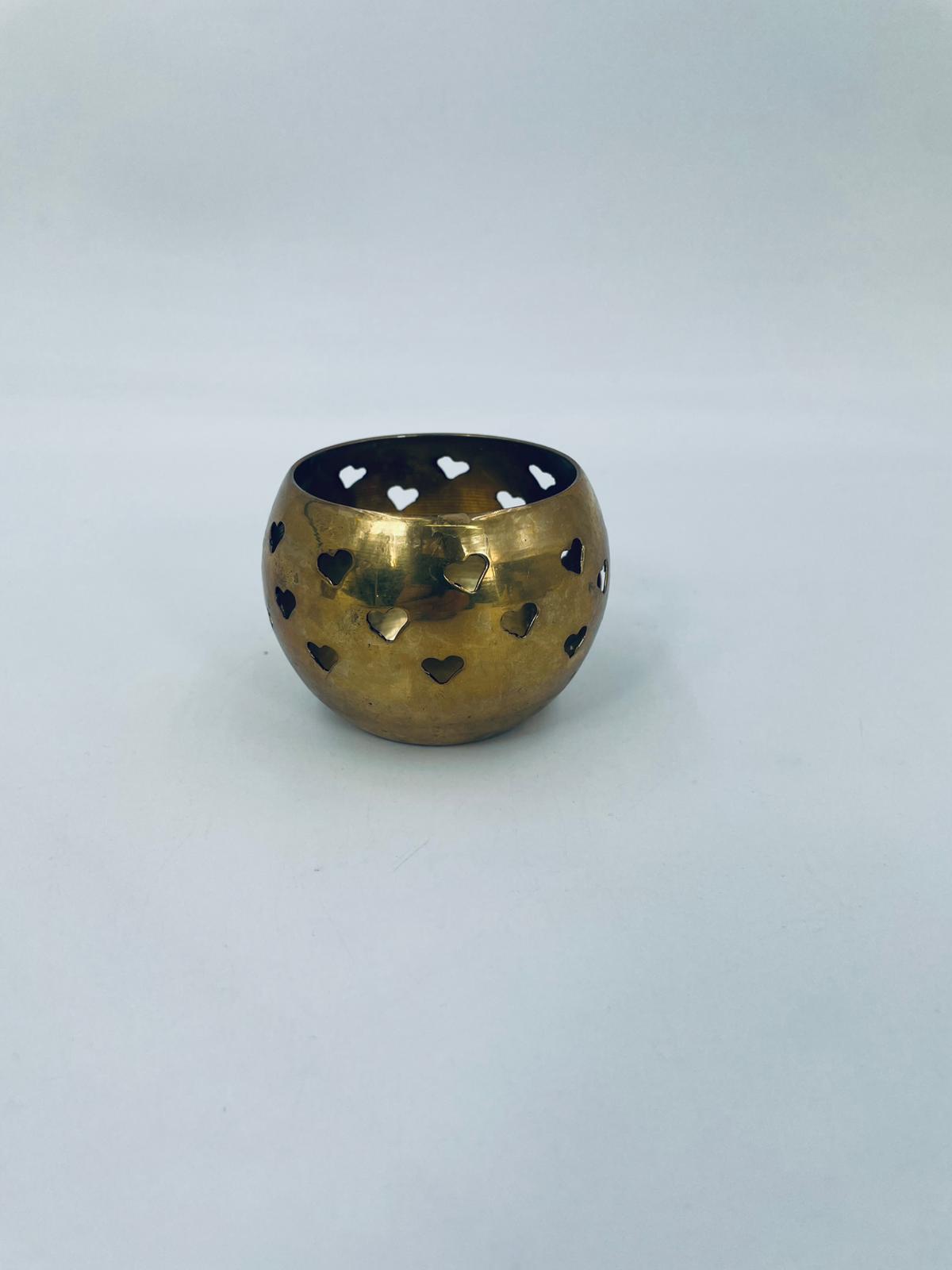 A decorative candle holder in vintage style, made of gold-coloured metal. The candle holder has a spherical shape and features openwork heart-shaped cut-outs distributed across its entire surface.