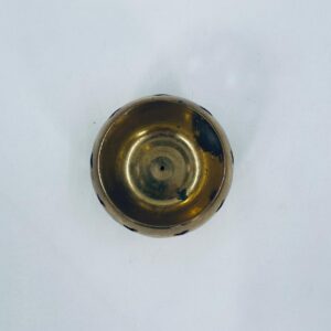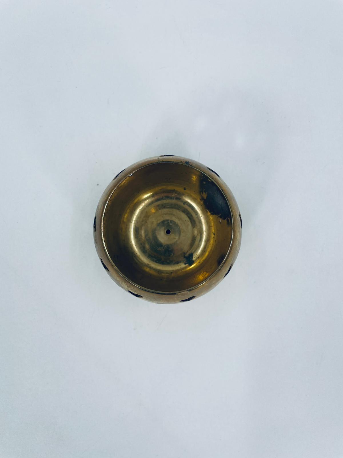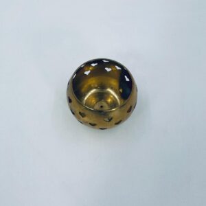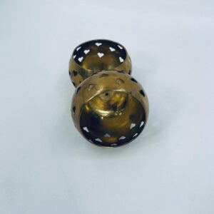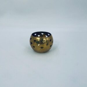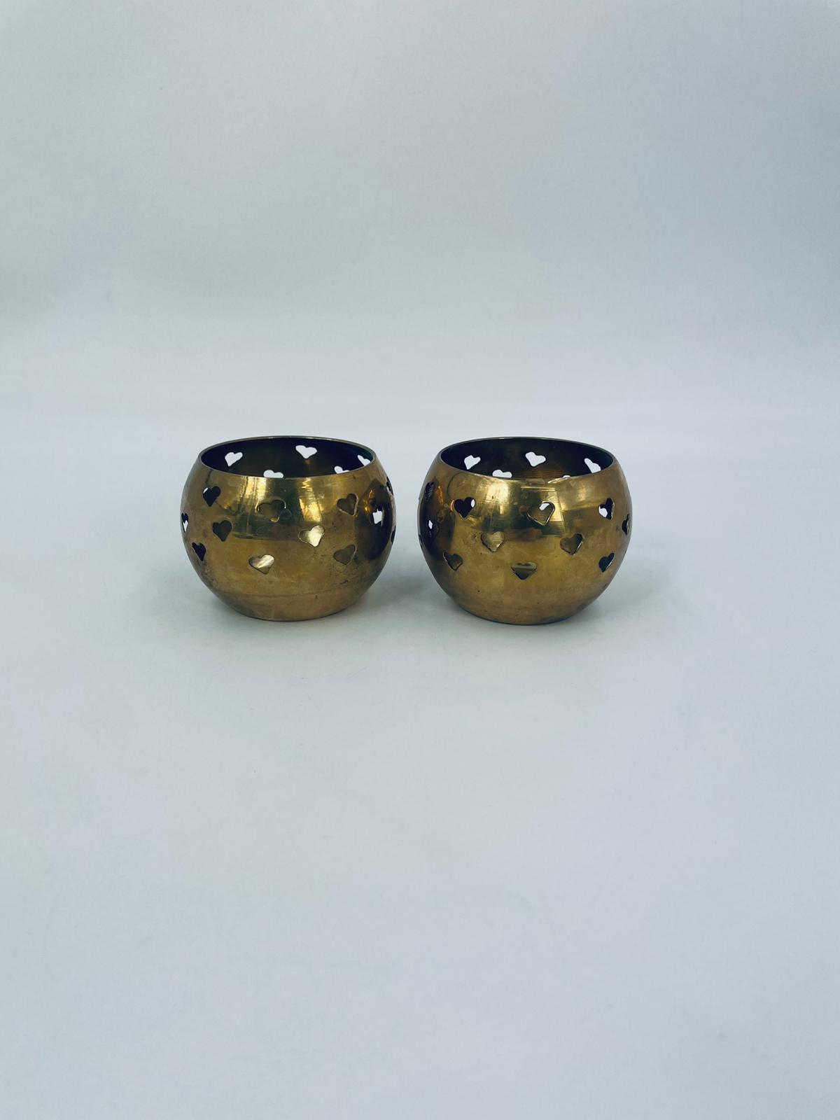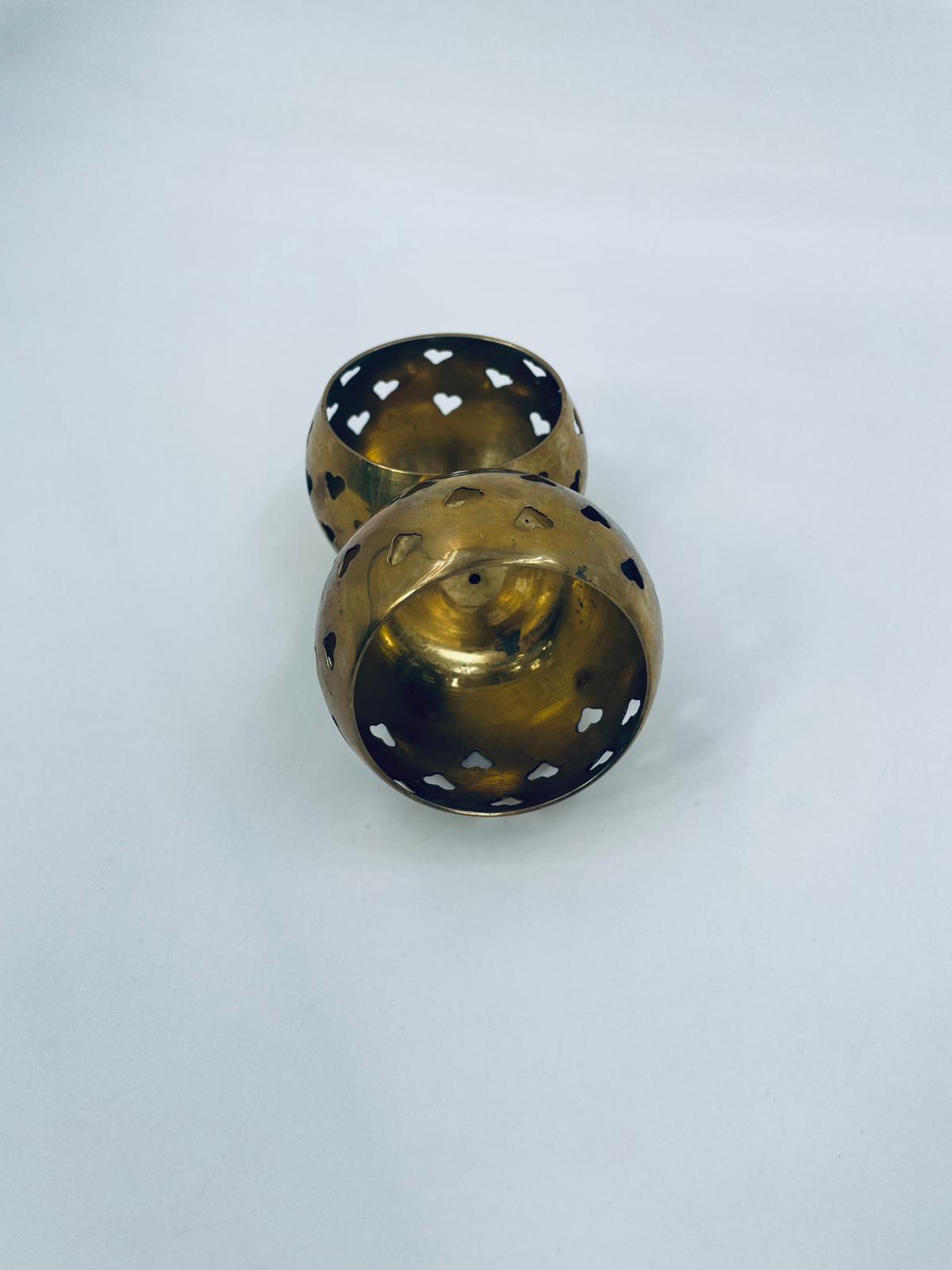 A decorative candle holder in vintage style, made of gold-coloured metal. The candle holder has a spherical shape and features openwork heart-shaped cut-outs distributed across its entire surface.