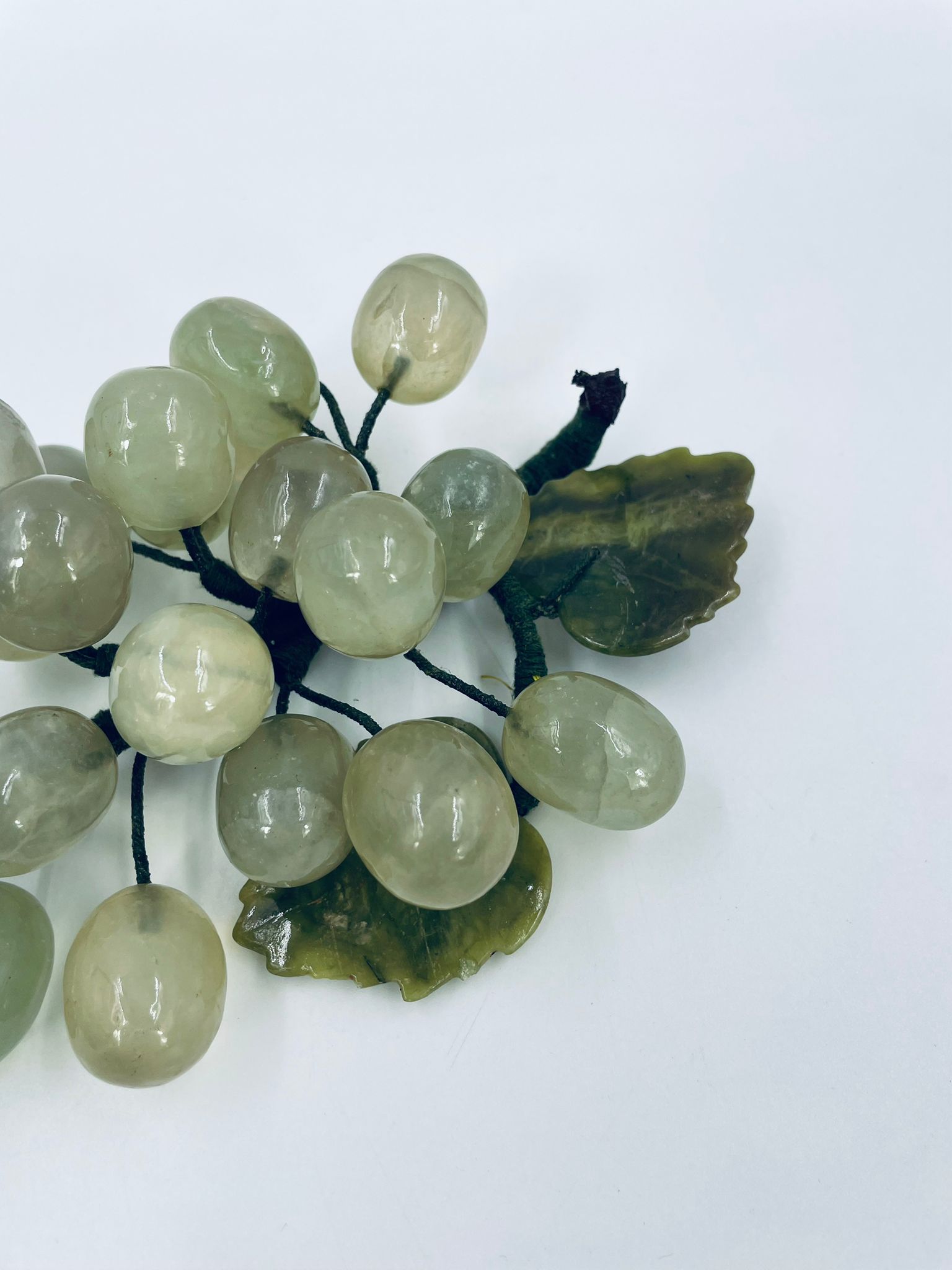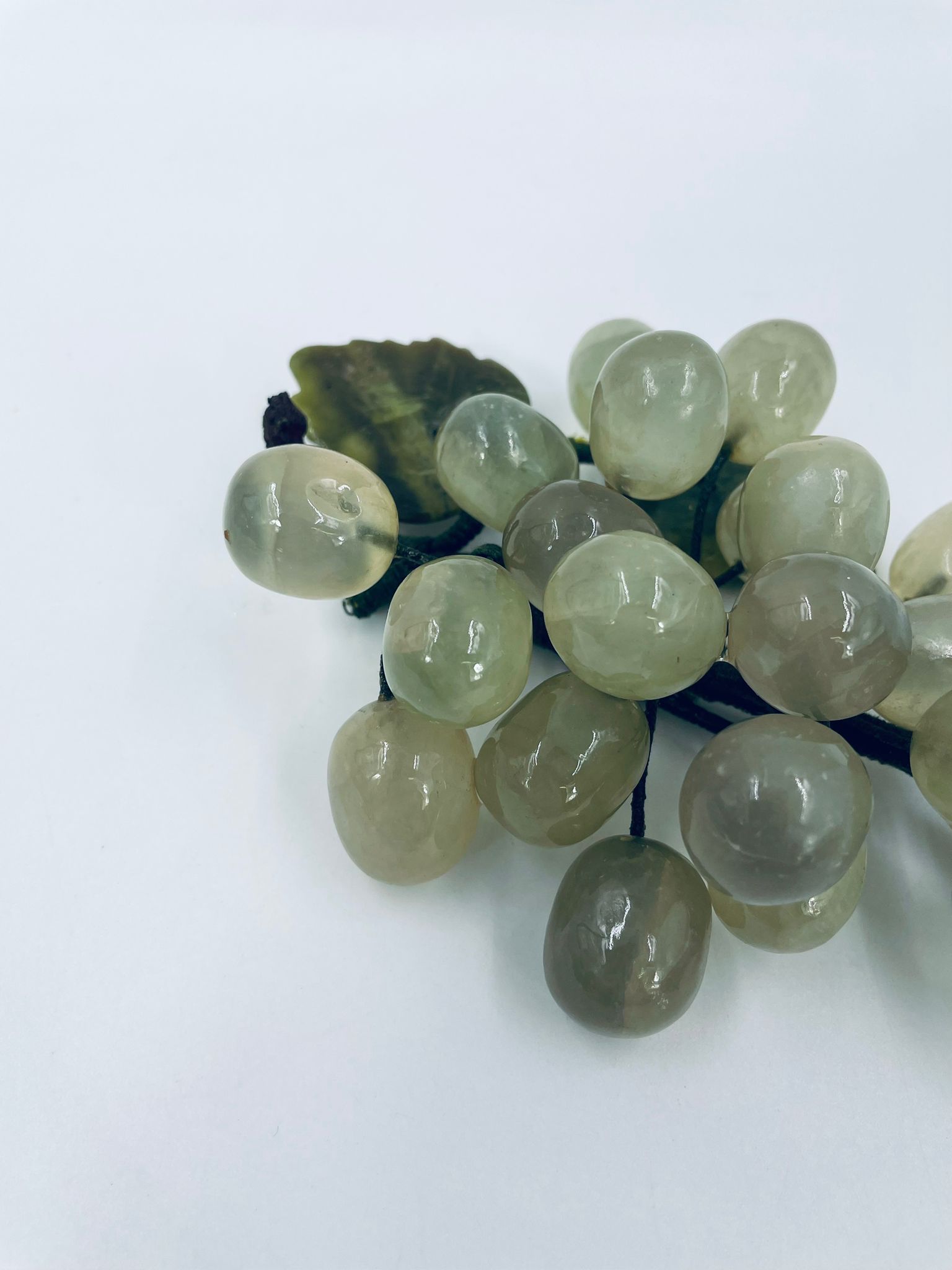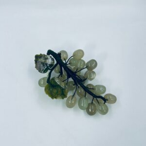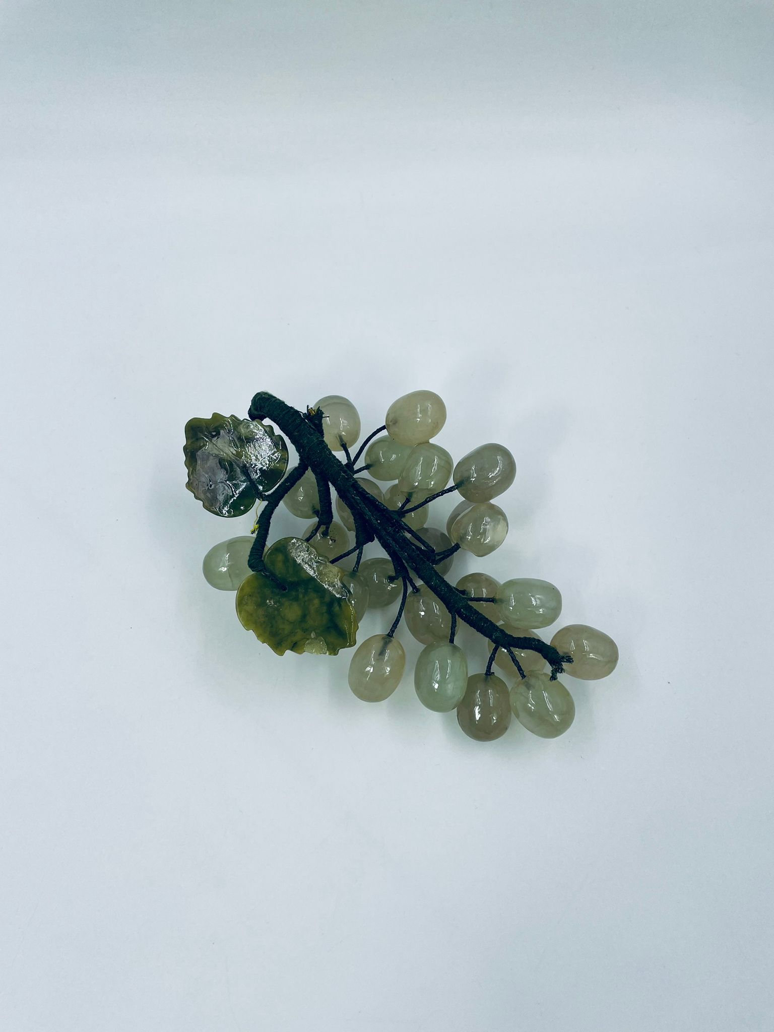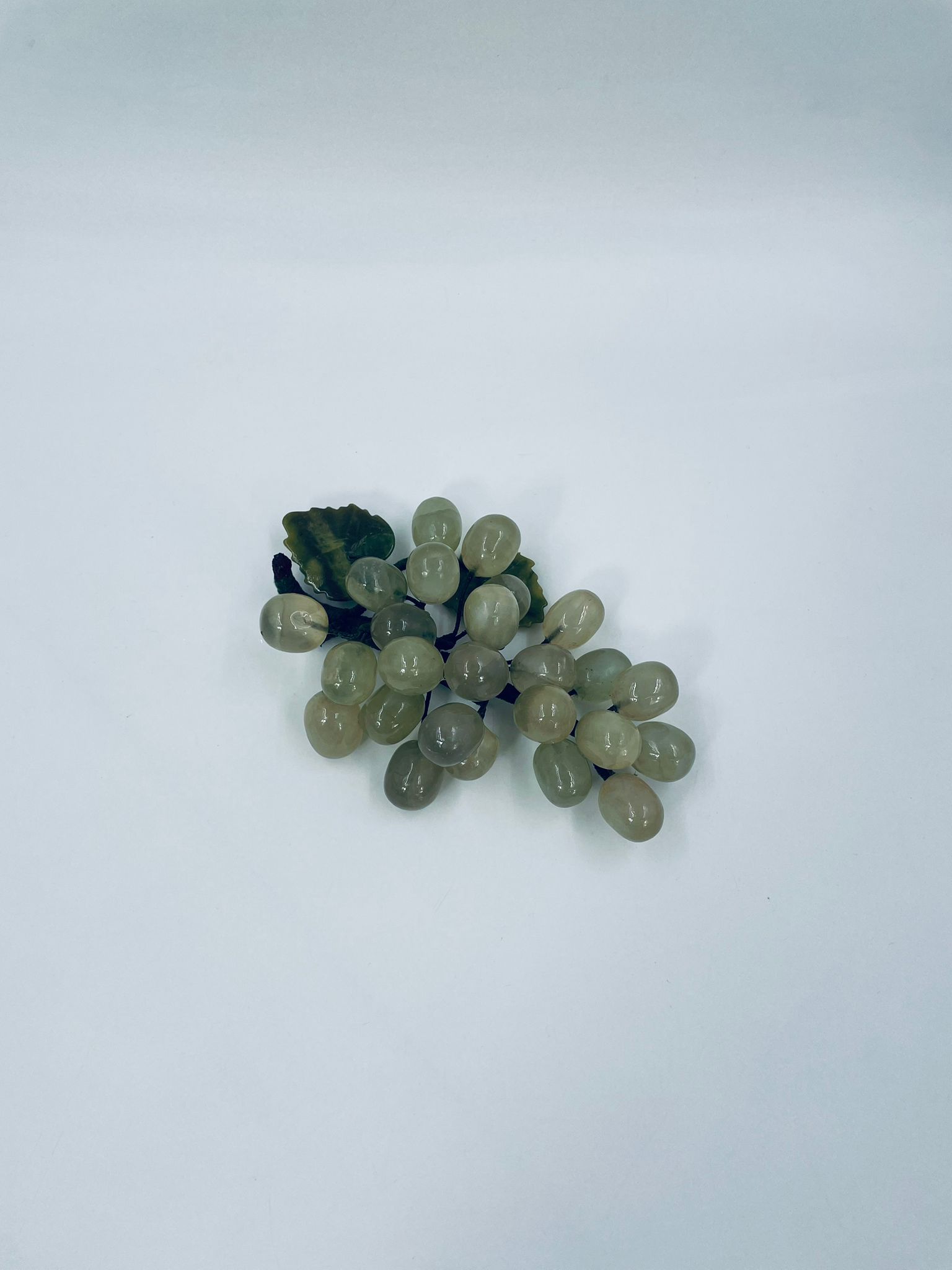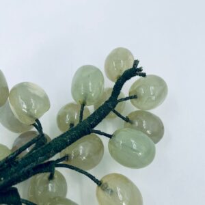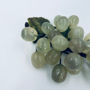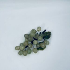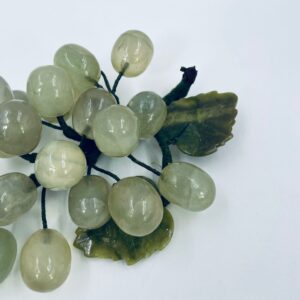 Vintage style grape bunch on a stem with leaves, made from jade. The figurine is handmade and stained green. It has a small damage to the leaf.