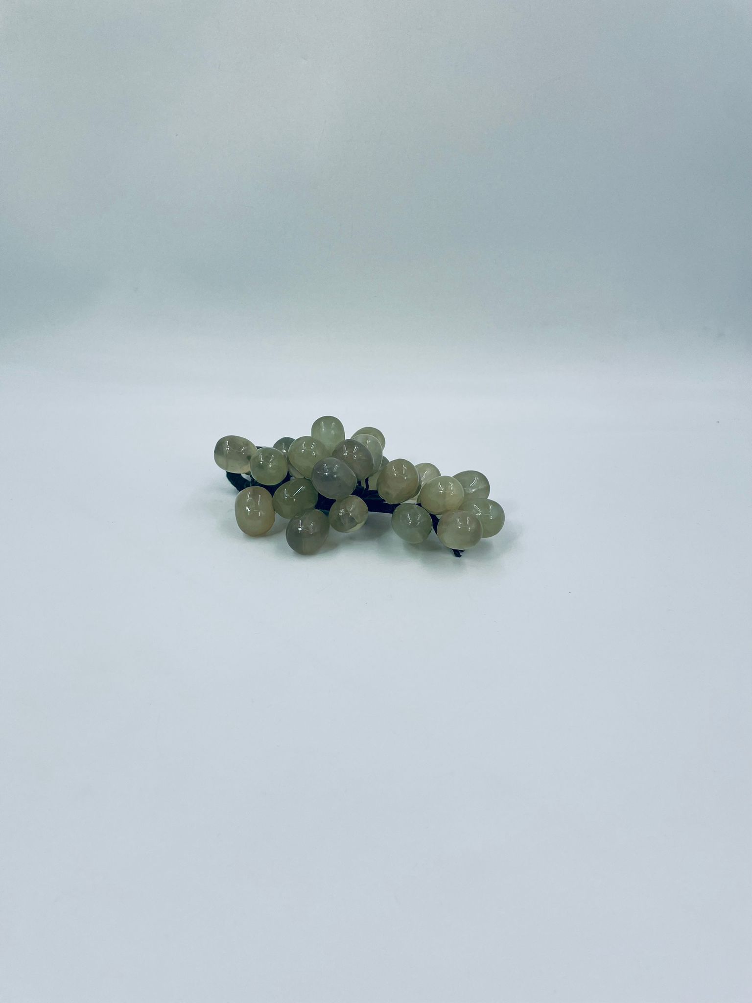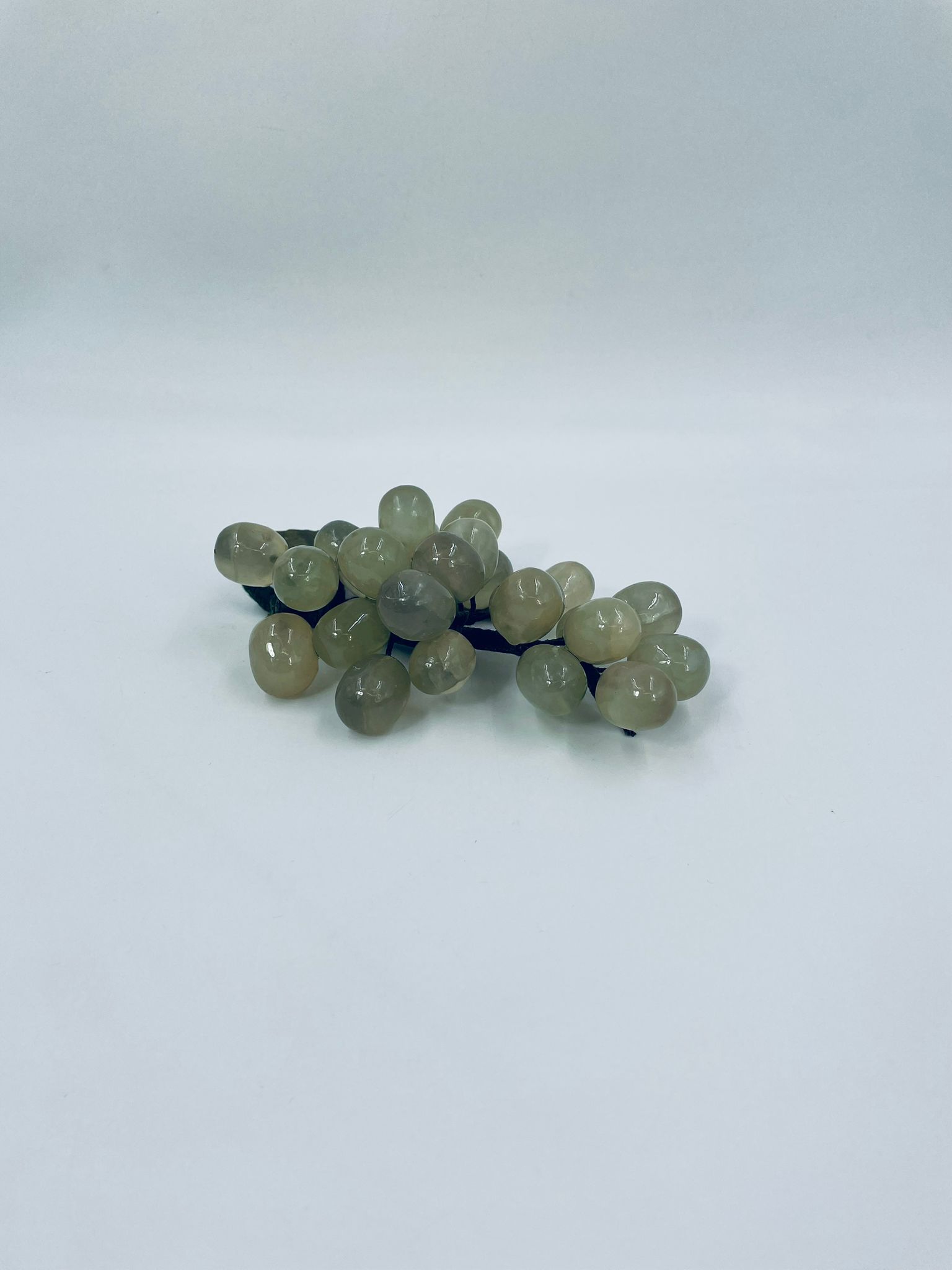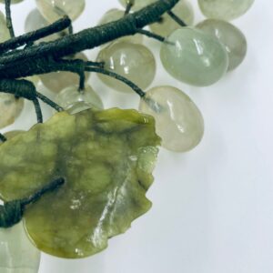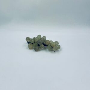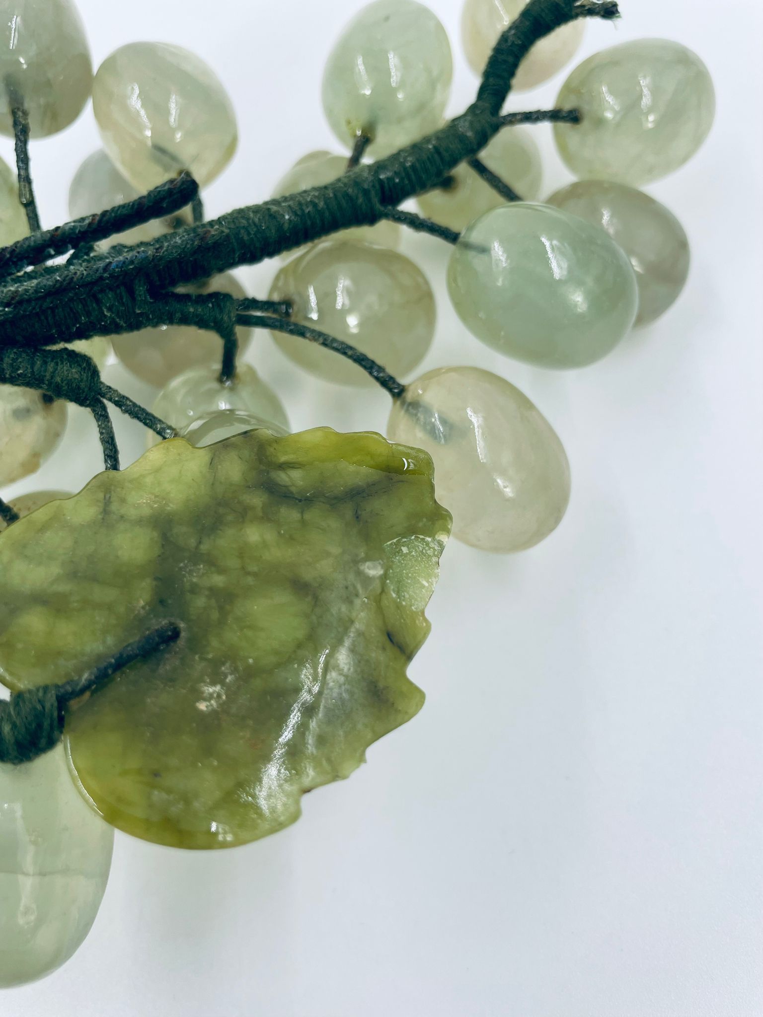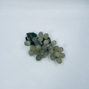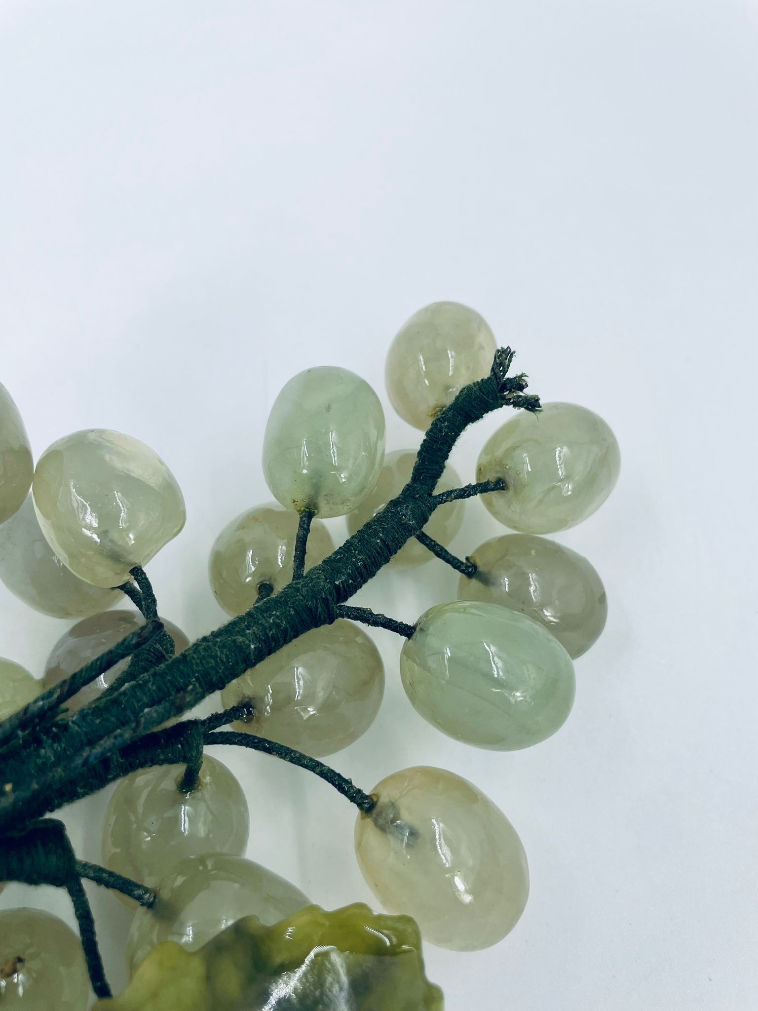 Vintage style grape bunch on a stem with leaves, made from jade. The figurine is handmade and stained green. It has a small damage to the leaf.