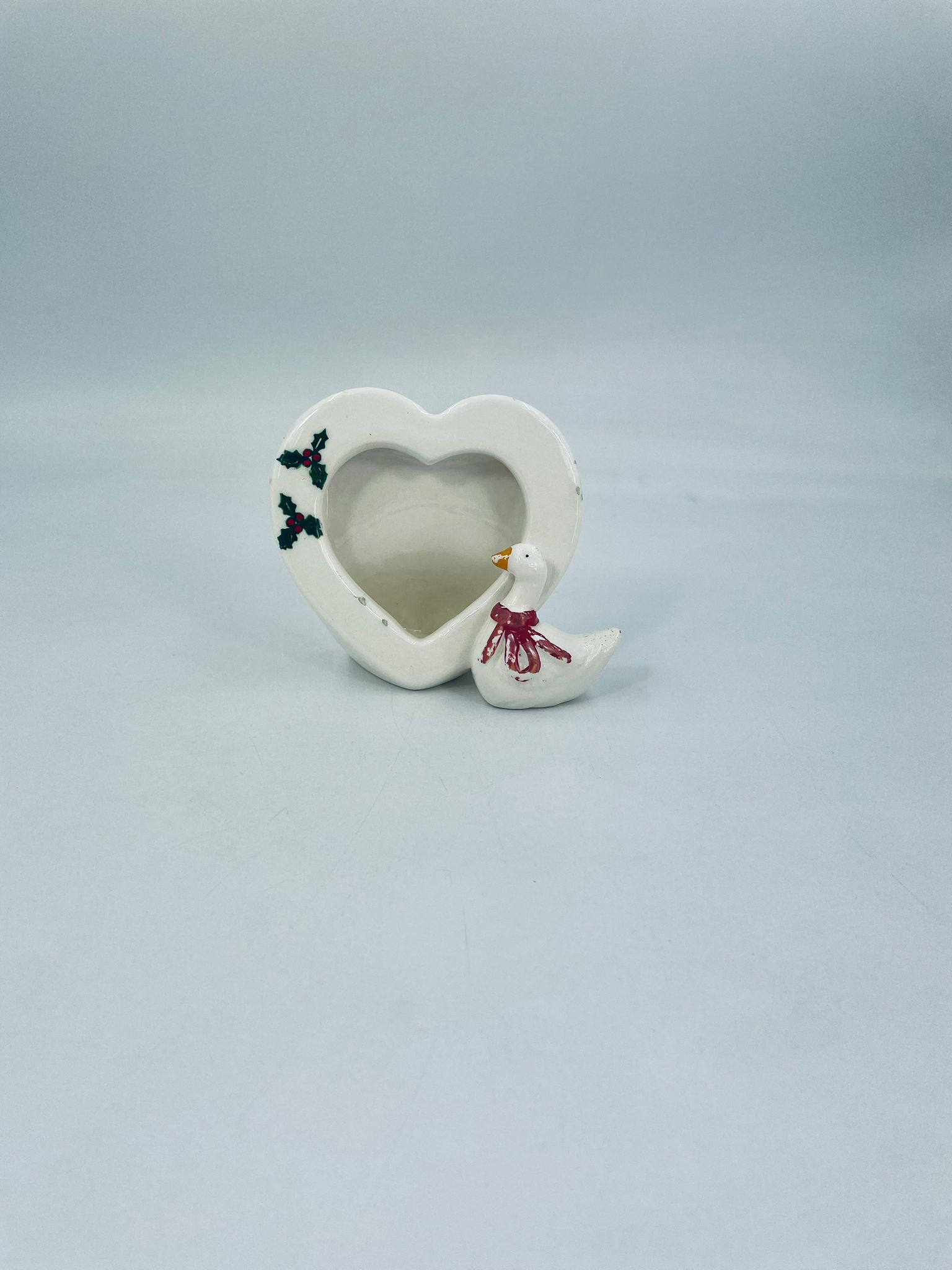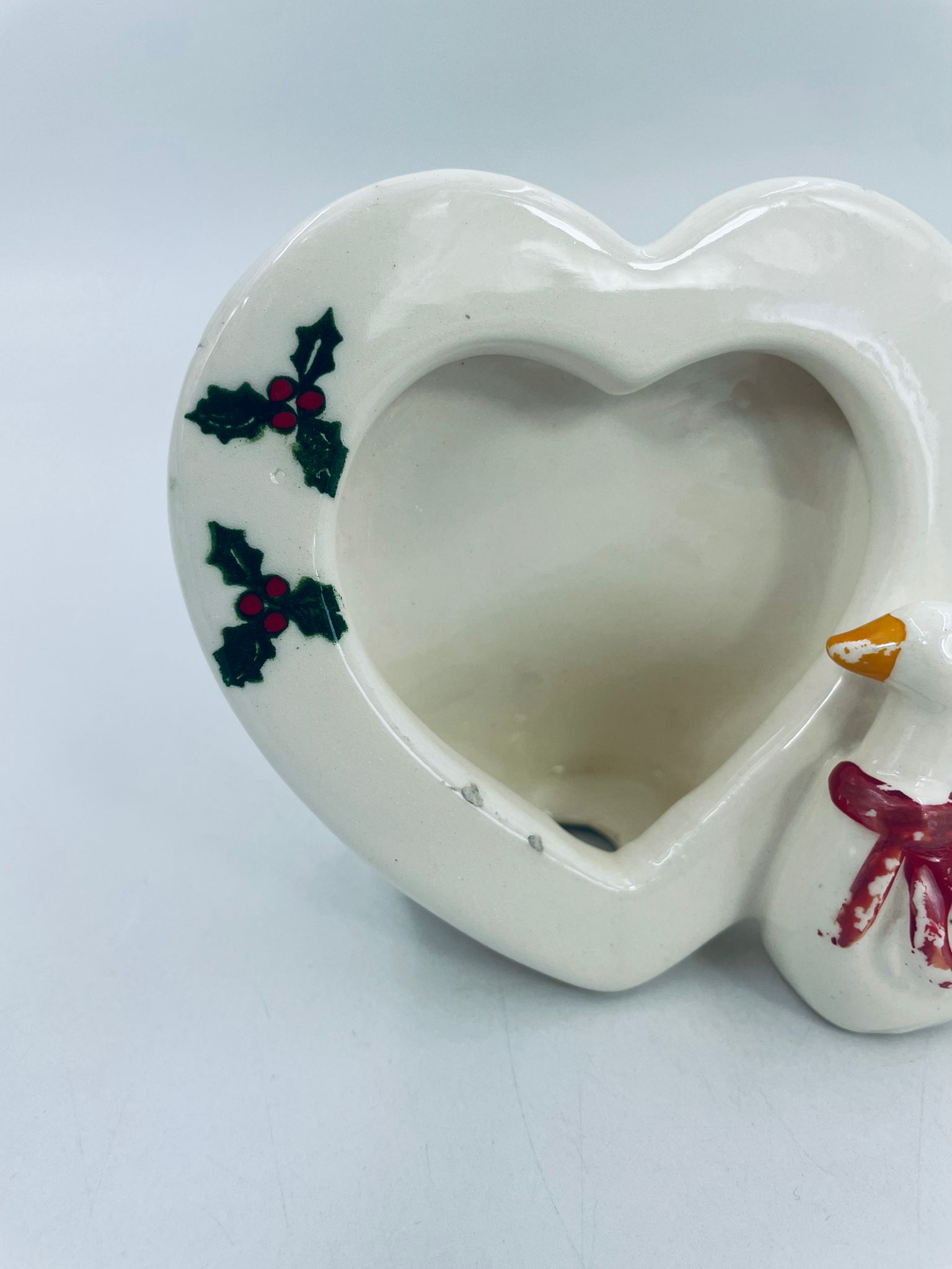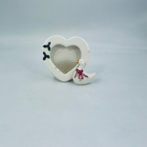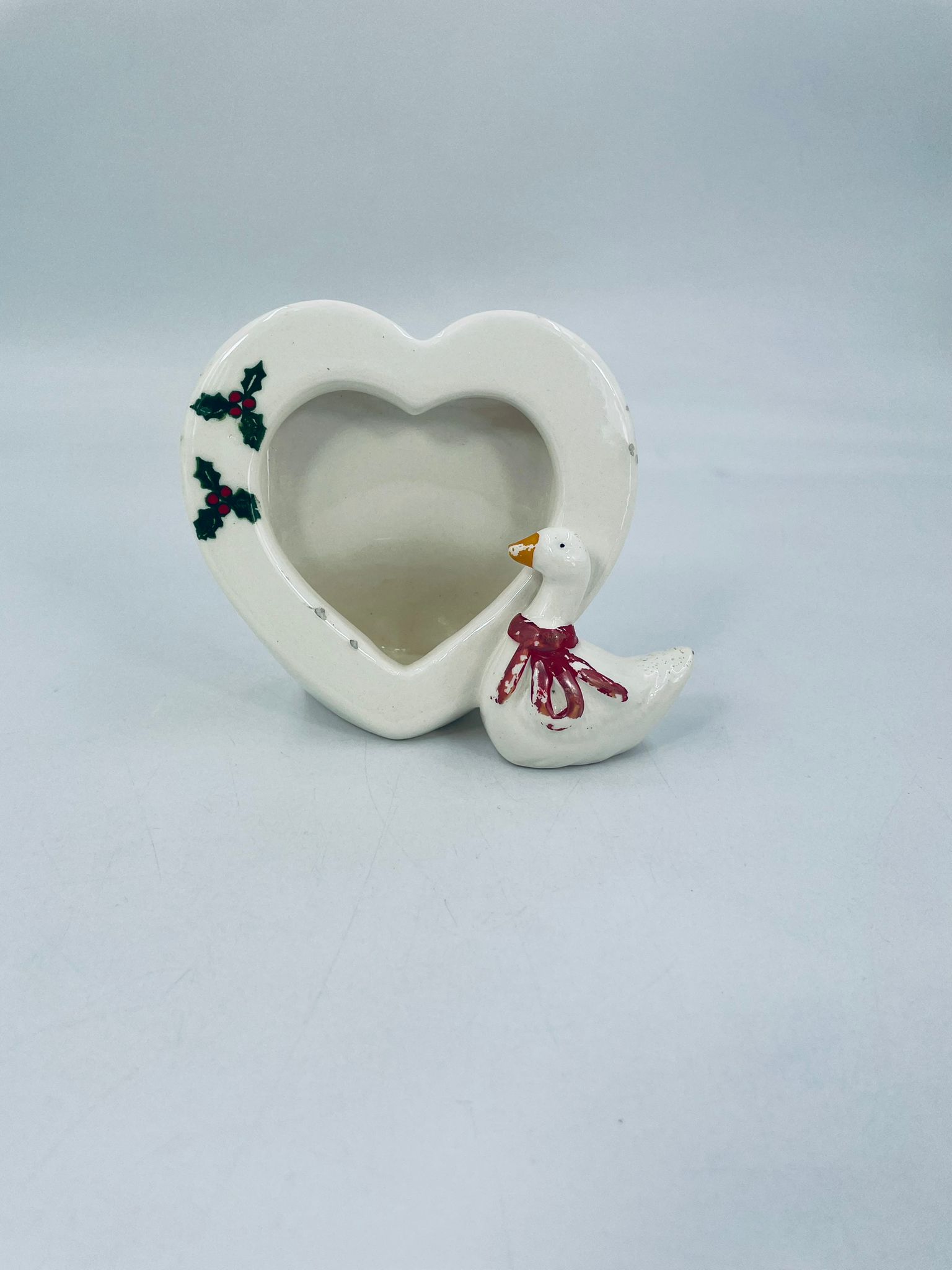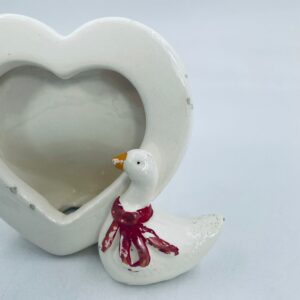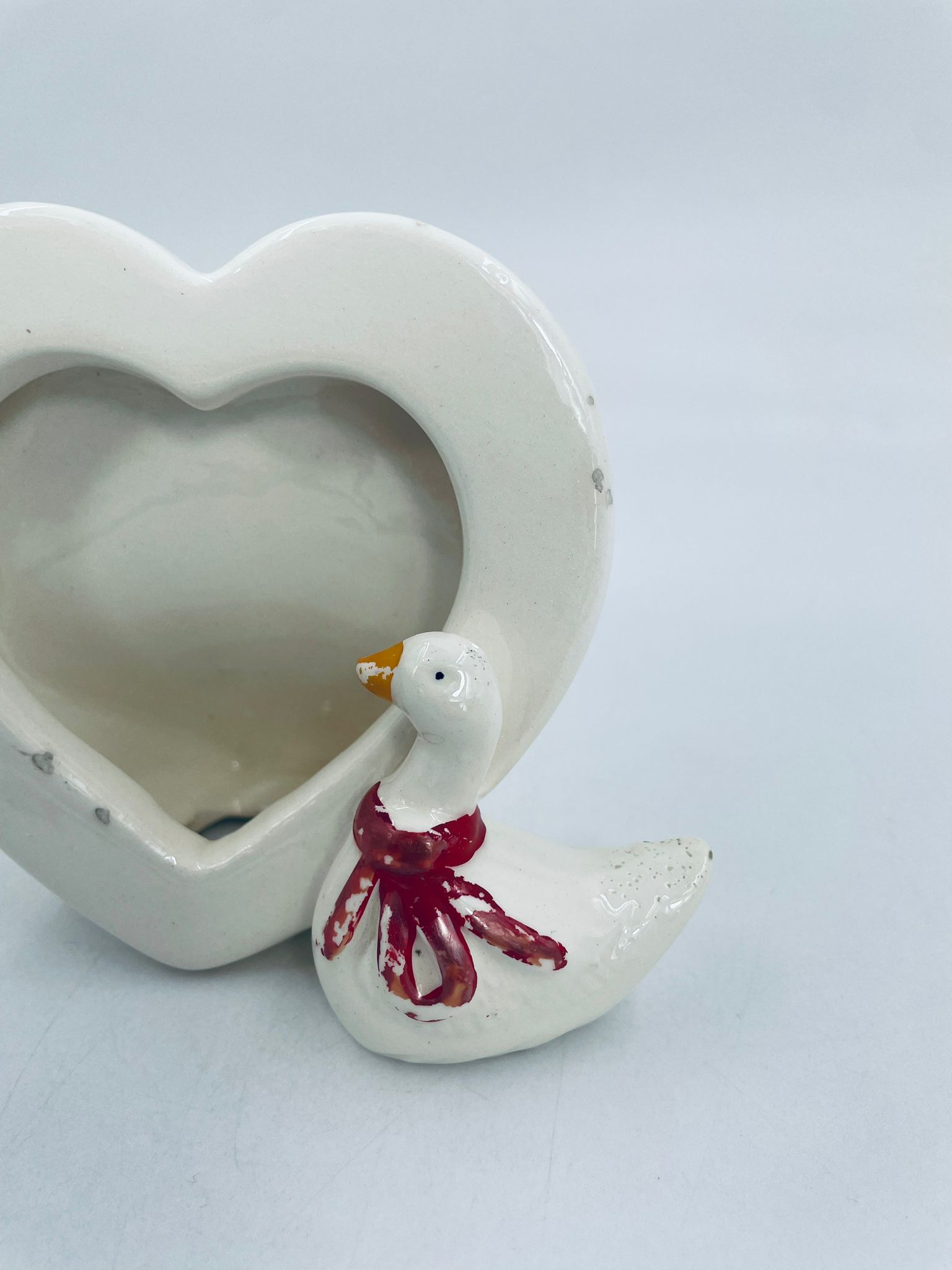 Photo frame with little duck figure, with bow. Heart-shaped opening for a photo. Ceramic frame in white with decoration on the rim. It has minor chipping and rubbing on the bow.