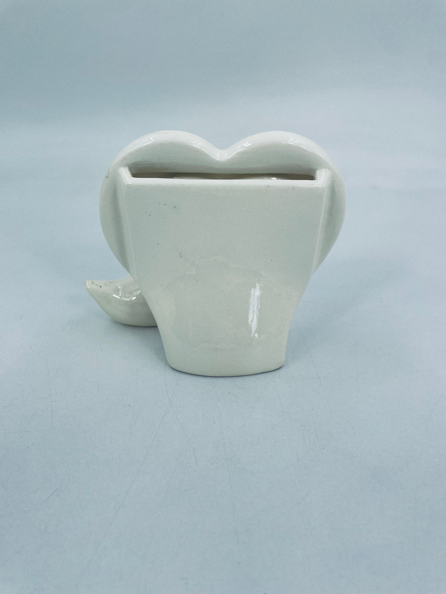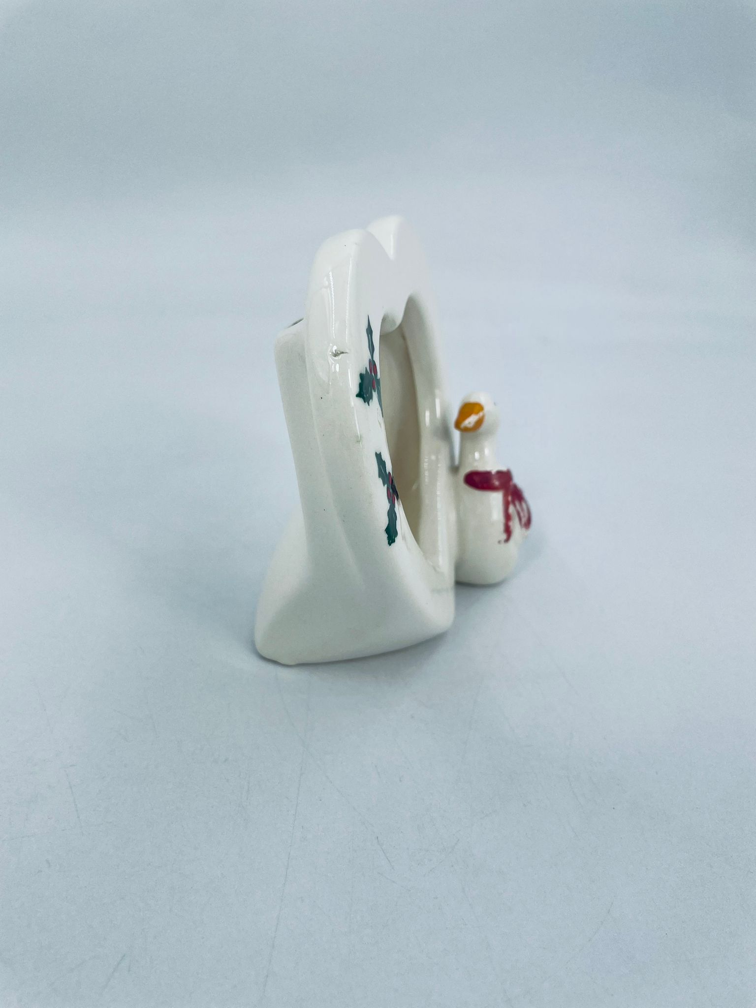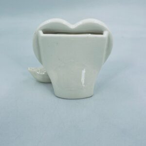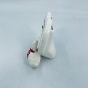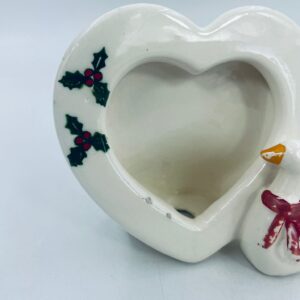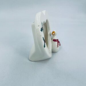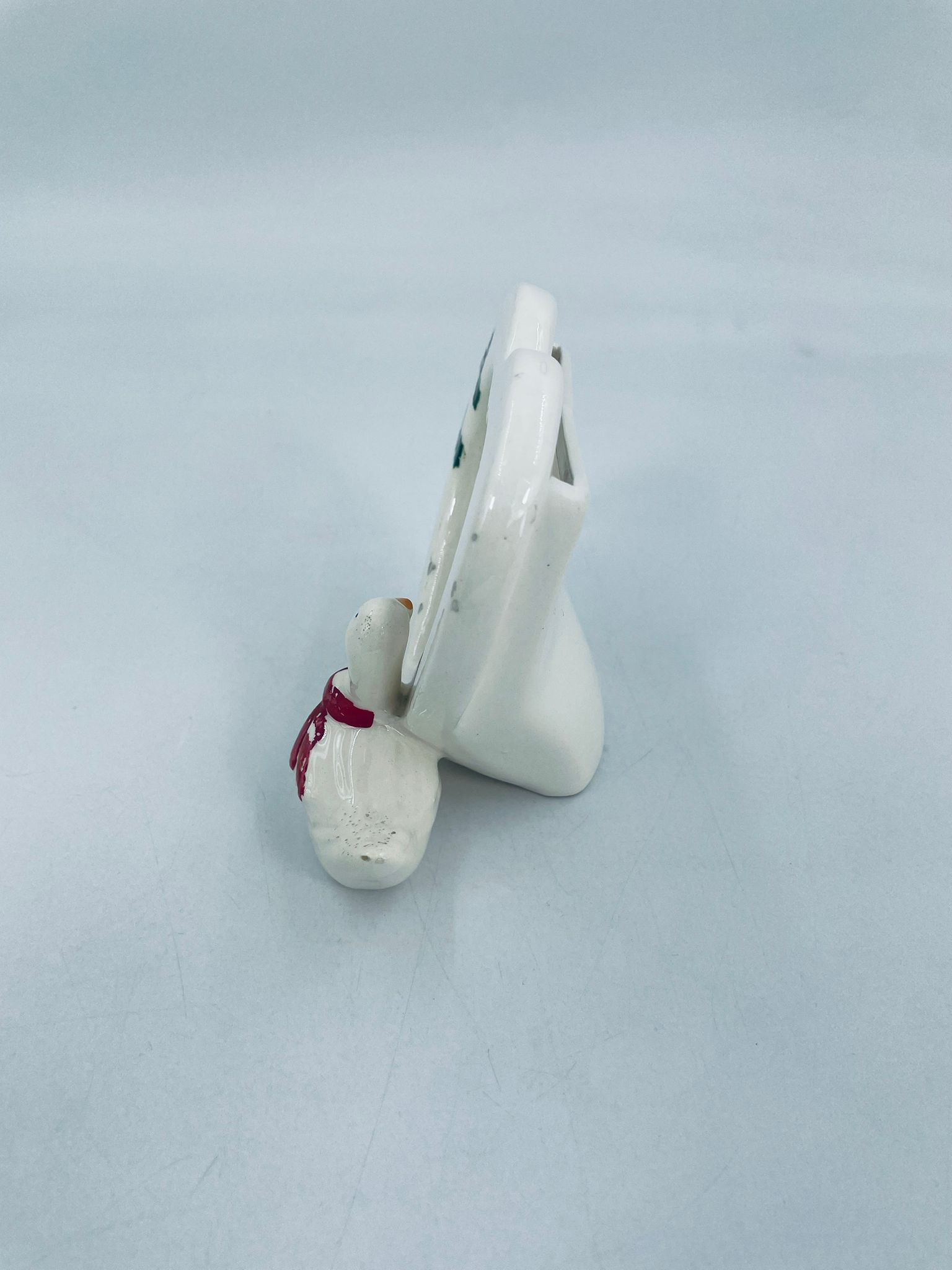 Photo frame with little duck figure, with bow. Heart-shaped opening for a photo. Ceramic frame in white with decoration on the rim. It has minor chipping and rubbing on the bow.