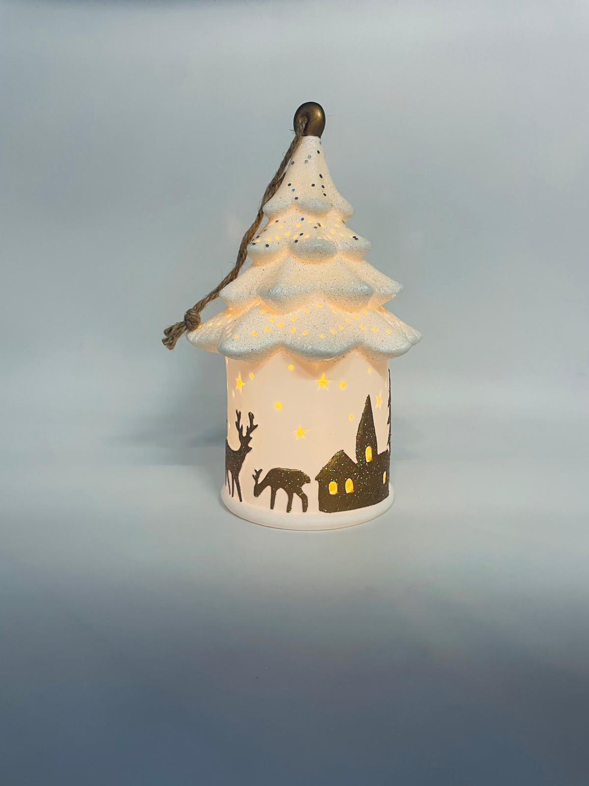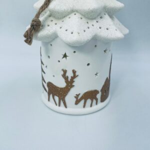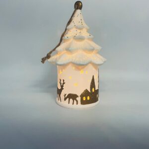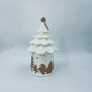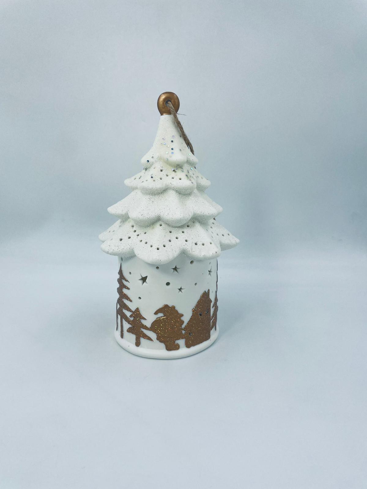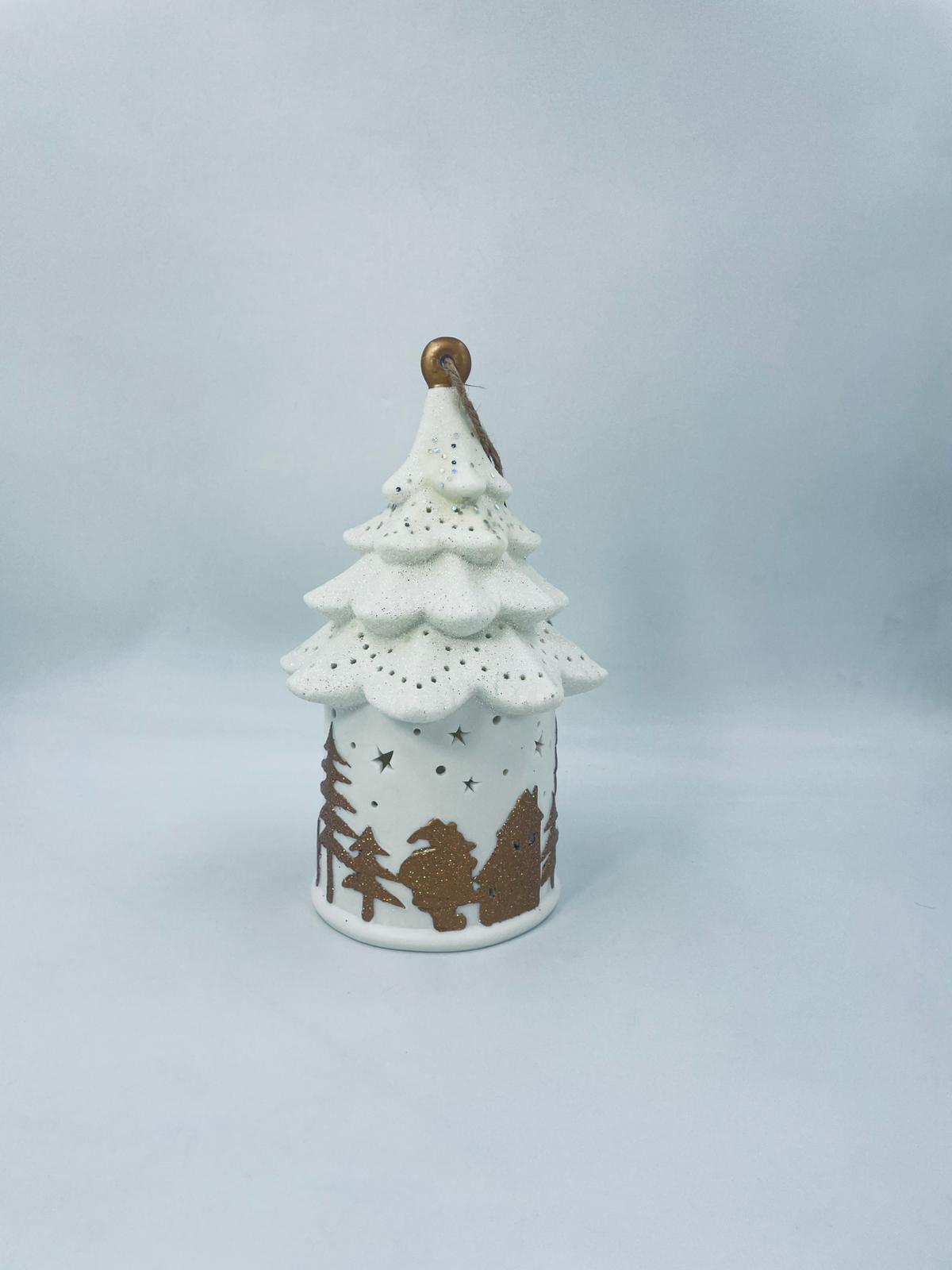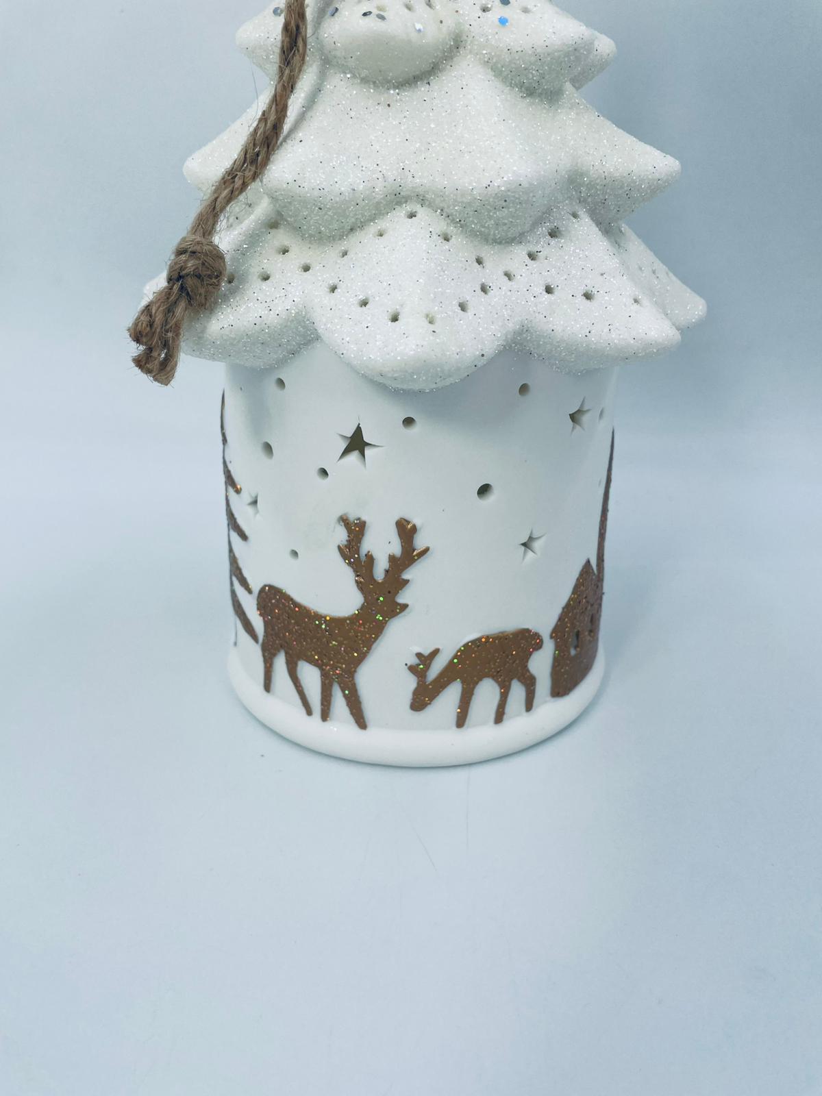 Lampion świąteczny w stylu Vintage, wykonany z wysokiej jakości białej porcelany. Lampion w kształcie choinki z możliwością powieszenia, ozdobiony złotymi, brokatowymi stlwetkami drzew, reniferów i mikołaja. Lampion oświetlany.