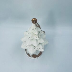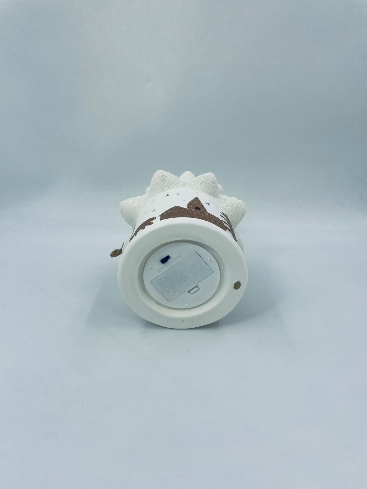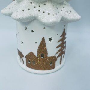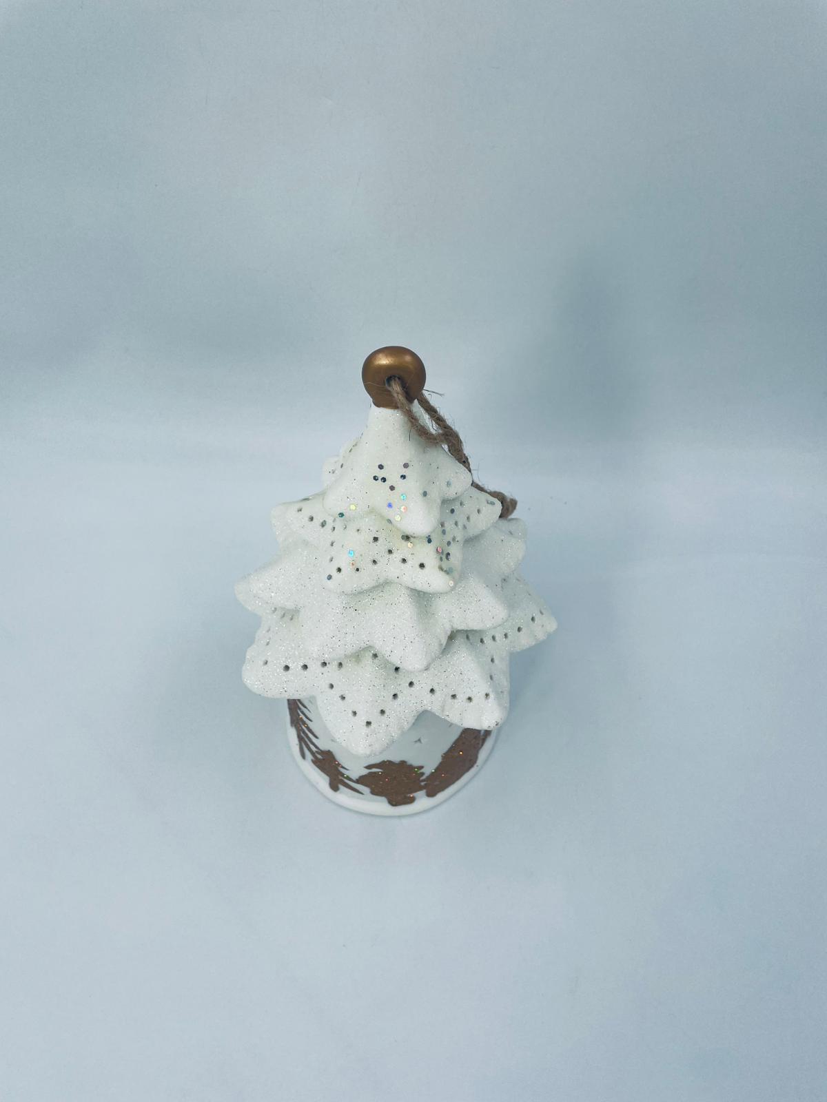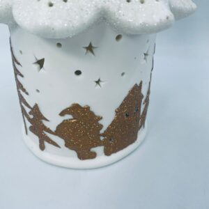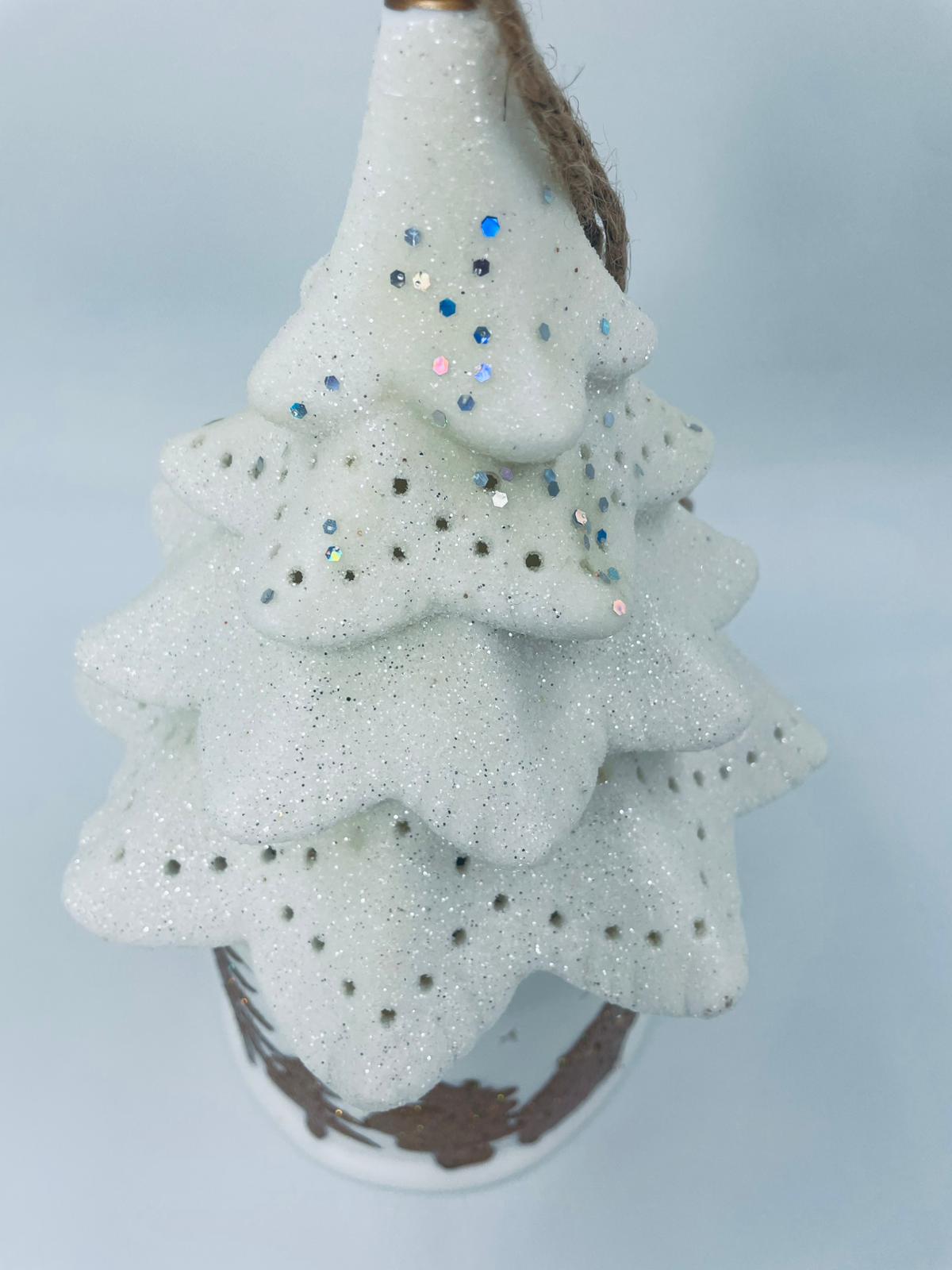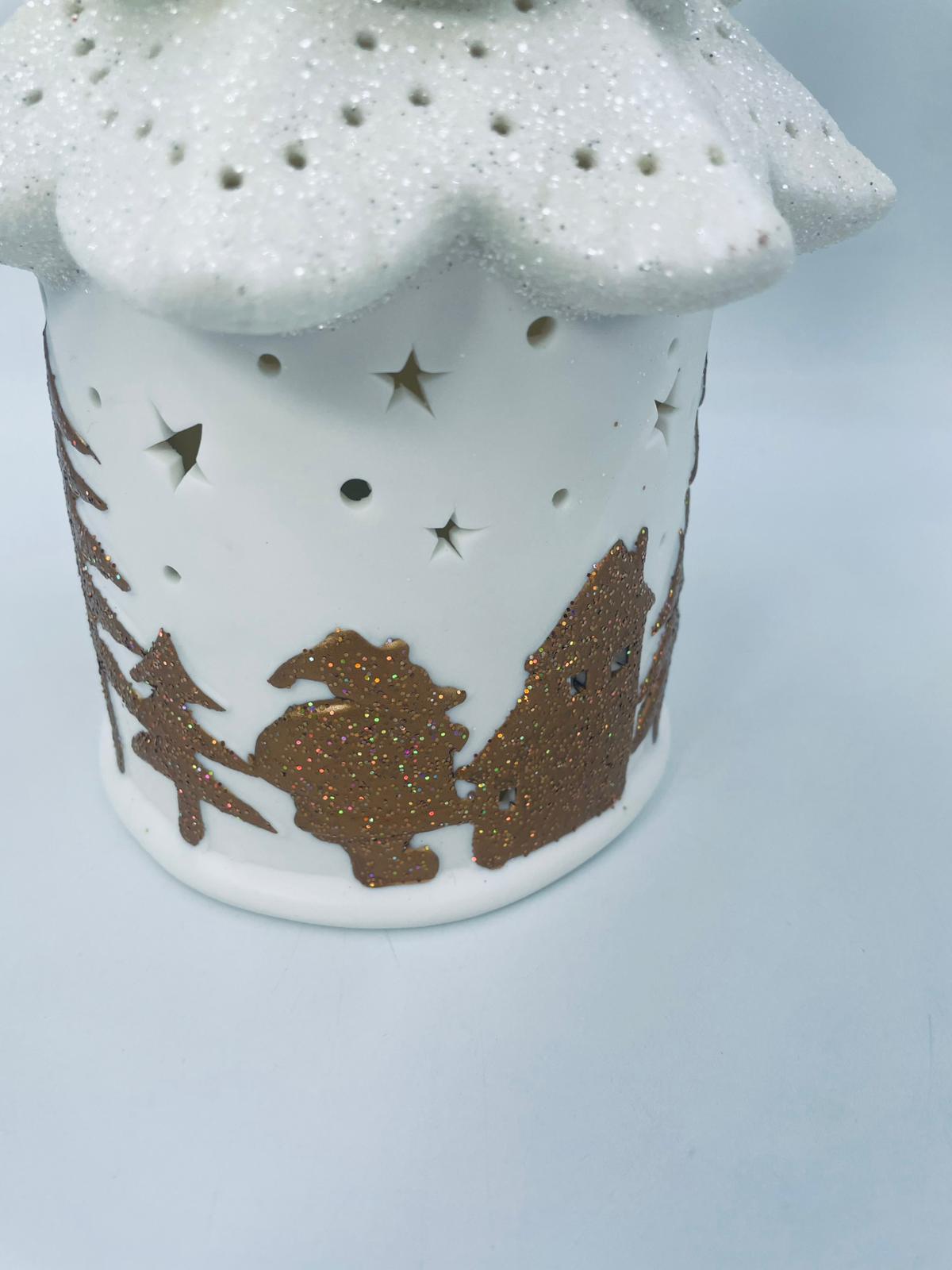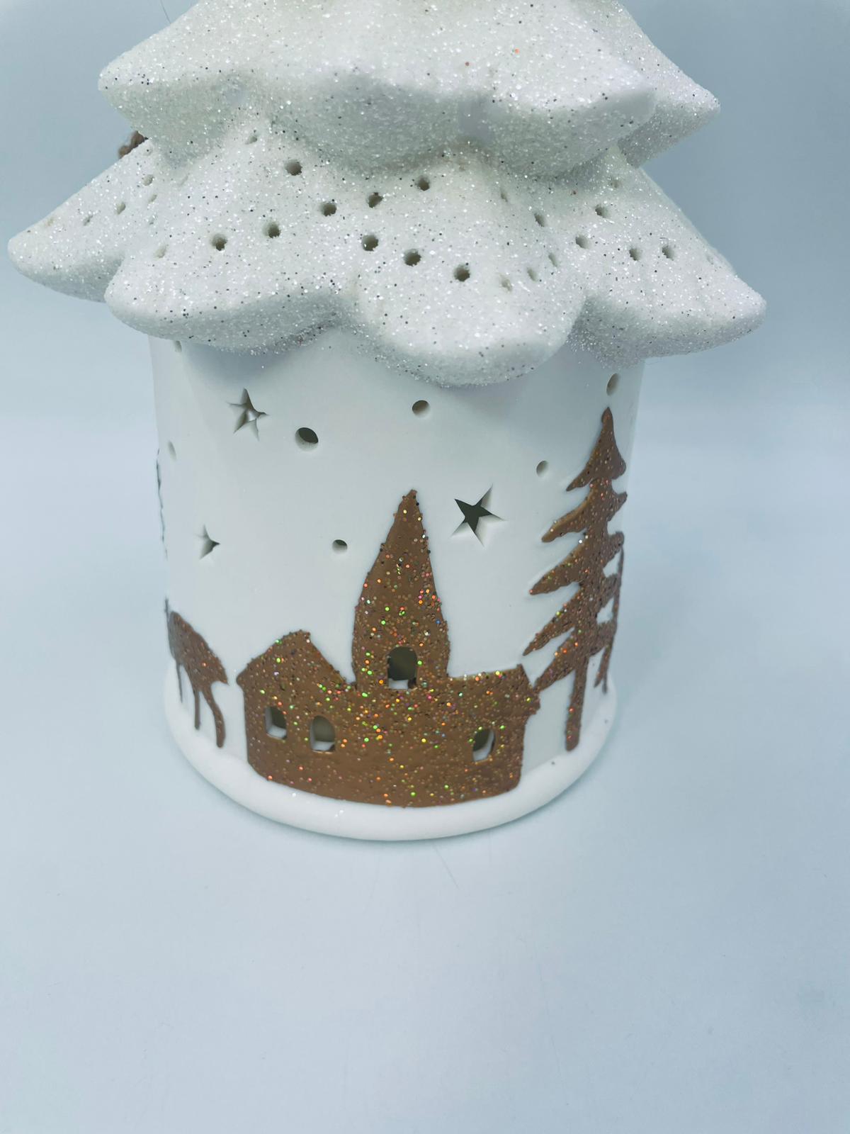 Lampion świąteczny w stylu Vintage, wykonany z wysokiej jakości białej porcelany. Lampion w kształcie choinki z możliwością powieszenia, ozdobiony złotymi, brokatowymi stlwetkami drzew, reniferów i mikołaja. Lampion oświetlany.