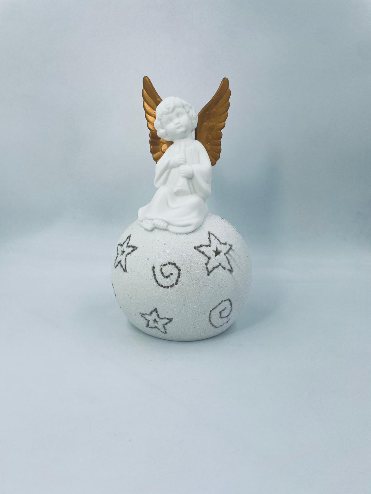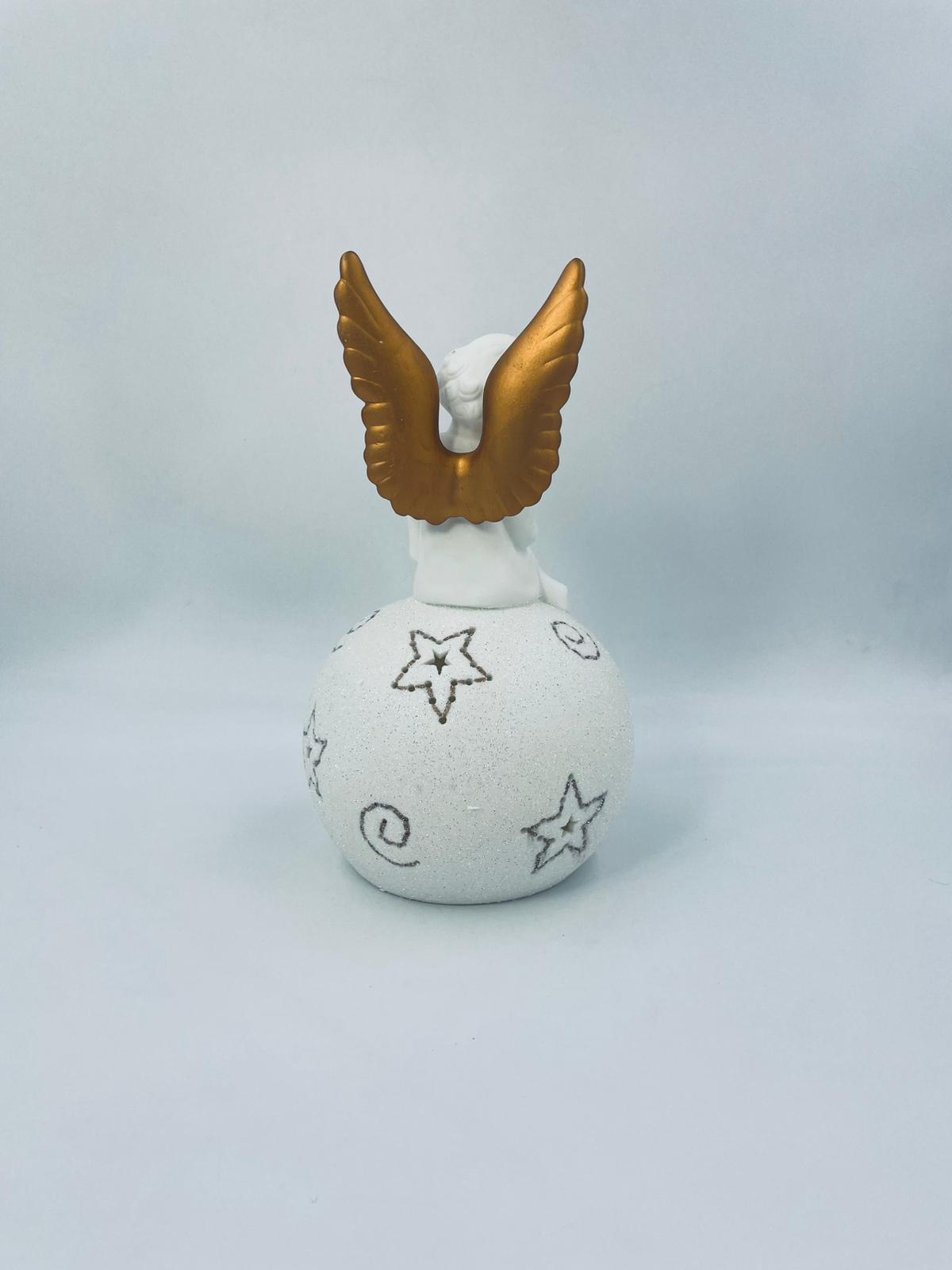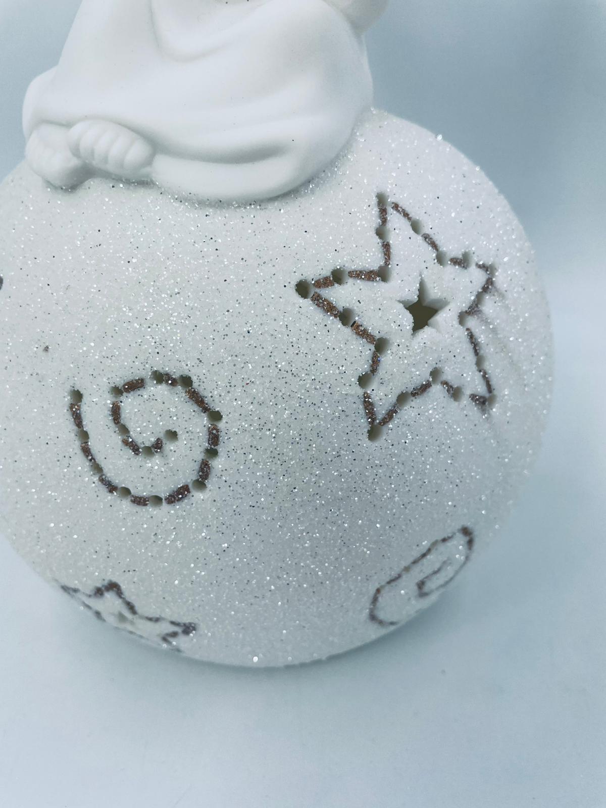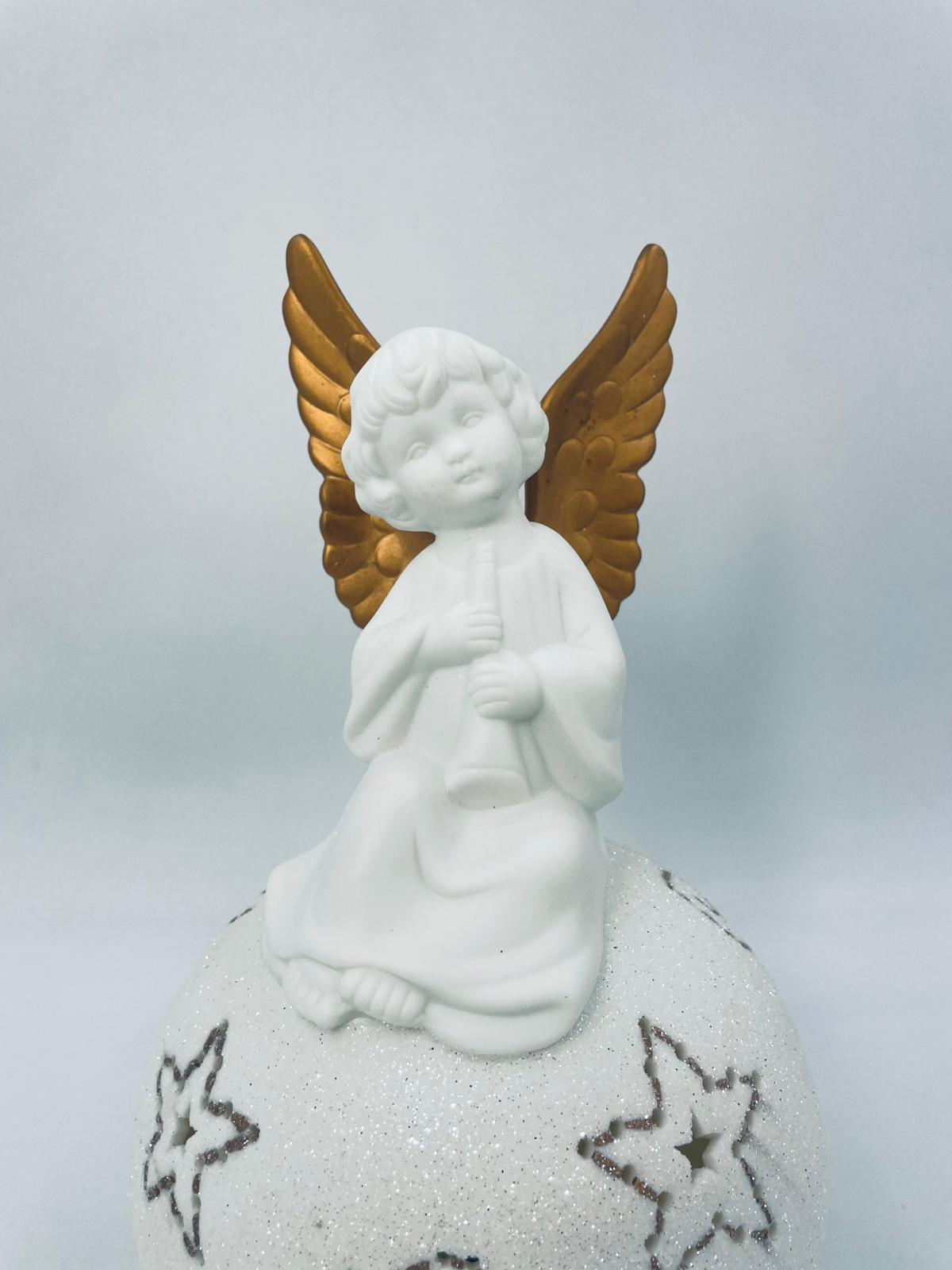 Vintage-style Christmas lantern made of high-quality white porcelain. The lantern is shaped like a ball with a figurine of an angel with golden wings on top. The ball is covered with glitter.