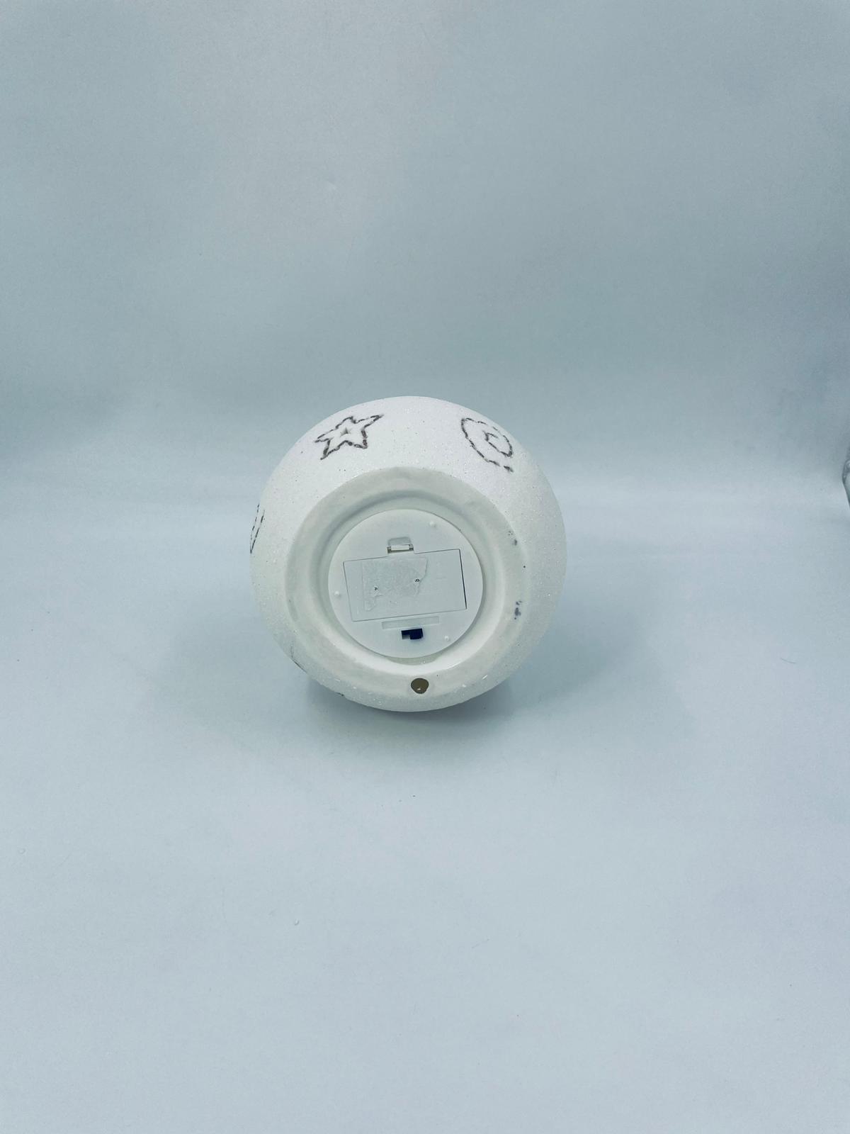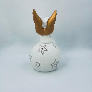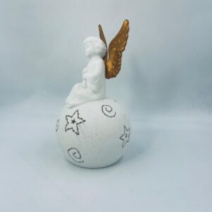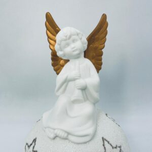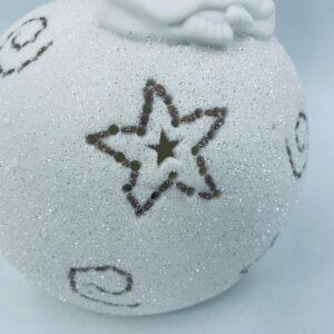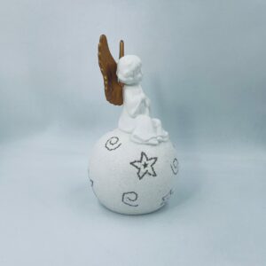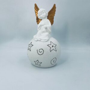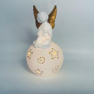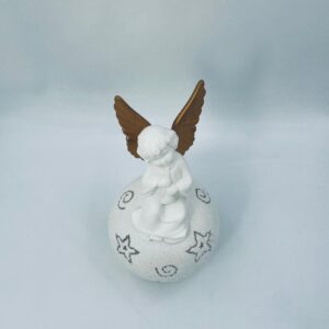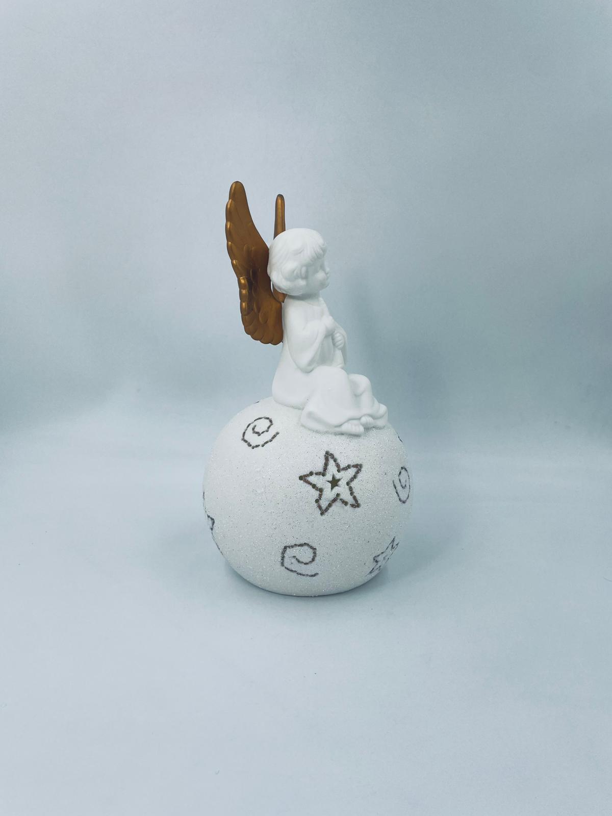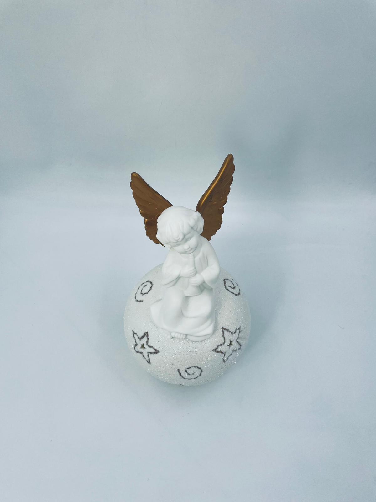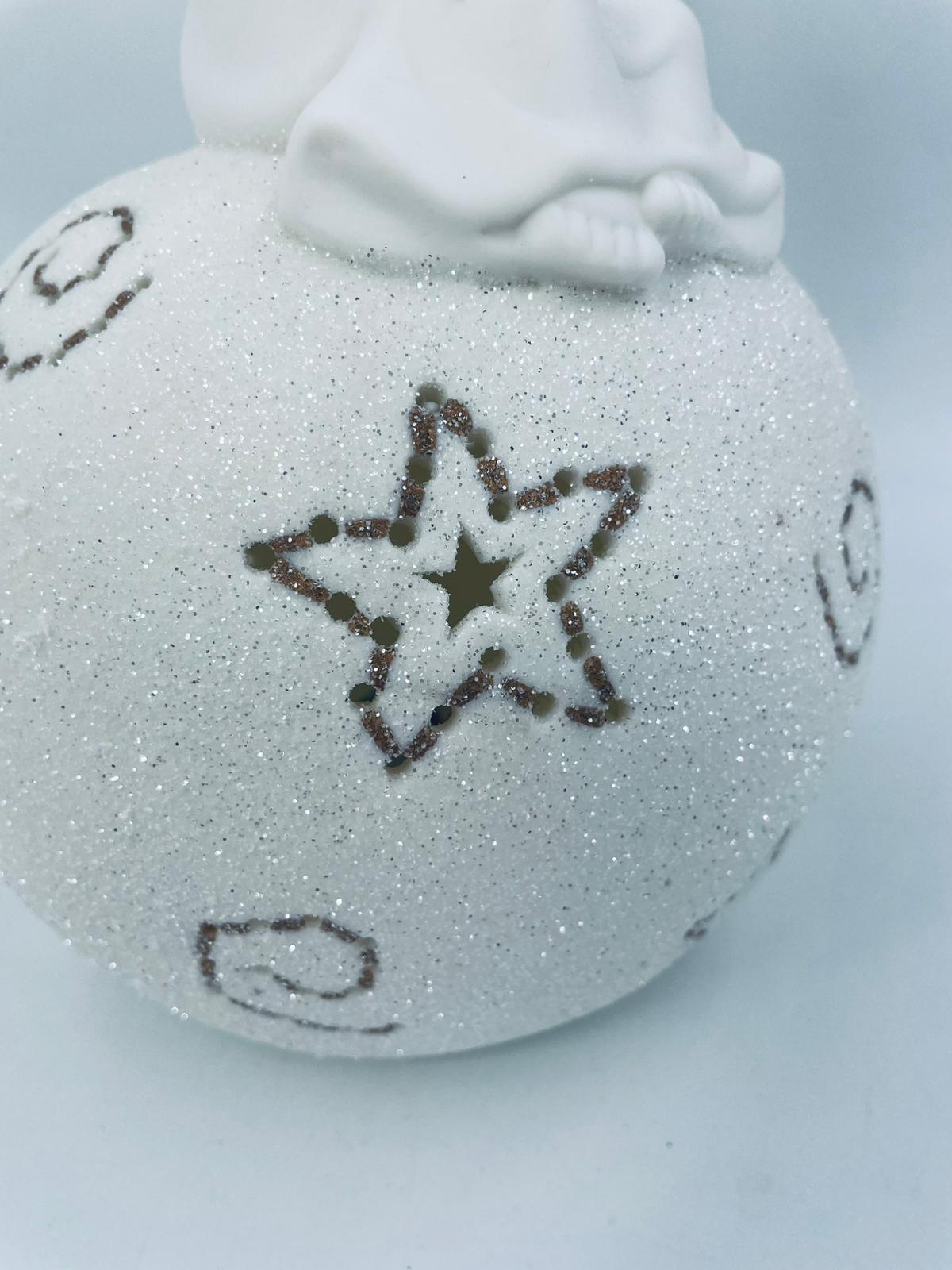 Vintage-style Christmas lantern made of high-quality white porcelain. The lantern is shaped like a ball with a figurine of an angel with golden wings on top. The ball is covered with glitter.