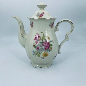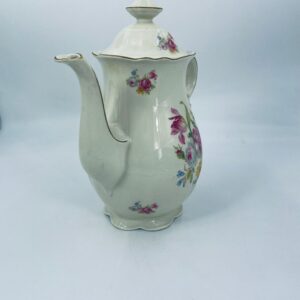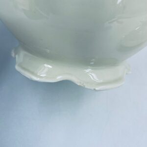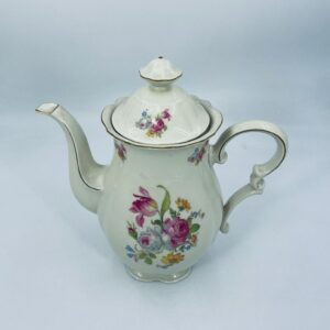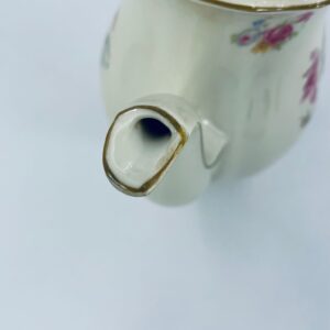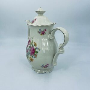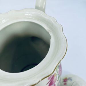 Jug made of old porcelain in ivory colour. The teapot with subtle wavy decoration on the top rim and base, with a beautiful decorative handle and floral design. The teapot has damage to the lid, the centre of the top and damage to the base.