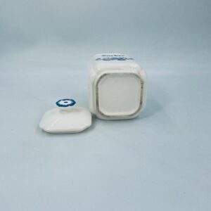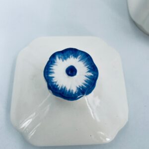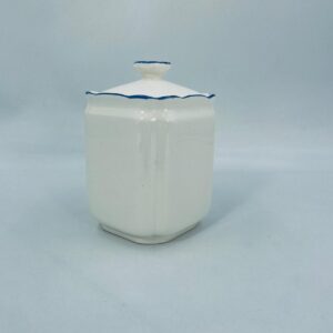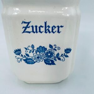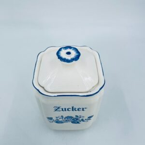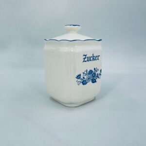 A vintage-style kitchen container with a lid, made of ecru-coloured porcelain. The sugar container, decorated with a blue floral motif, has a wavy blue top edge and a decorative flower-shaped handle.