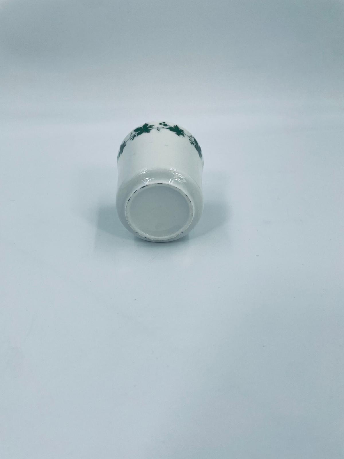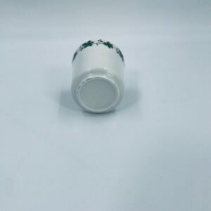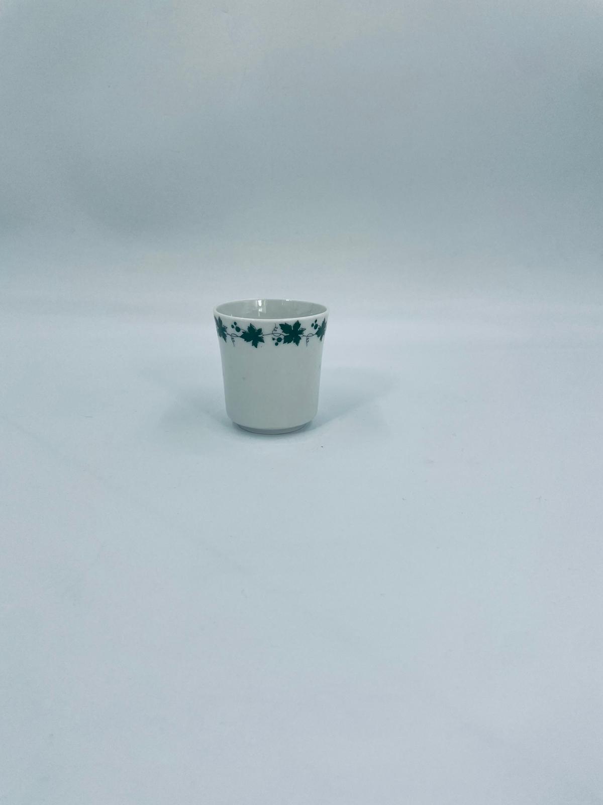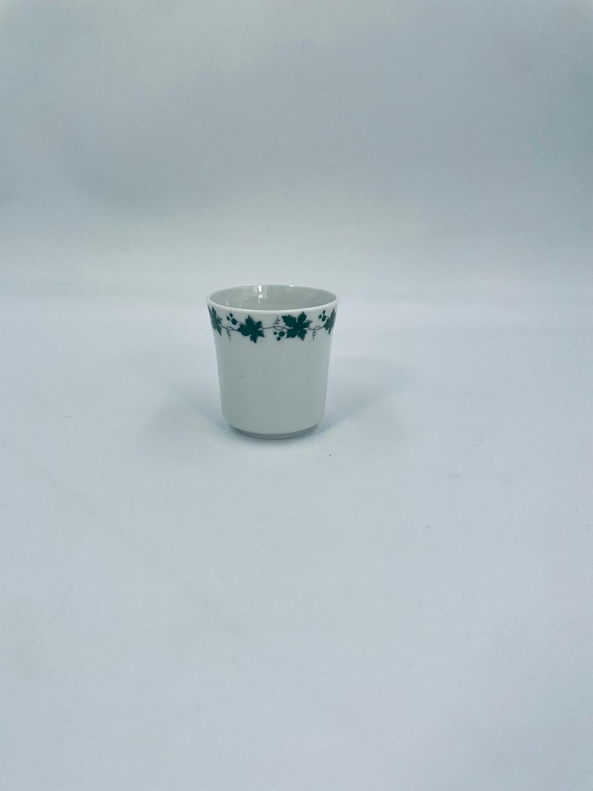 A small Vintage style mug, made of high quality white porcelain. It features a classic shape and an elegant decoration depicting green grape leaves entwining the top of the vessel.