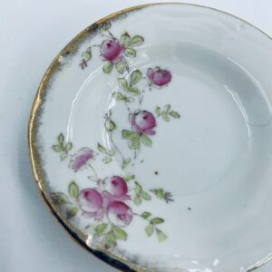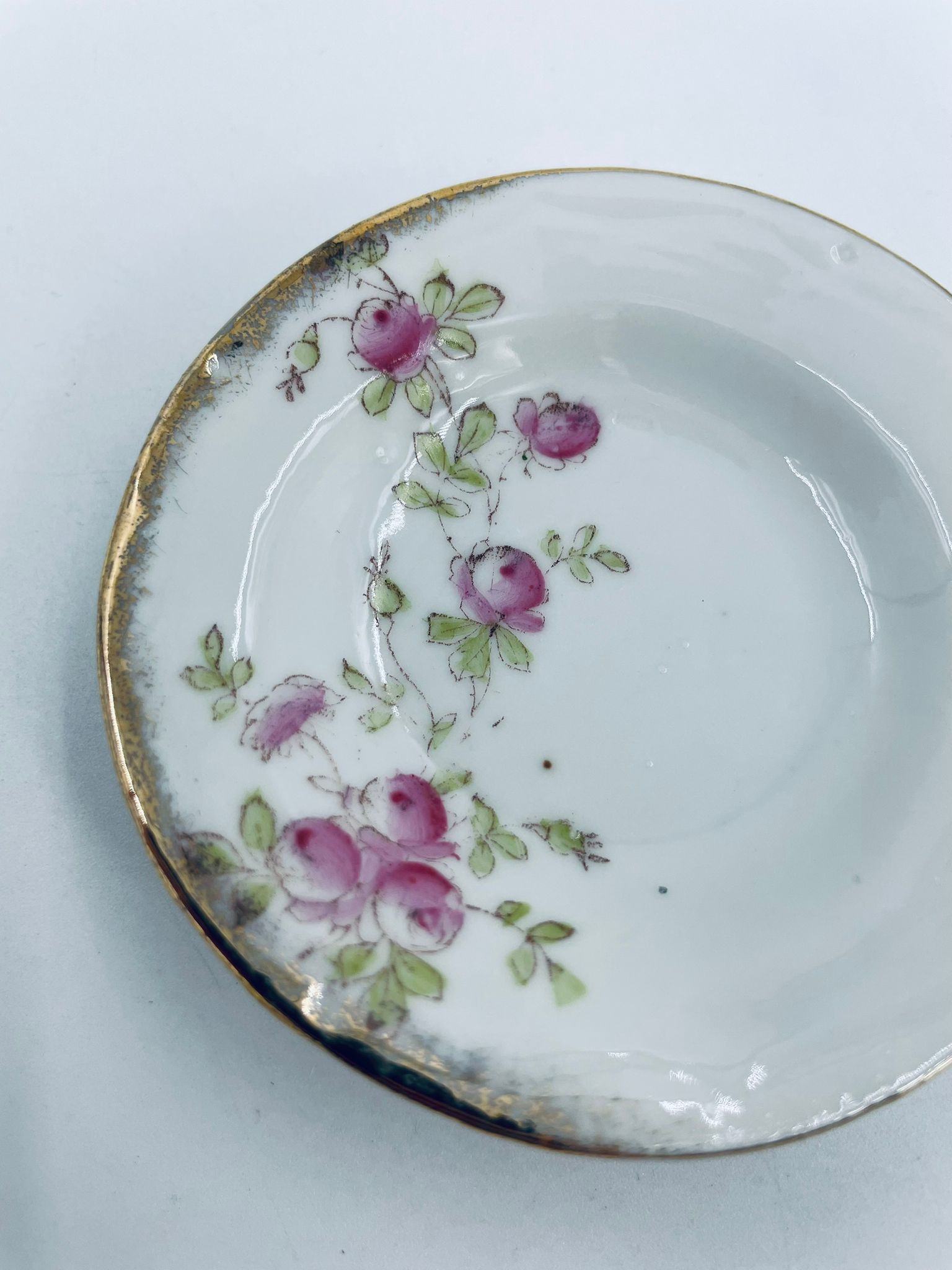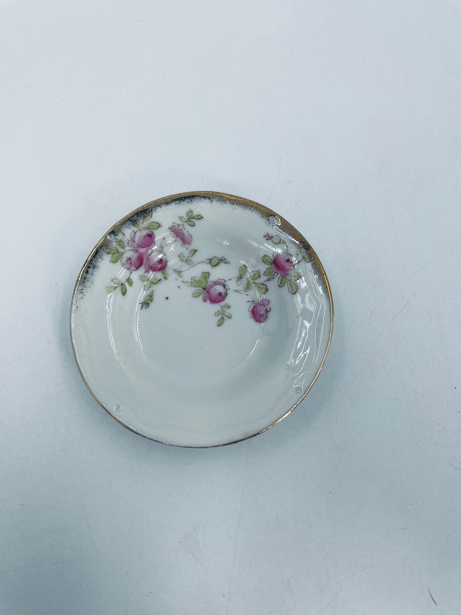 Porcelain cup saucer in white, characterised by a delicate motif of small pink flowers and gilding on the rims. Classic and refined porcelain combines decorative and functional qualities.