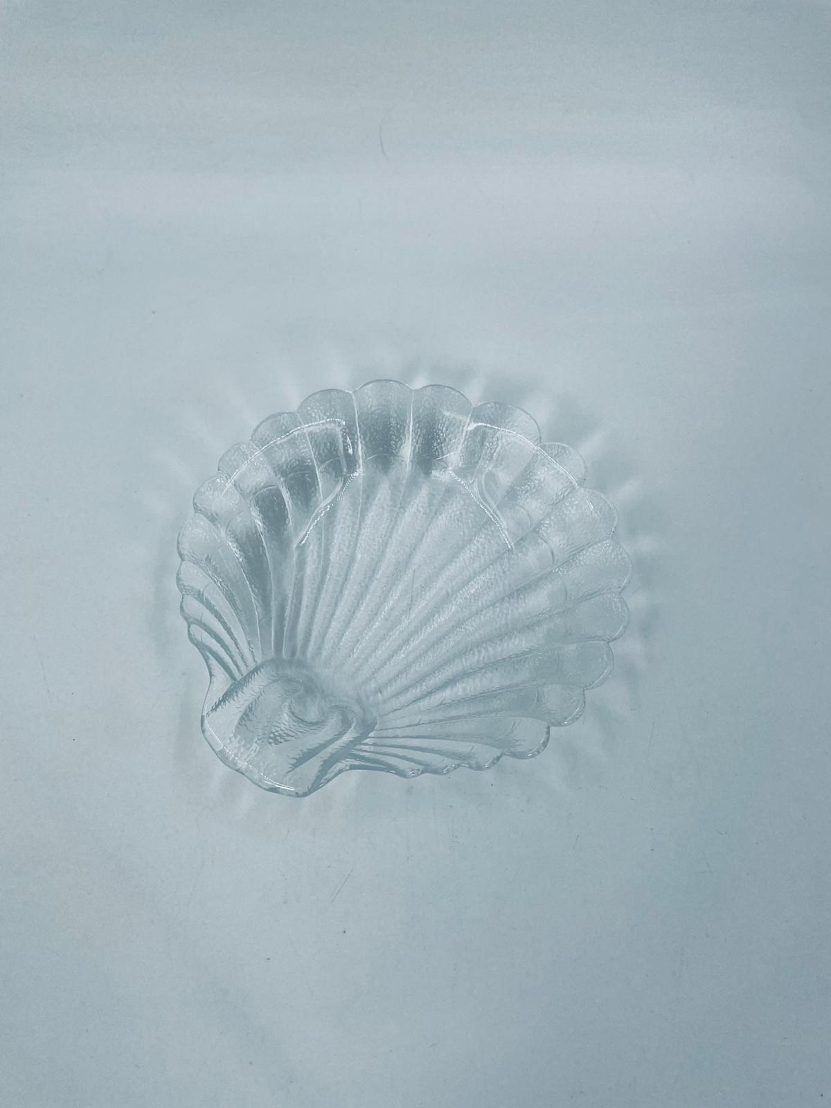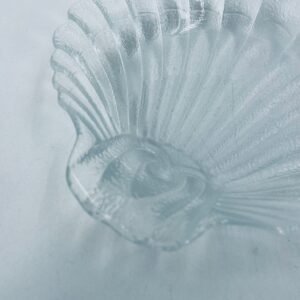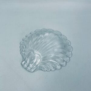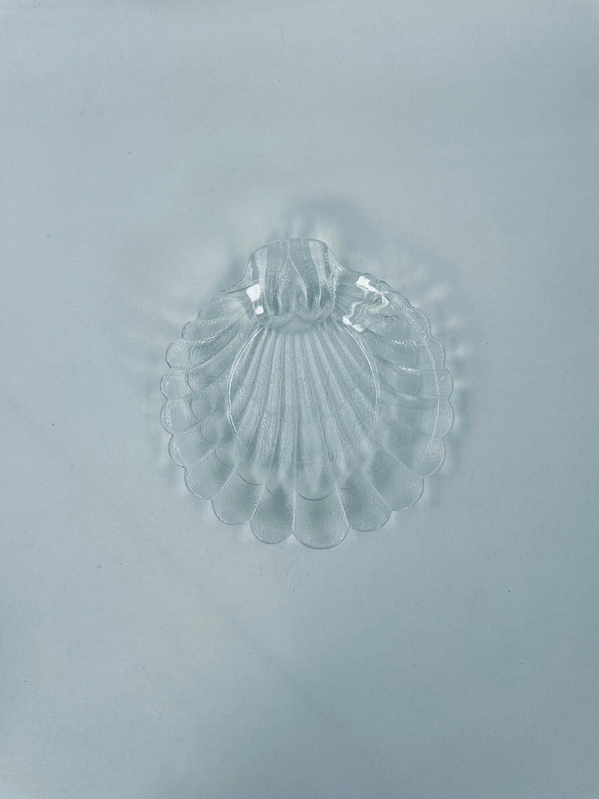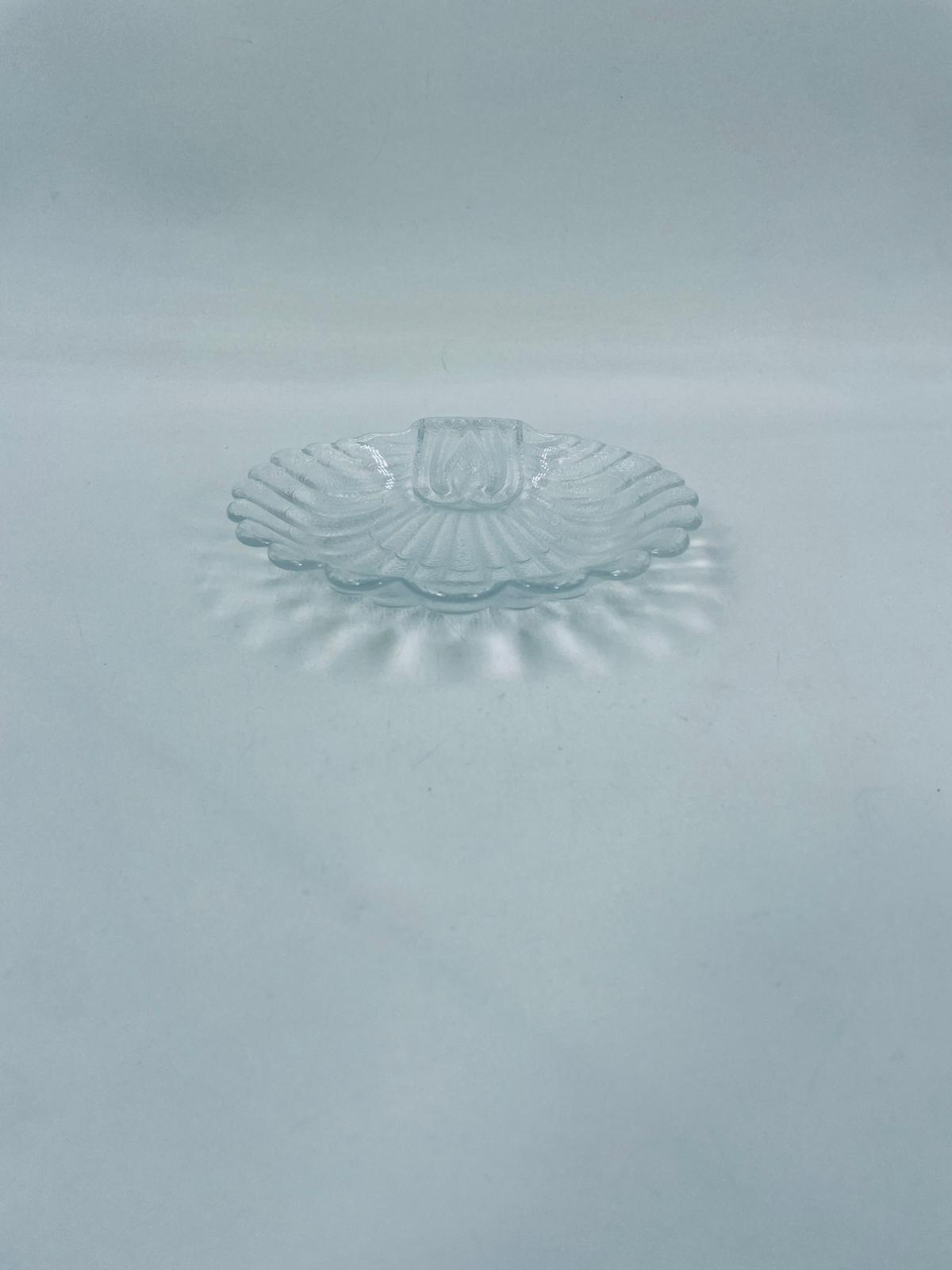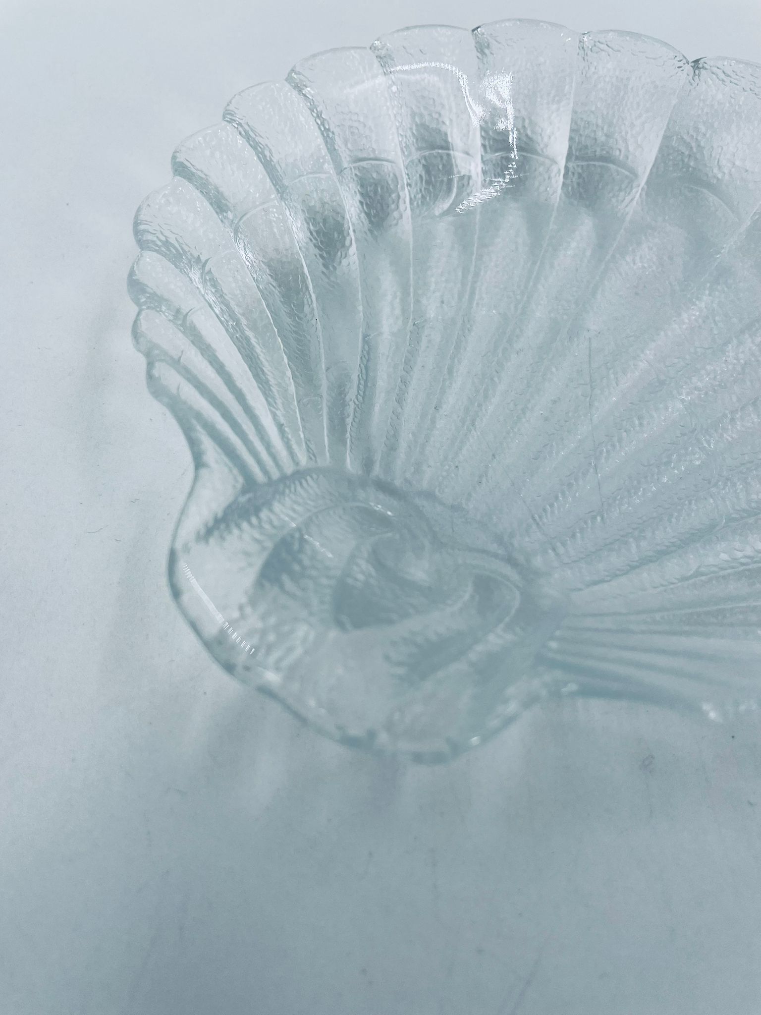 A vintage-style snack plate made of high-quality transparent glass. The plate is shaped like a scallop shell with a distinctive ribbed pattern resembling a shell.